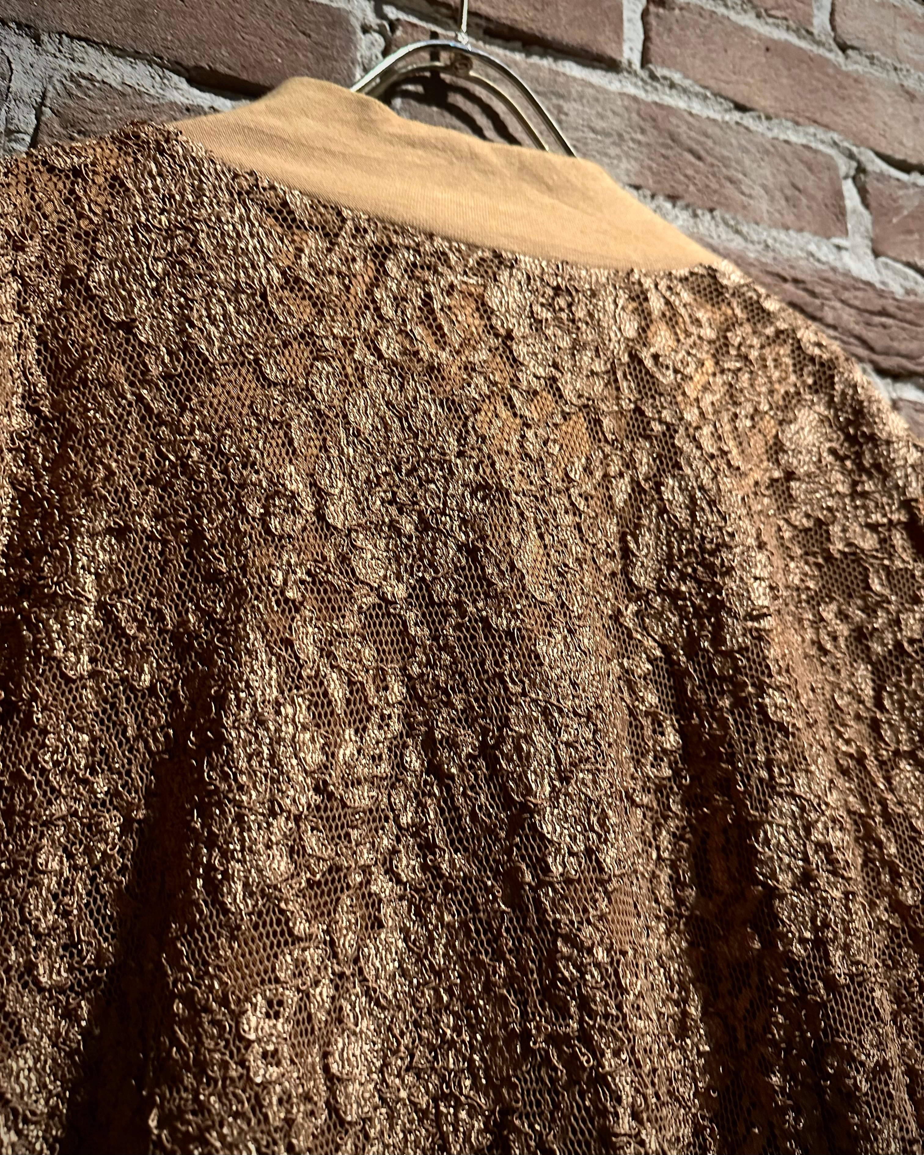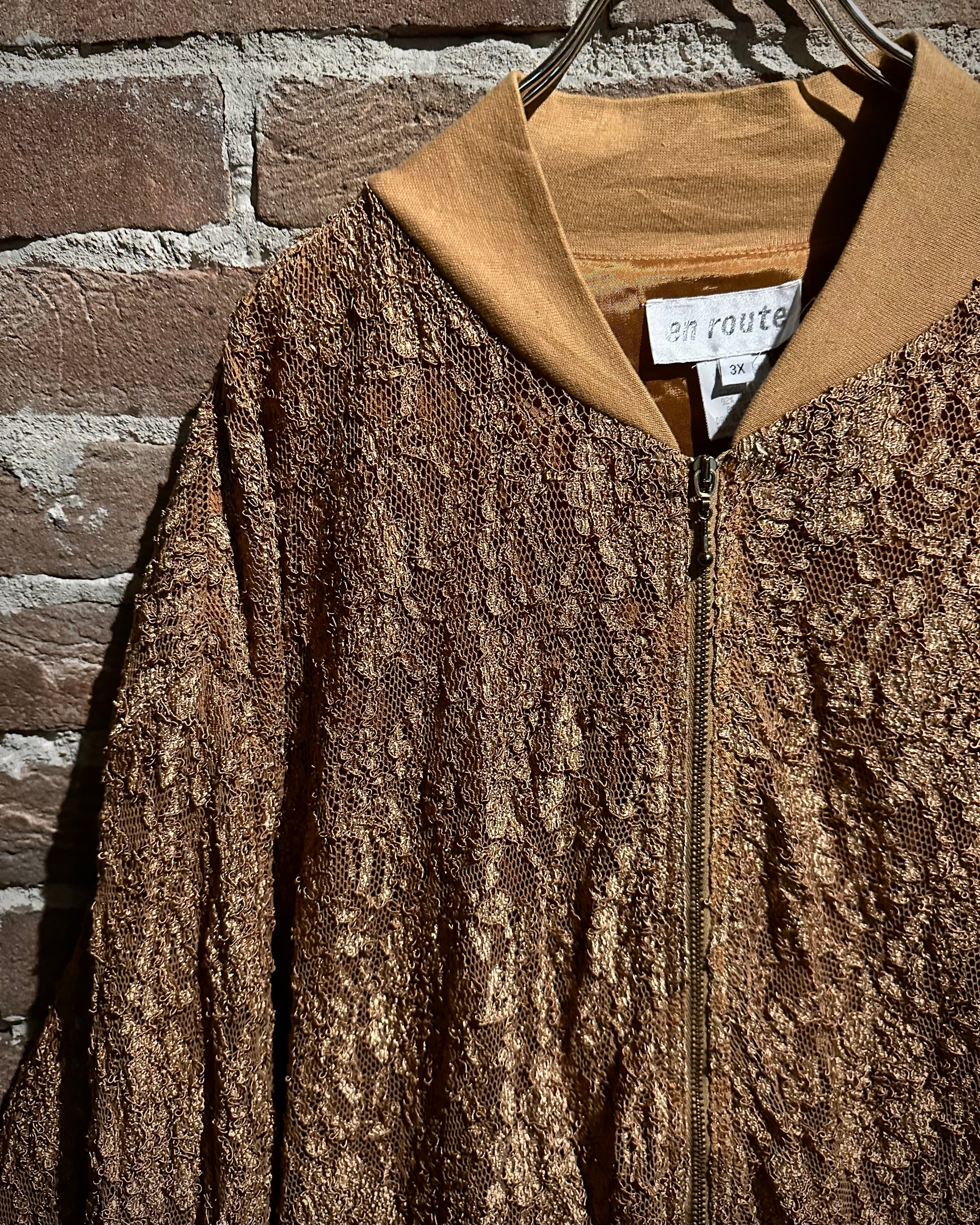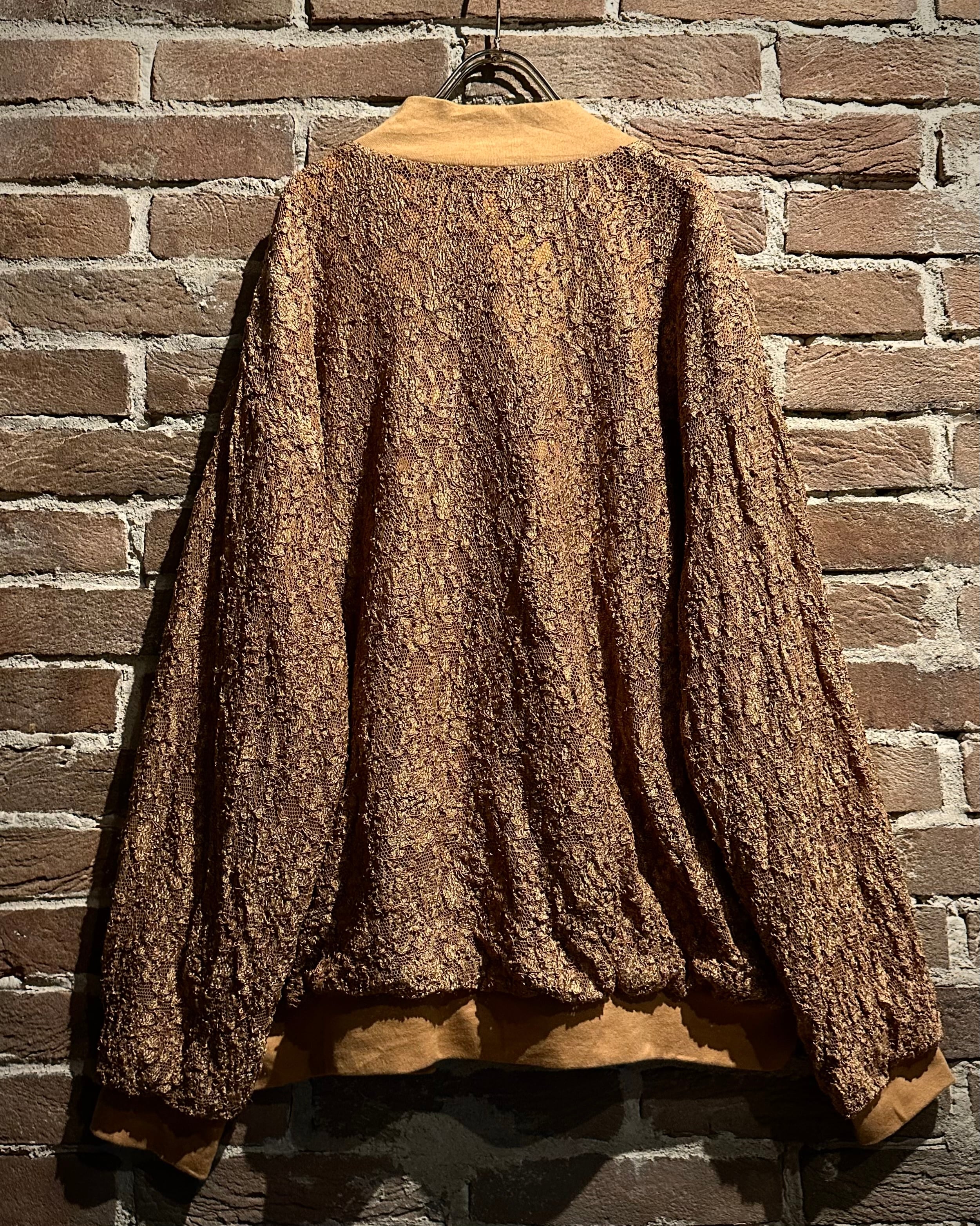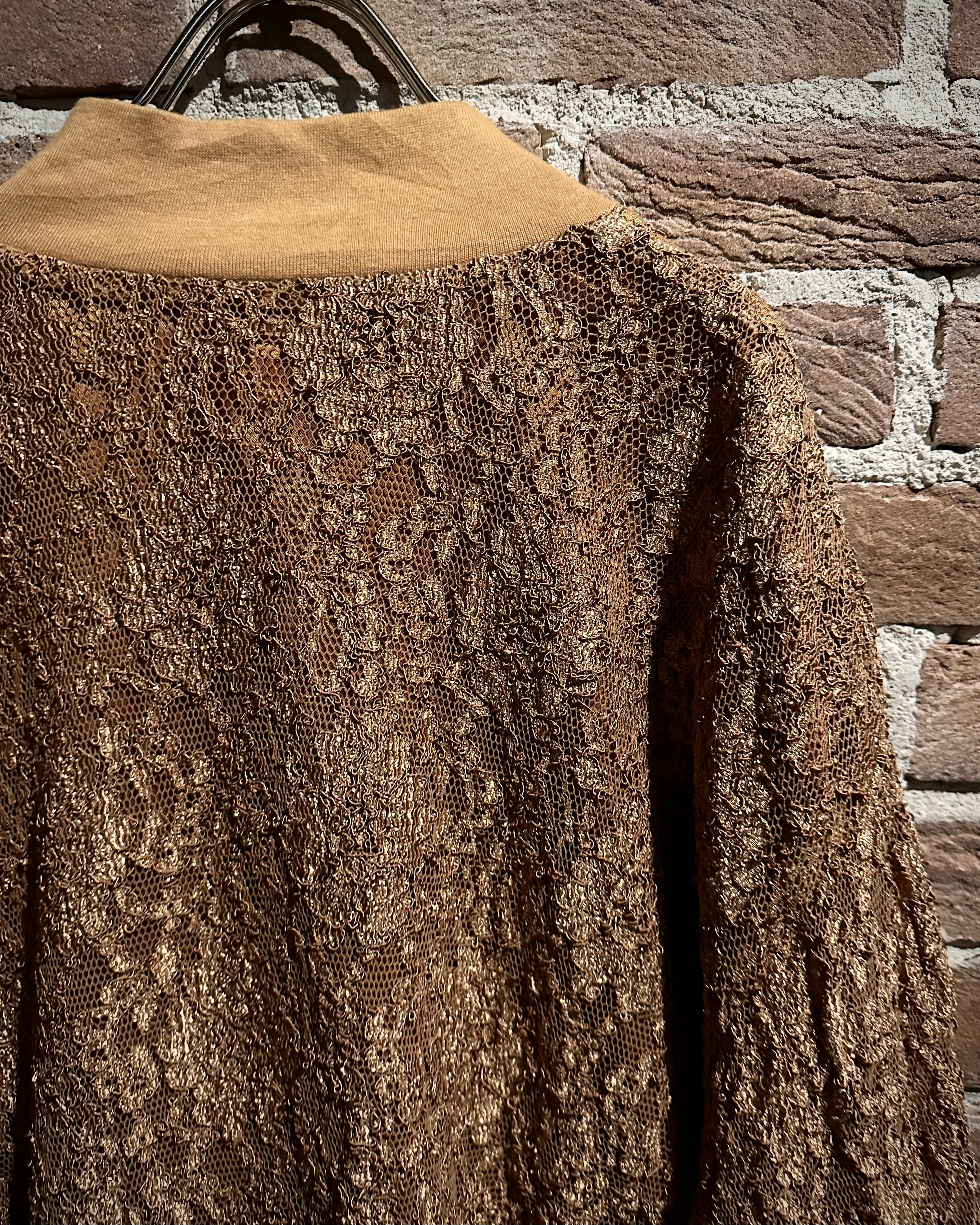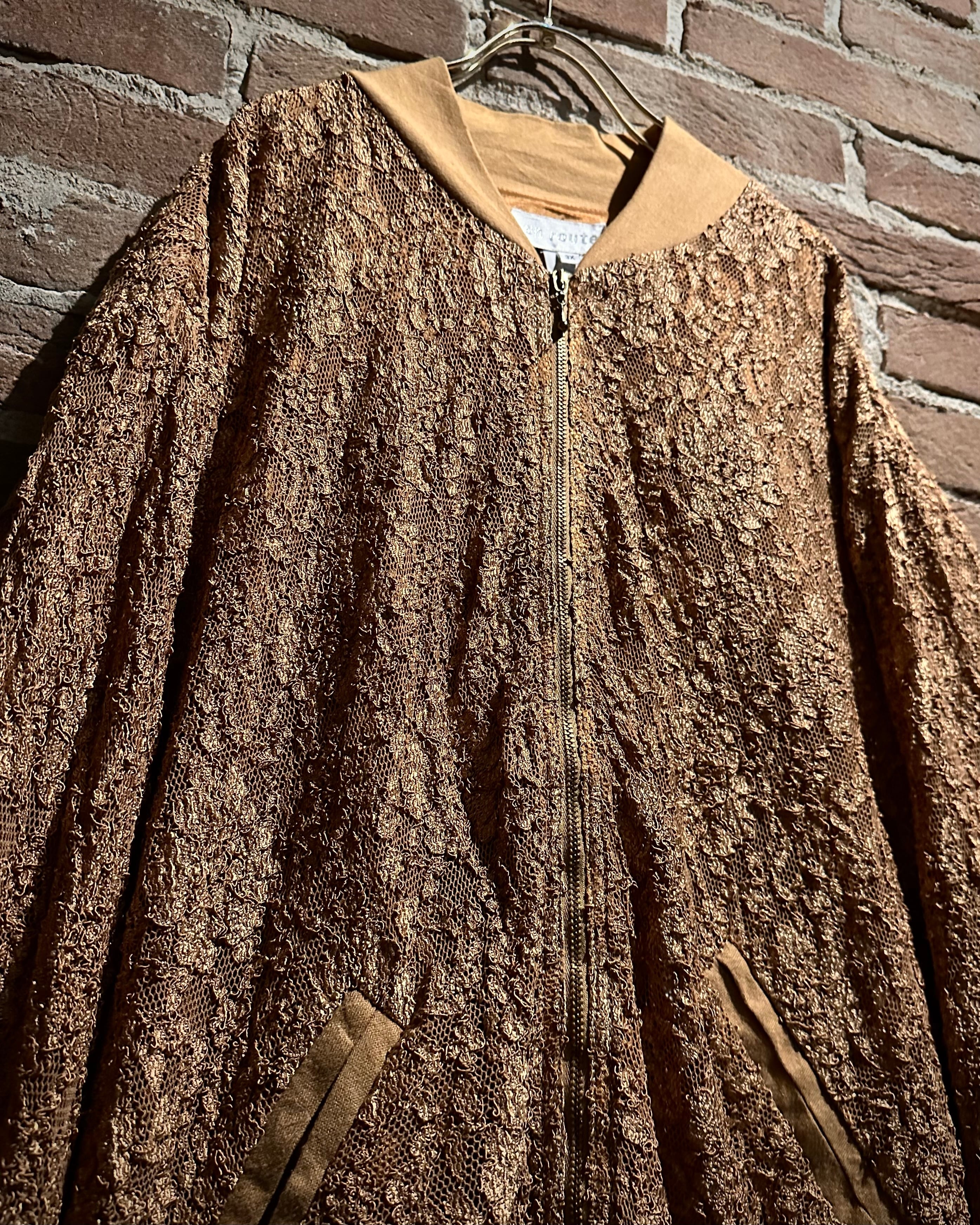 肌触りの良いゴールドの生地をベースに、花柄を載せた繊細なレース地を重ねたブルゾンジャケット。