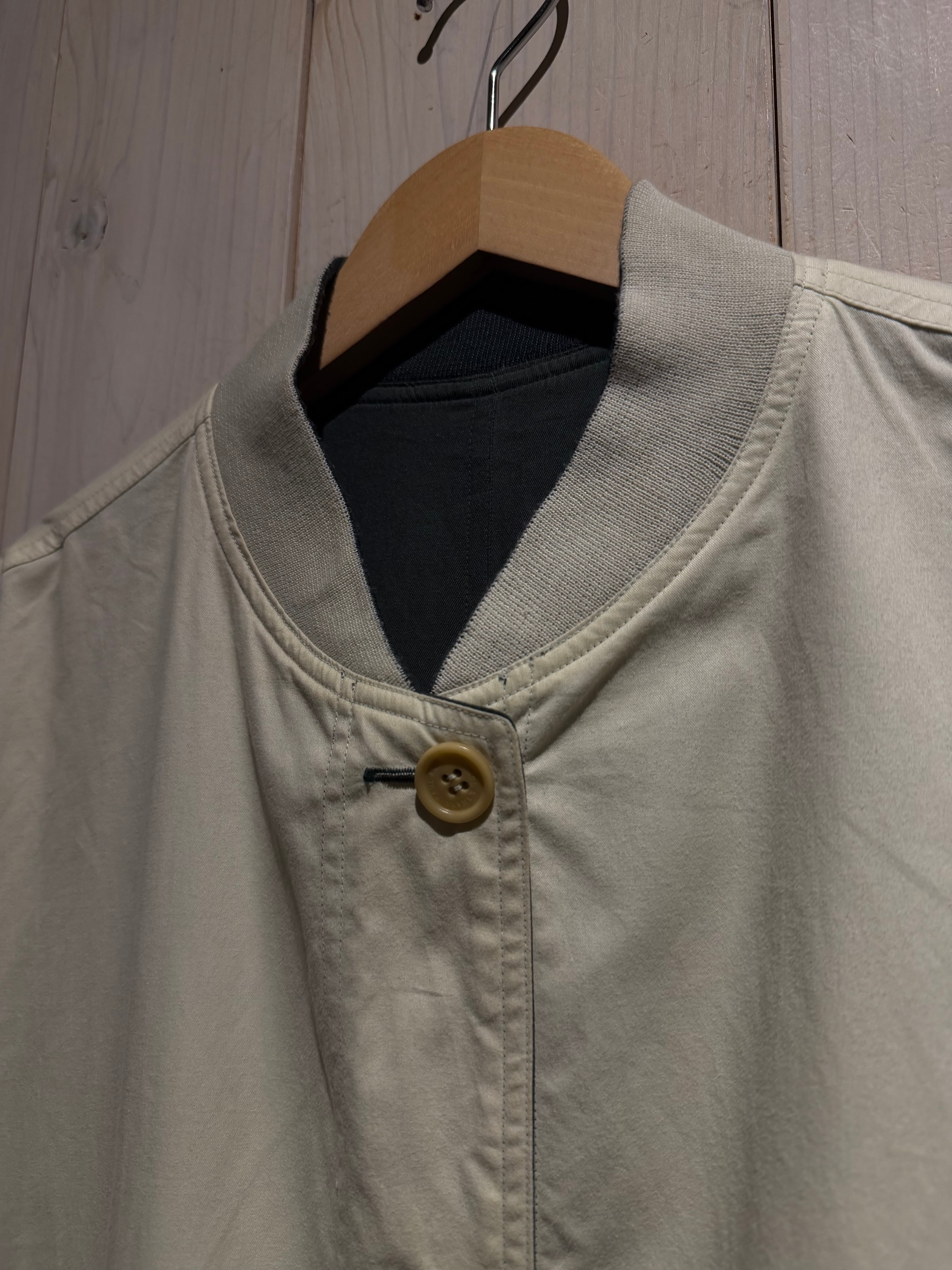 フロントはミニマルなボタンダウン仕様。サイドにはスラッシュポケットを配置し、洗練された佇まいの中に実用性もしっかりと確保。アイボリー面は柔らかく上品な空気感を、青緑面は深みのある都会的な表情を演出してくれます。