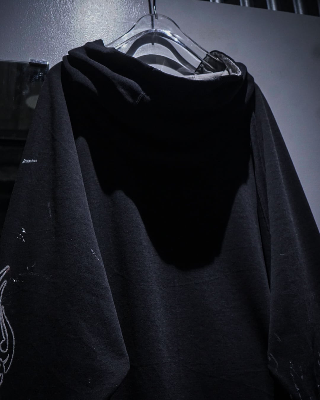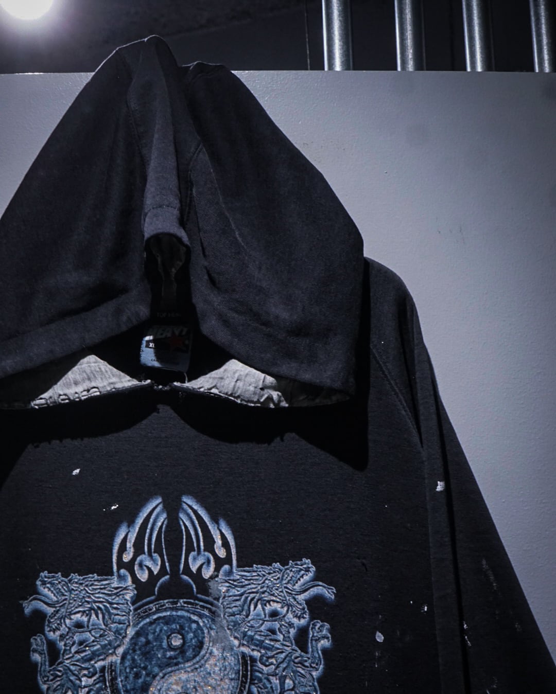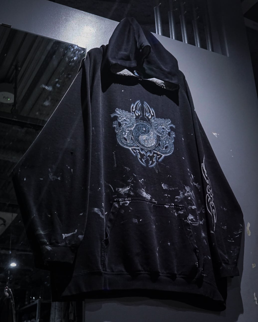 陰陽や龍といったオリエンタルなモチーフに、フェードやペイントによるリアルなエイジングが重なった、現代のストリートにも映えるフーディの逸品です。