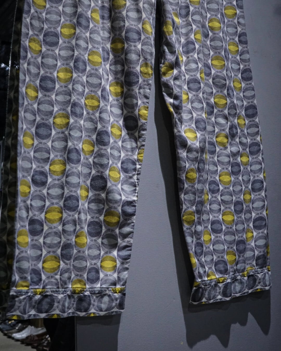 グレーをベースに、イエローを差し込んだ、幾何学的な総柄を全面に落とし込んだ、当時らしい空気感漂う1着。