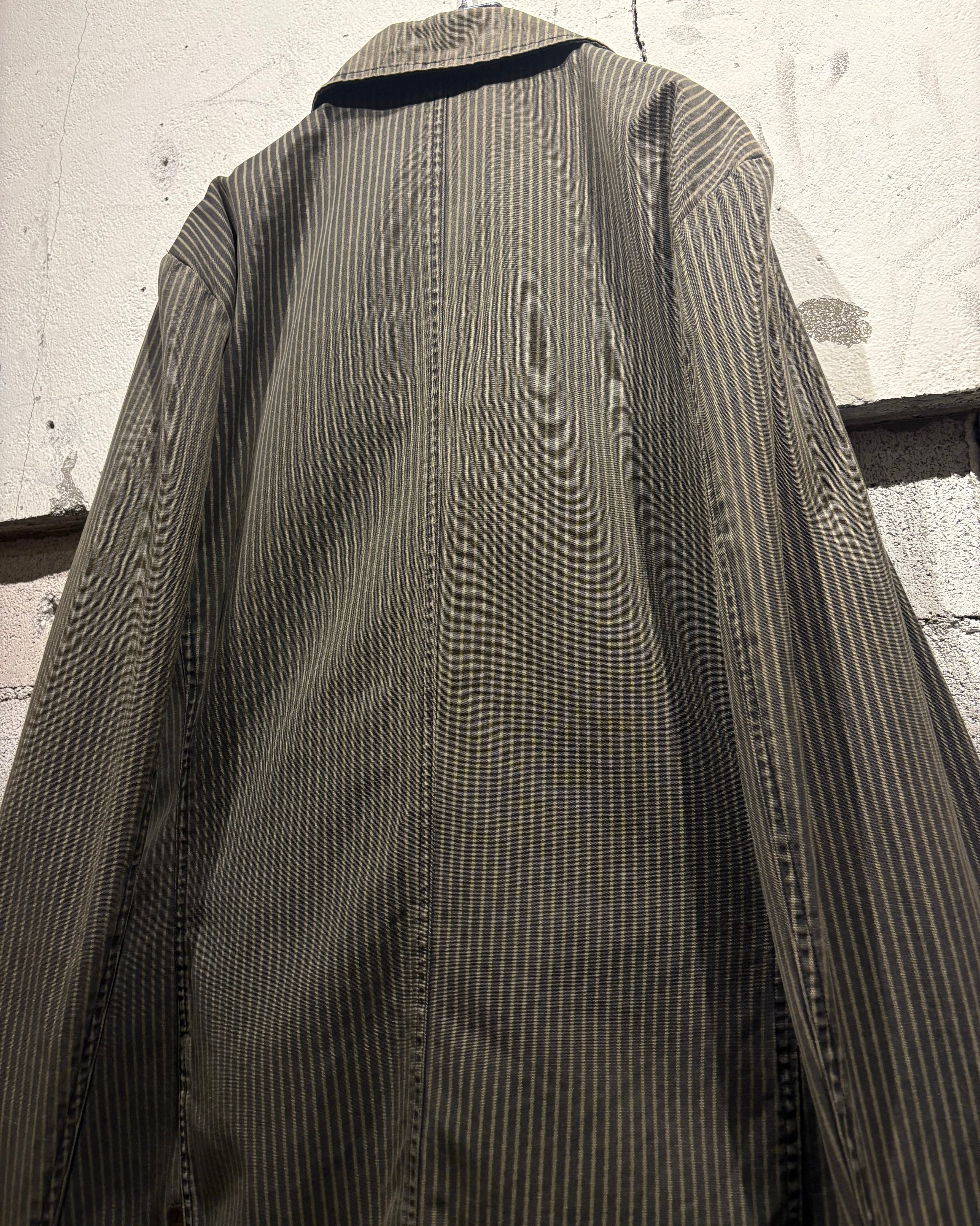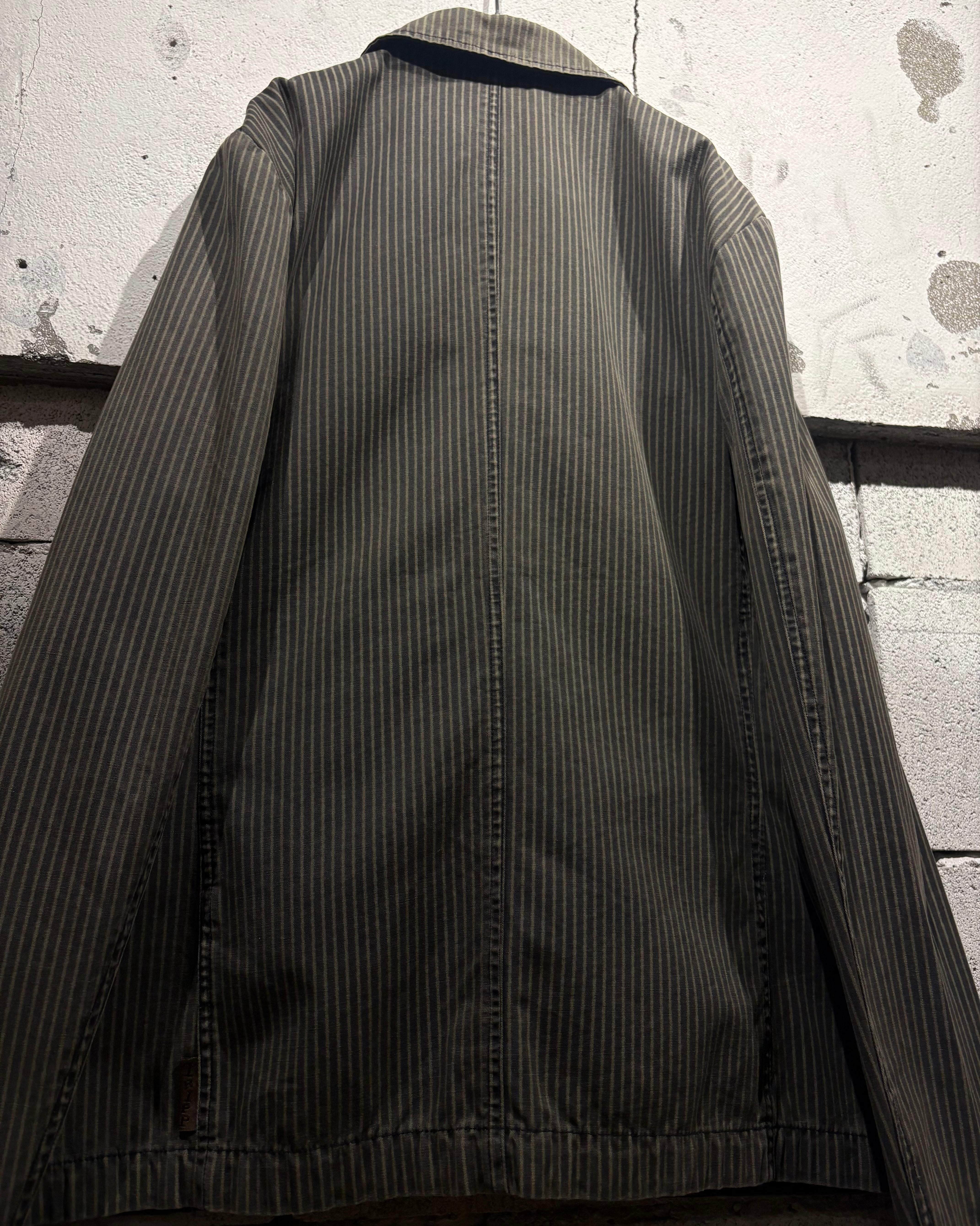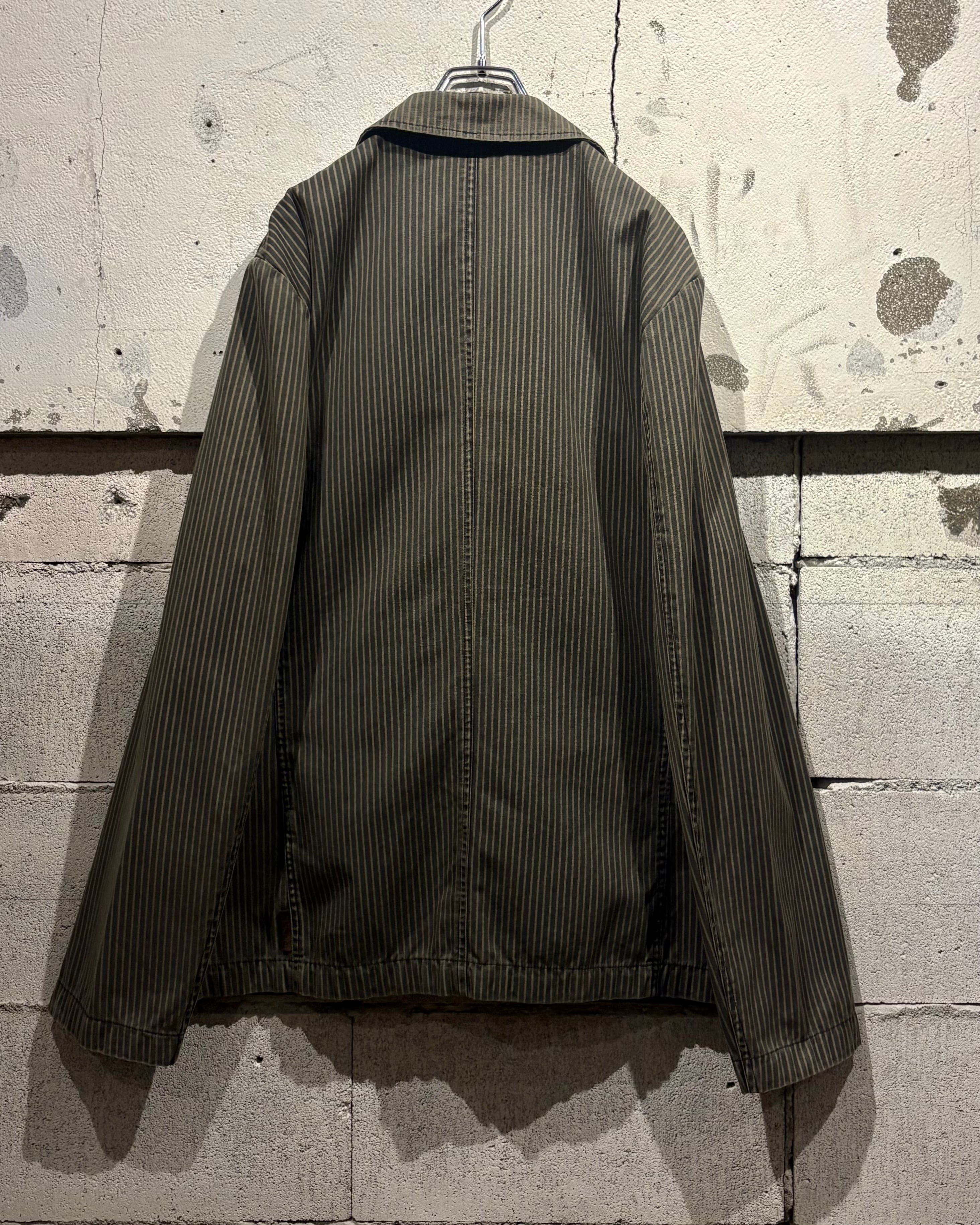 程良くコシを持たせたコットンをベースに、細かなストライプ柄を全面に落とし込んだ1着。パンクカルチャーを背景に持ちながらも、どこかモードな空気感を漂わせる仕上がりとなっています。