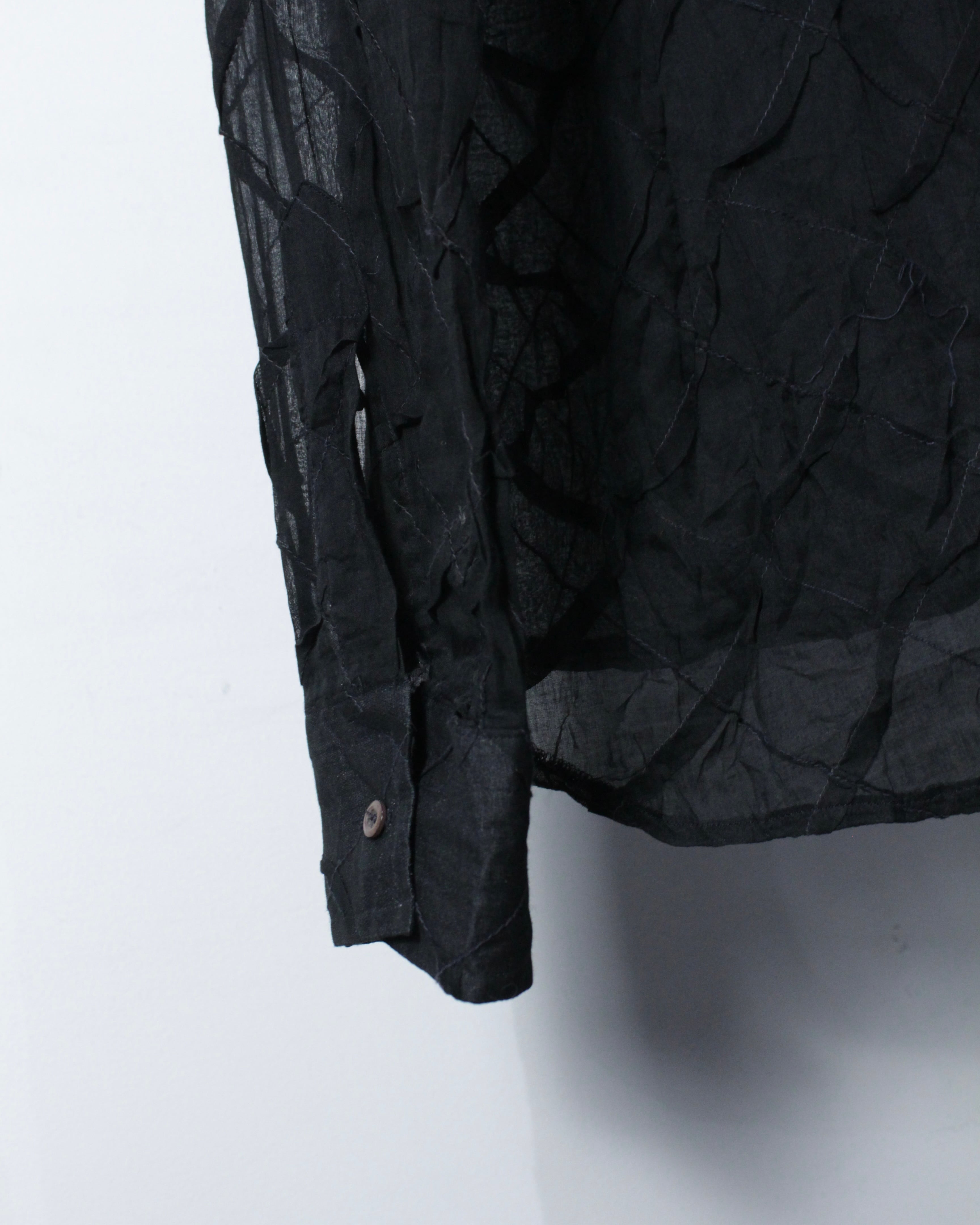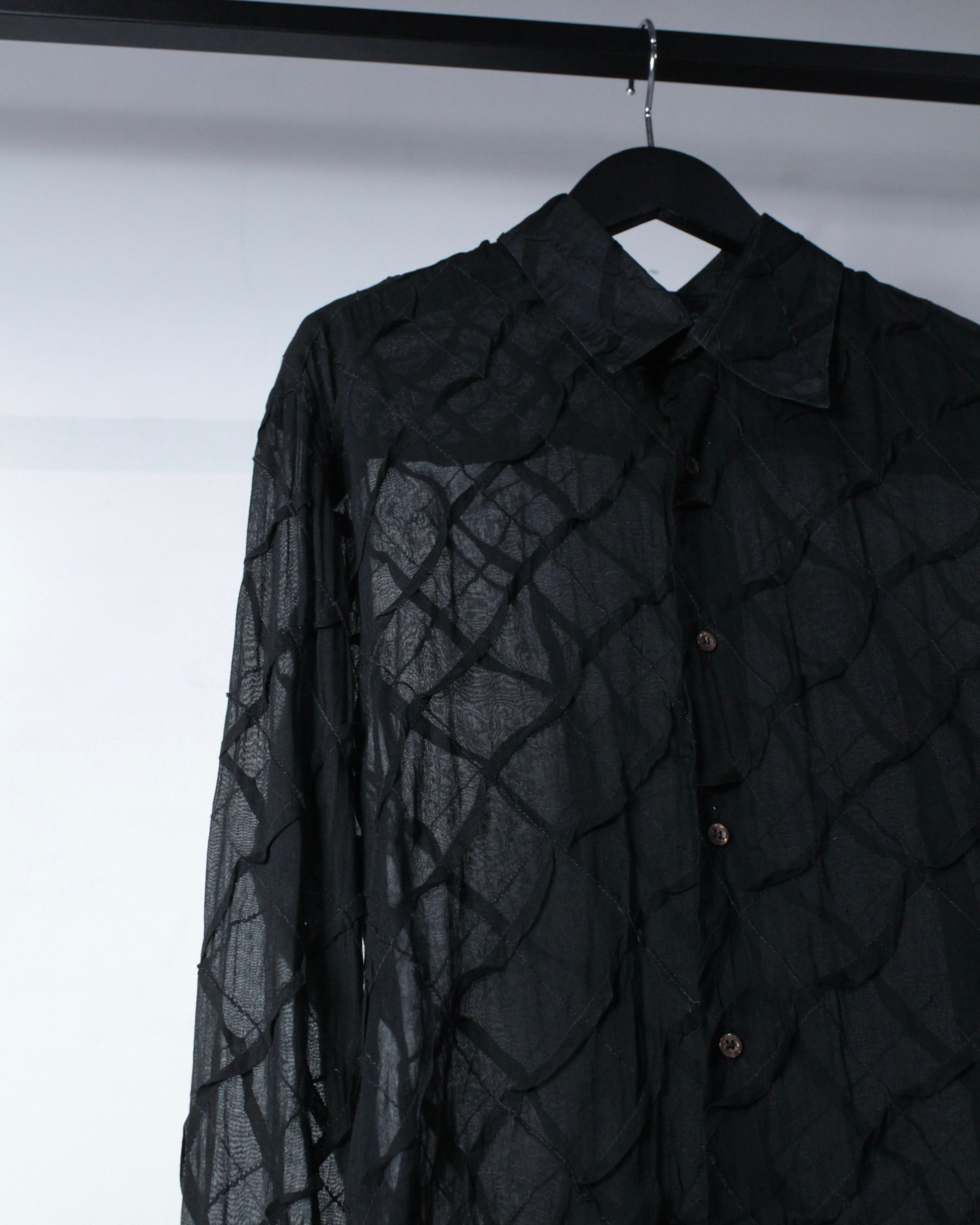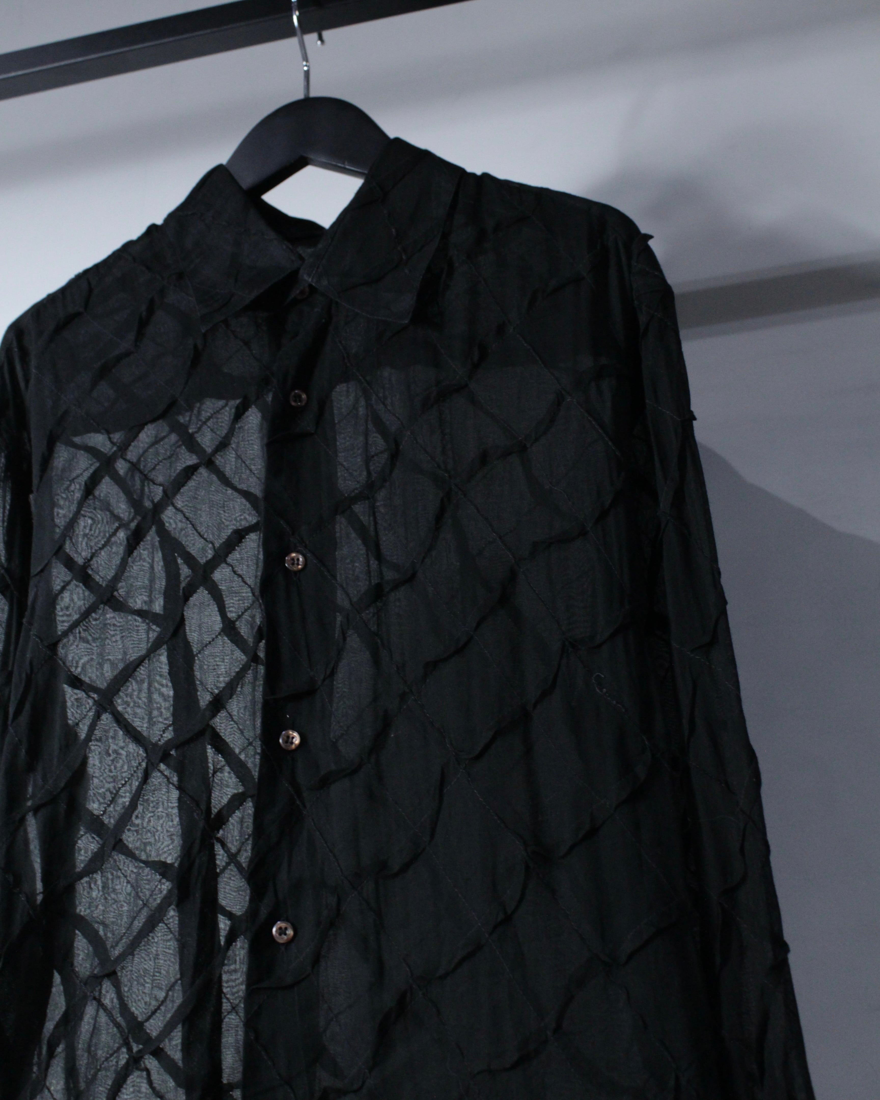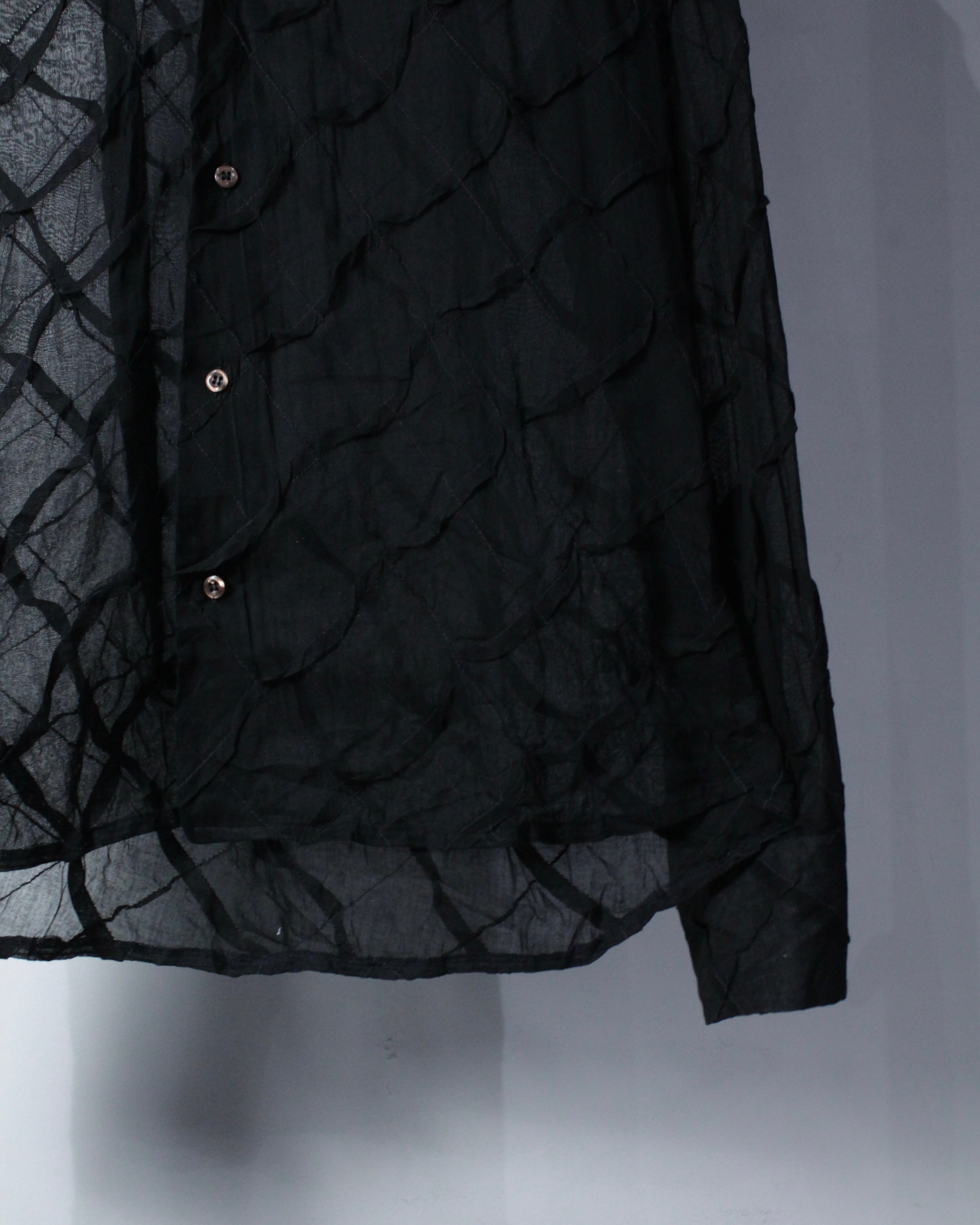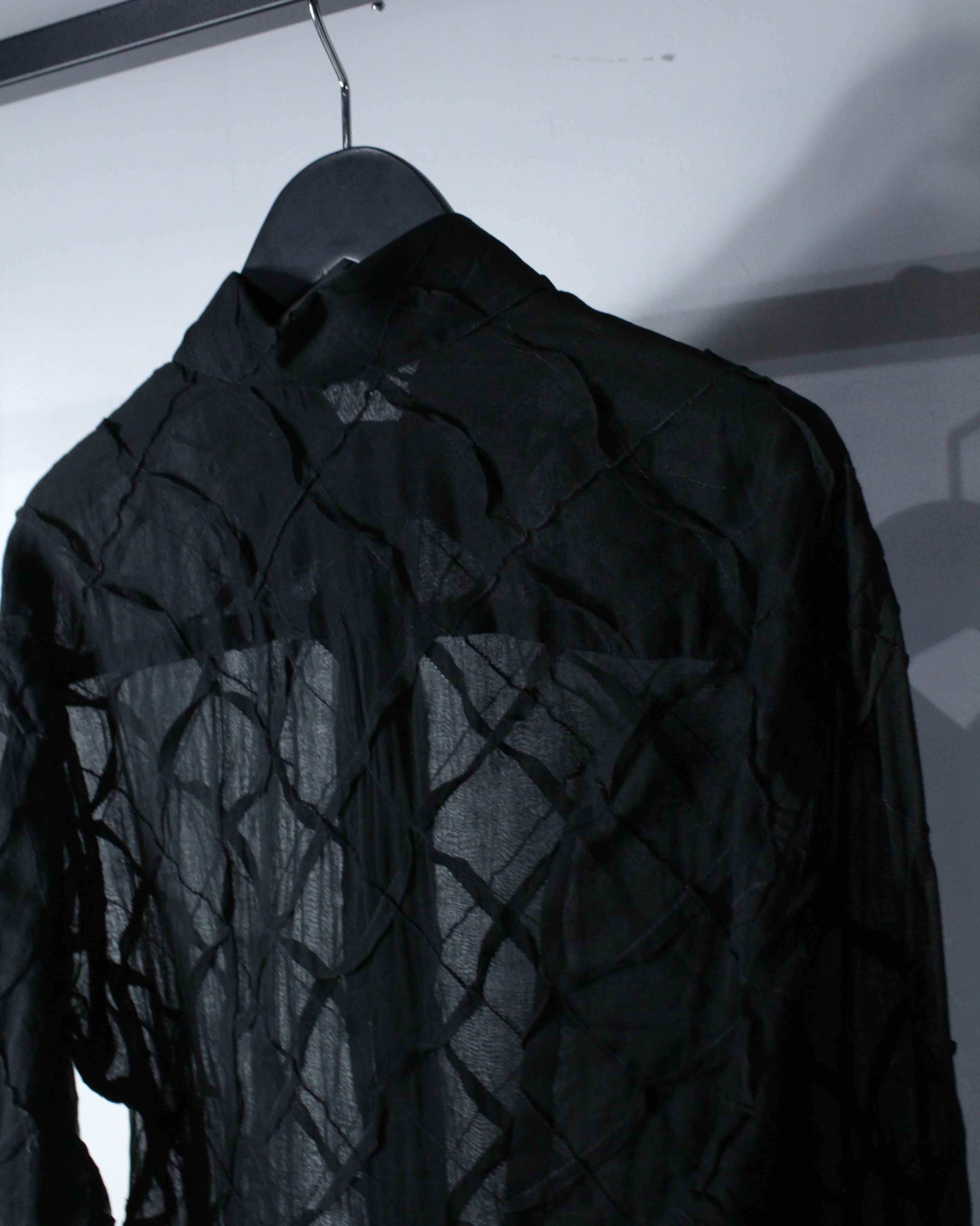 透け感のあるシアーをベースに、立体感のある生地を格子状に重ねることで、奥行きと陰影を生み出したアーティスティックな仕上がりとなっています。
