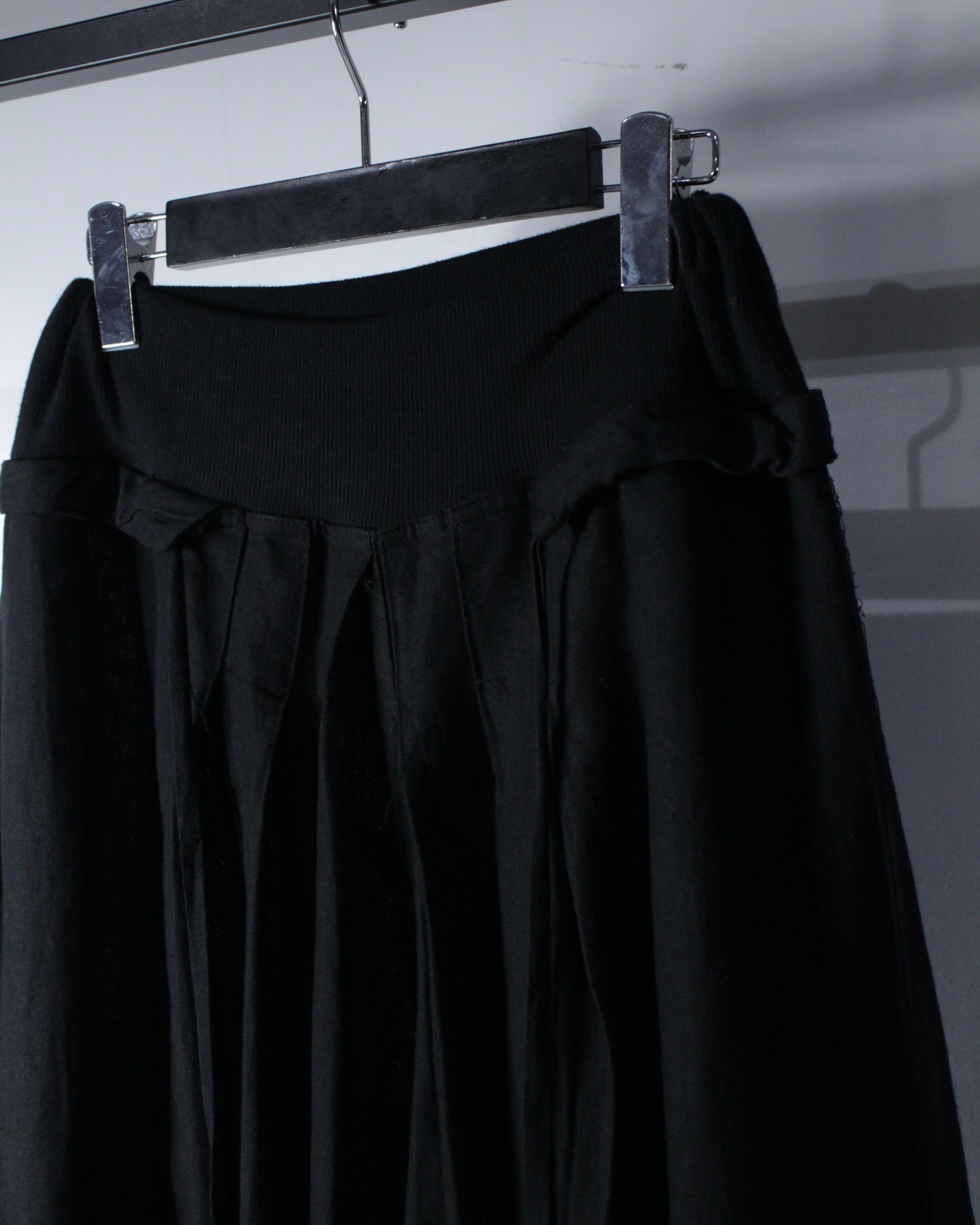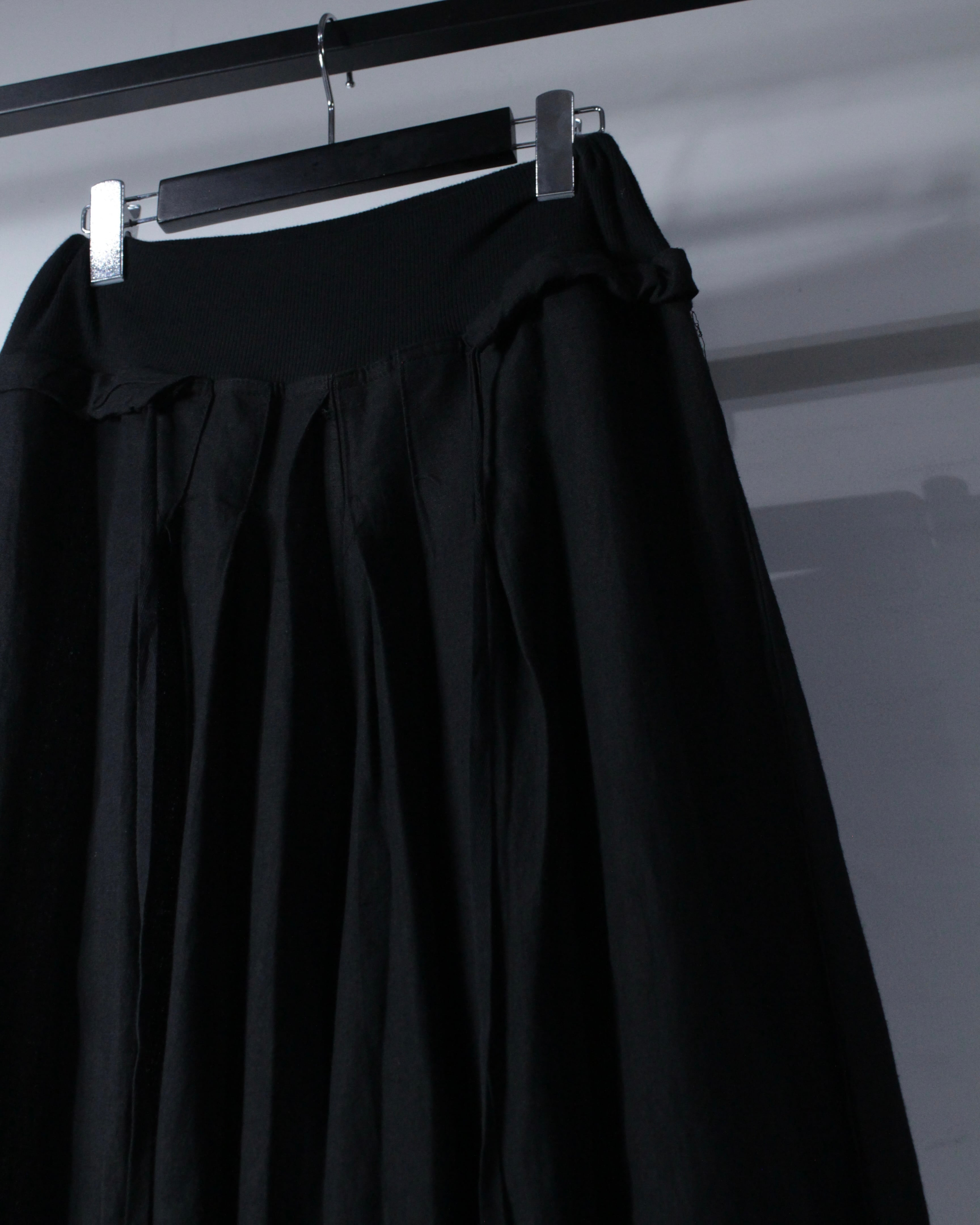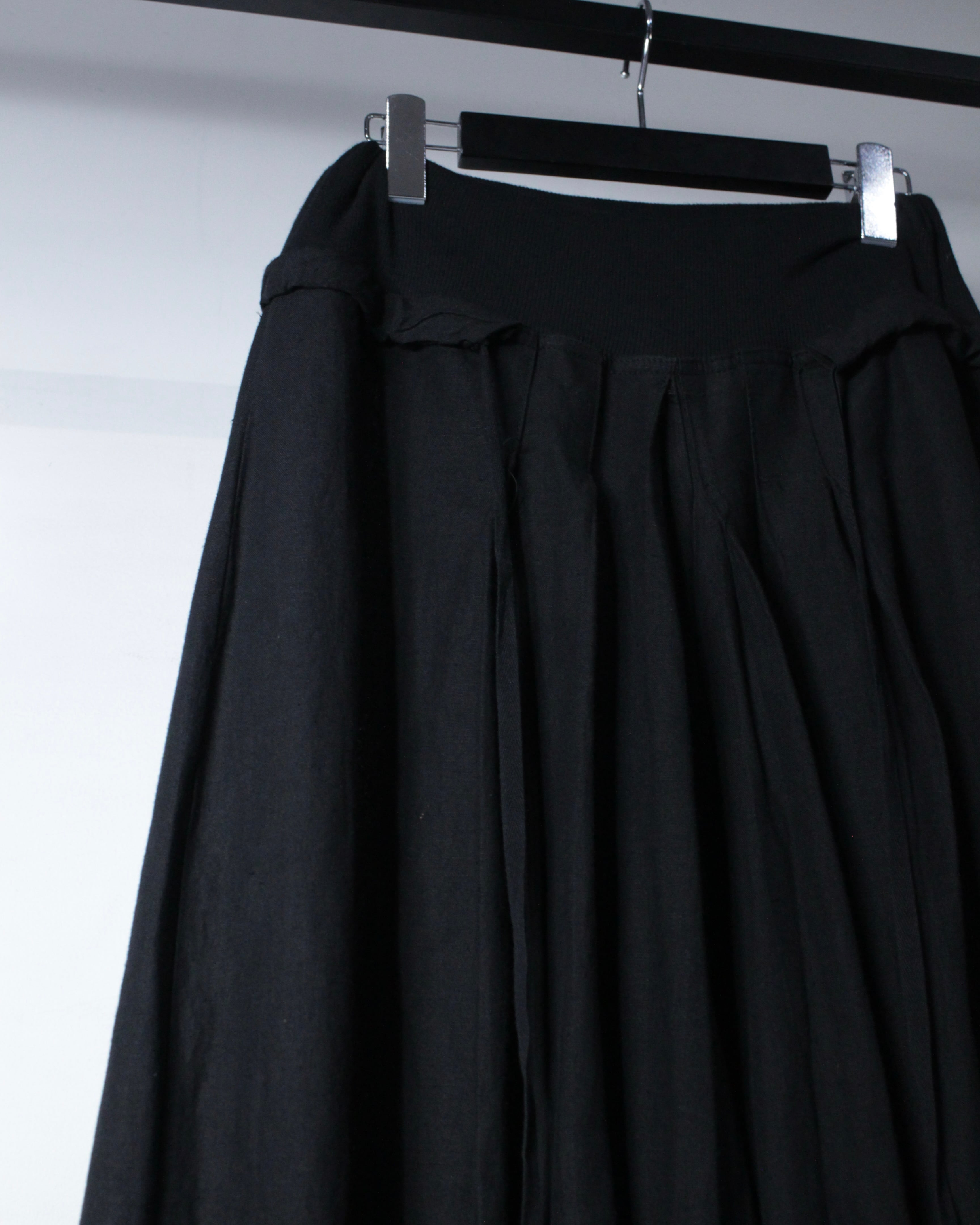 深みのあるオールブラックのボディに、たっぷりとタックを効かせることで生まれる立体的なドレープが美しい1本。シンプルな色使いながらも、動きに合わせて表情を変えるファブリックが圧倒的な存在感を放っています。