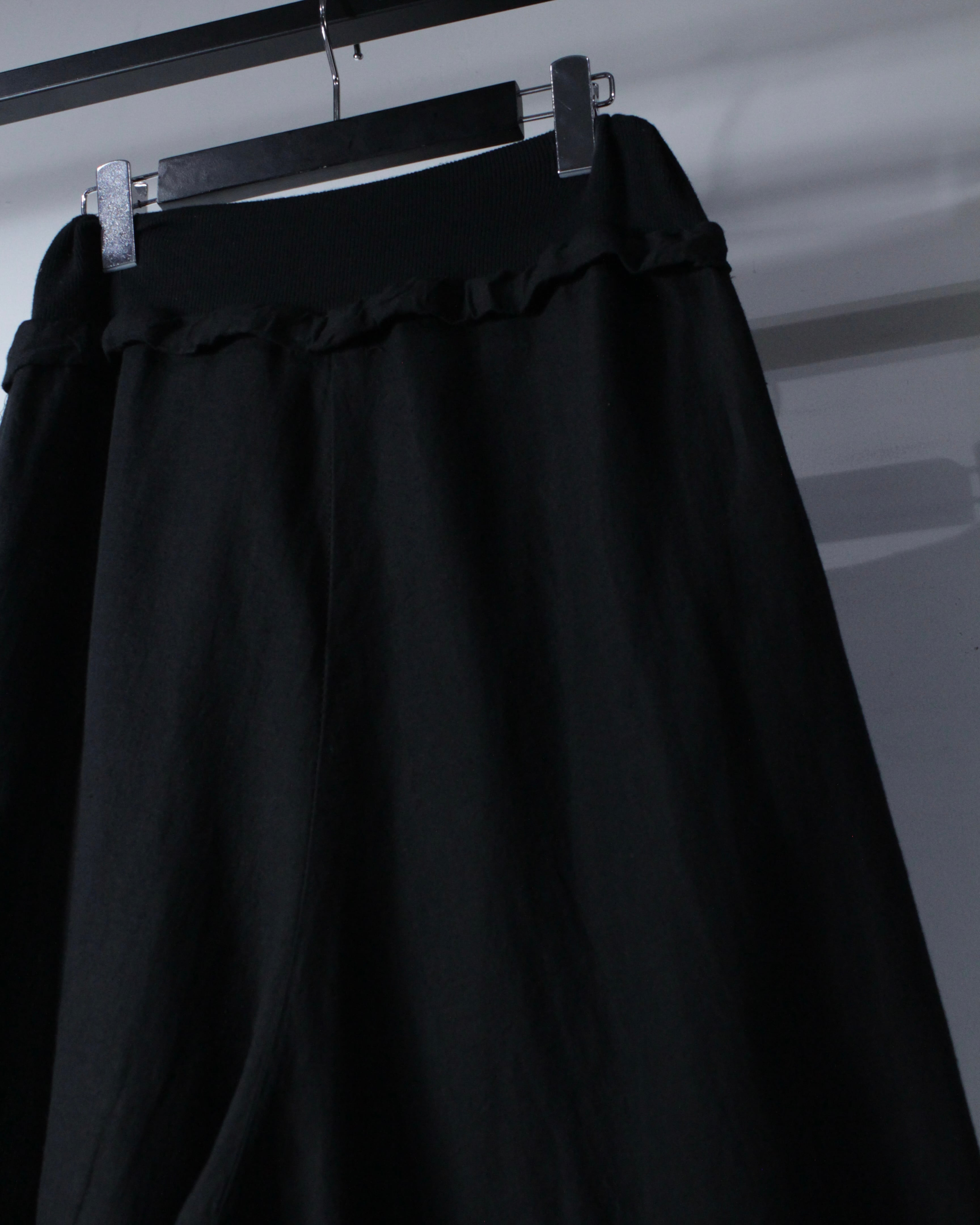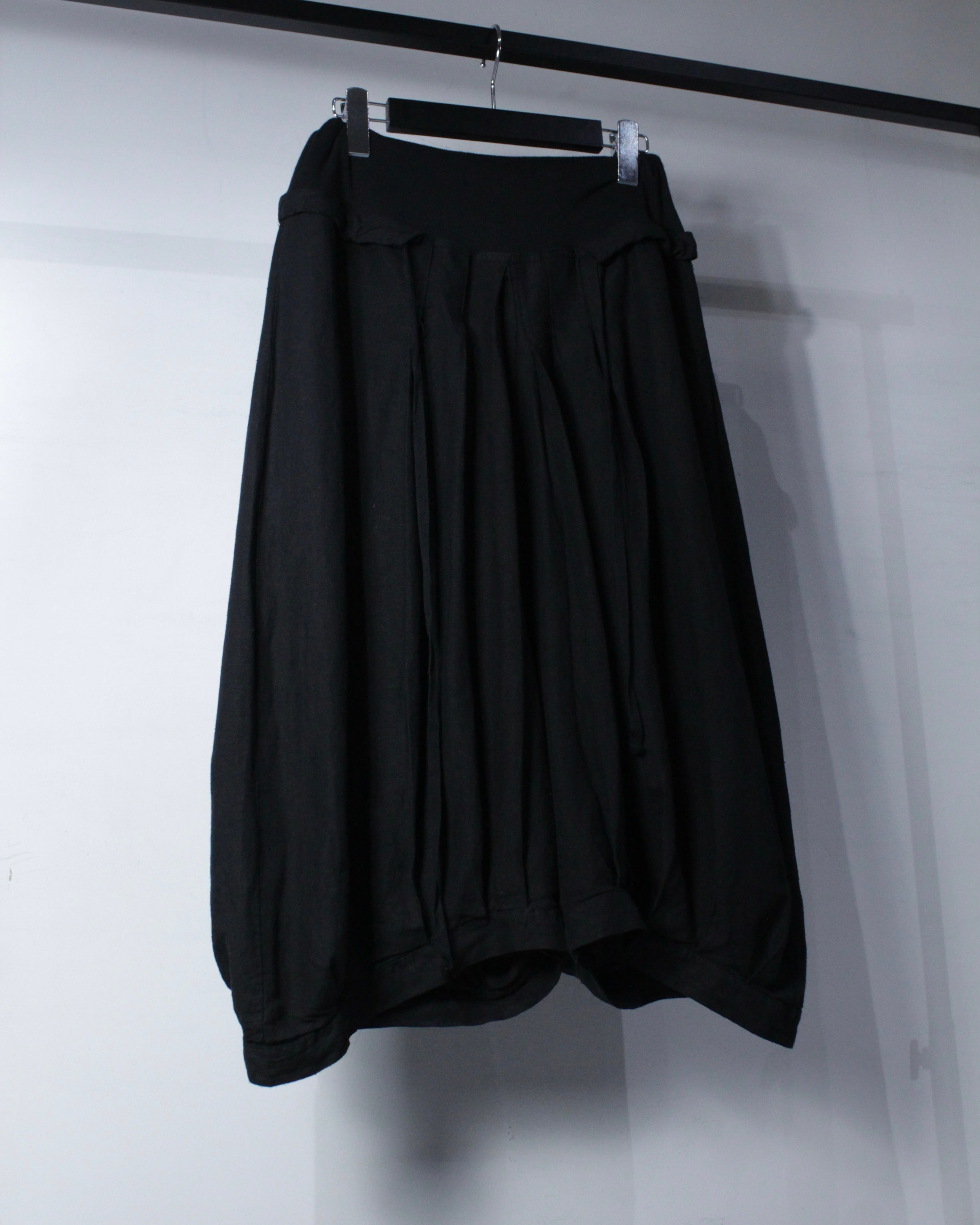 股上を深く取ったサルエル仕様に加え、裾に向かって丸みを帯びるバルーンシルエットを採用。生地が自然に溜まることで独特なボリューム感を演出し、歩く度に流れるようなシルエットを演出しています。