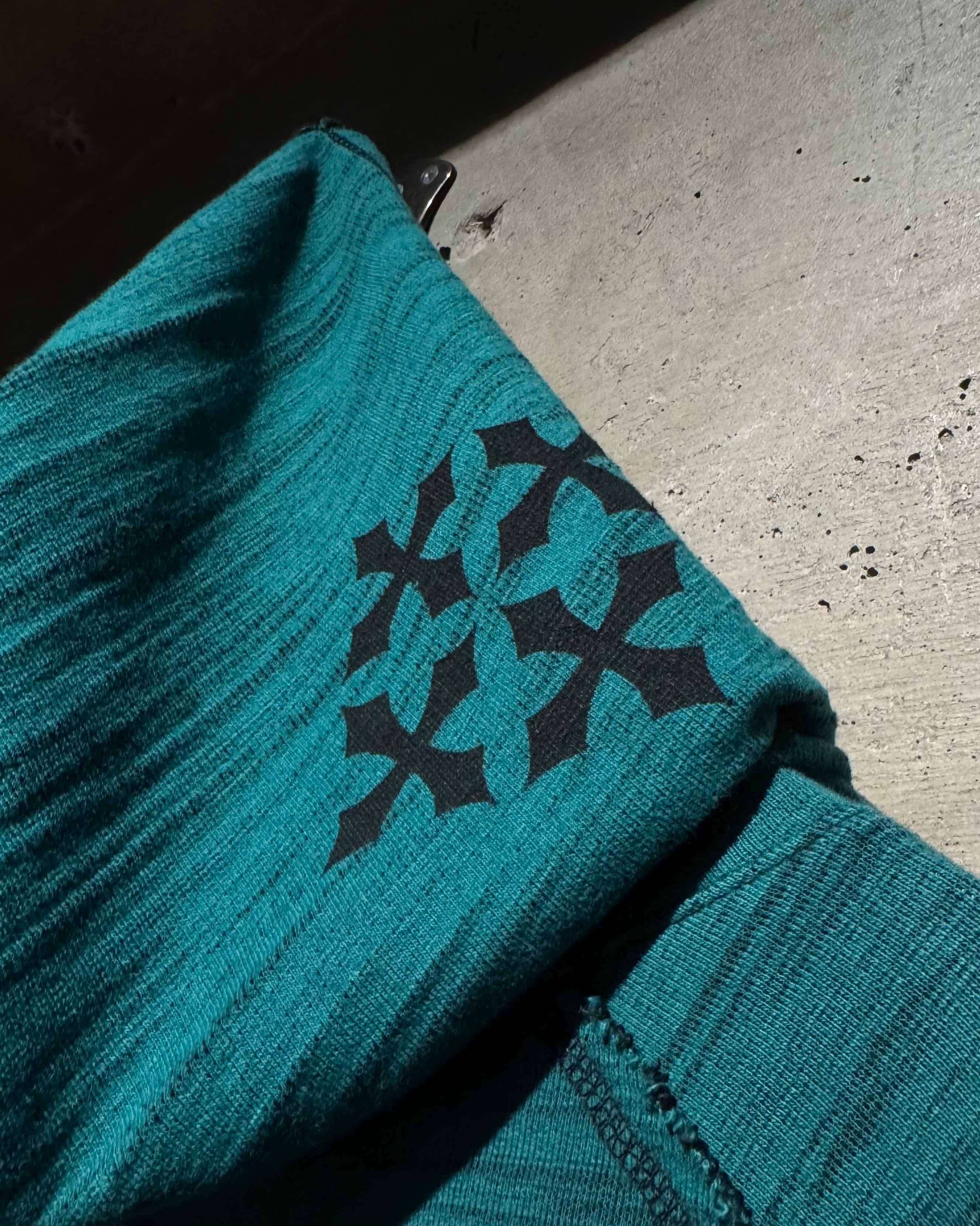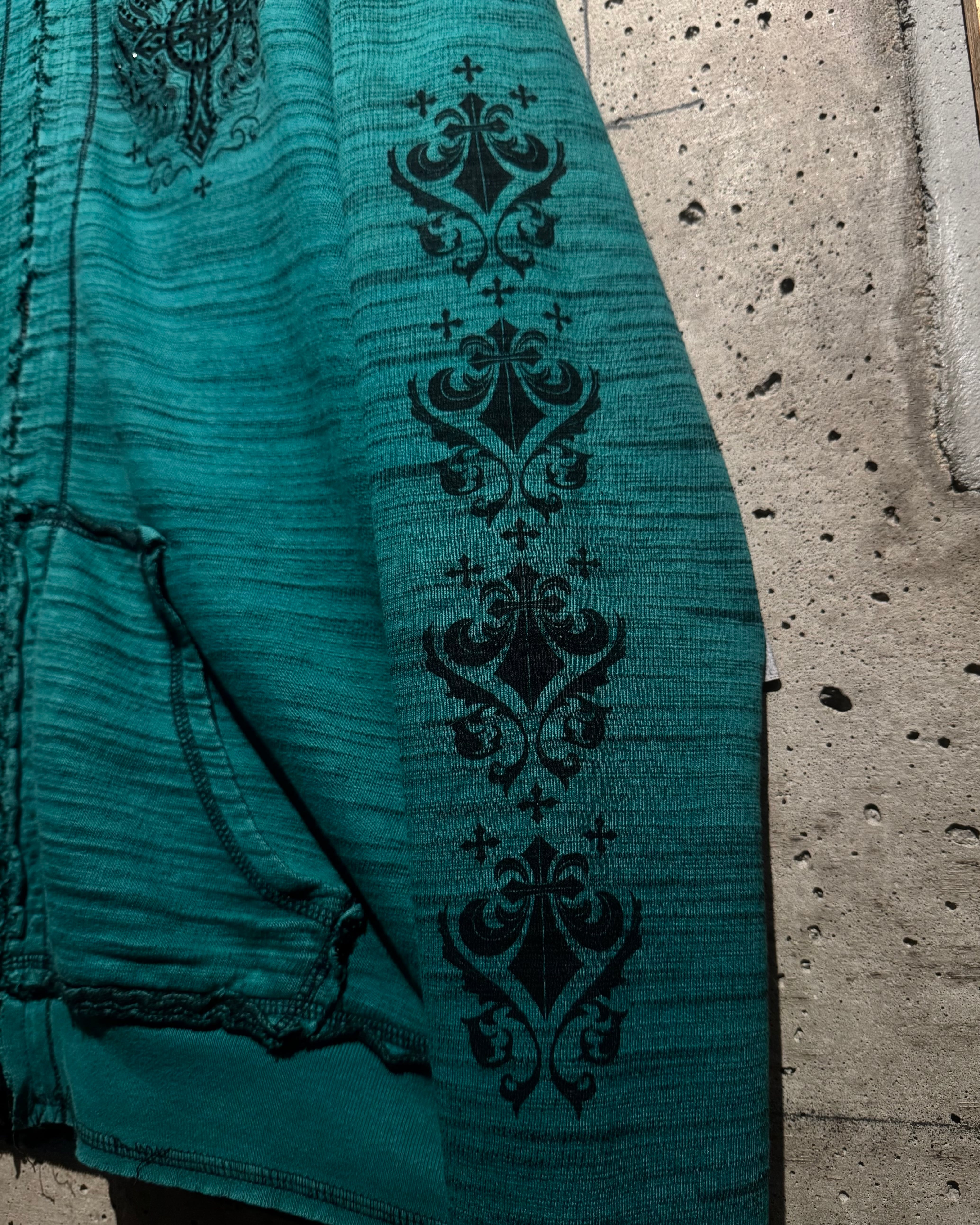 ブラックベースの面はフロント、スリーブ、バックにかけてゴシック調のフレアモチーフを大胆にプリント。ホワイトで載せることでコントラストを効かせ、Affliction特有の退廃的かつロックな世界観を存分に表現しています。