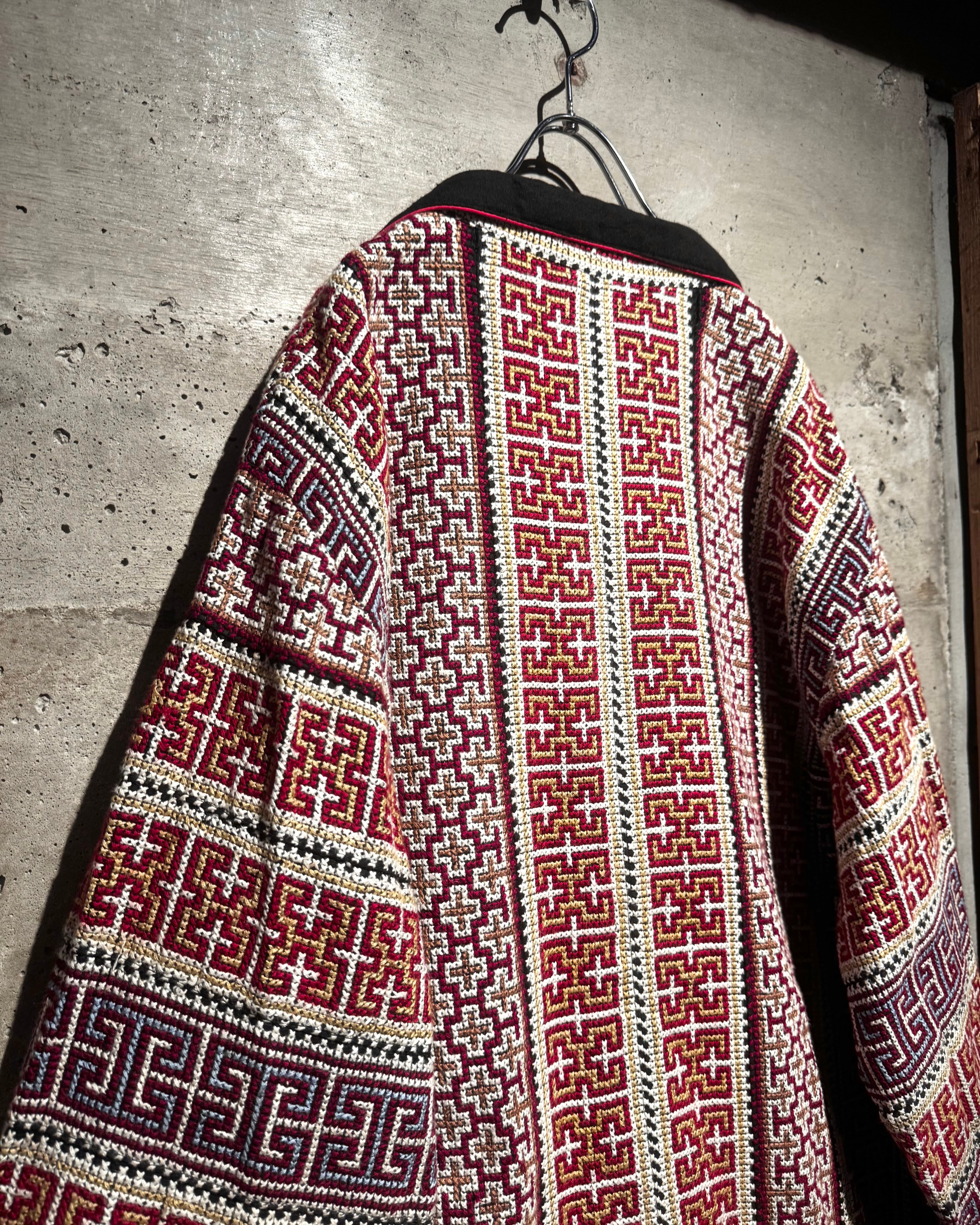 表面には、モン族特有の幾何学模様を全面に落とし込んだ総刺繍ファブリックを採用。赤、白、ゴールドを基調としたカラーリングが美しく、手仕事ならではの温もりと圧倒的な存在感を放っています。