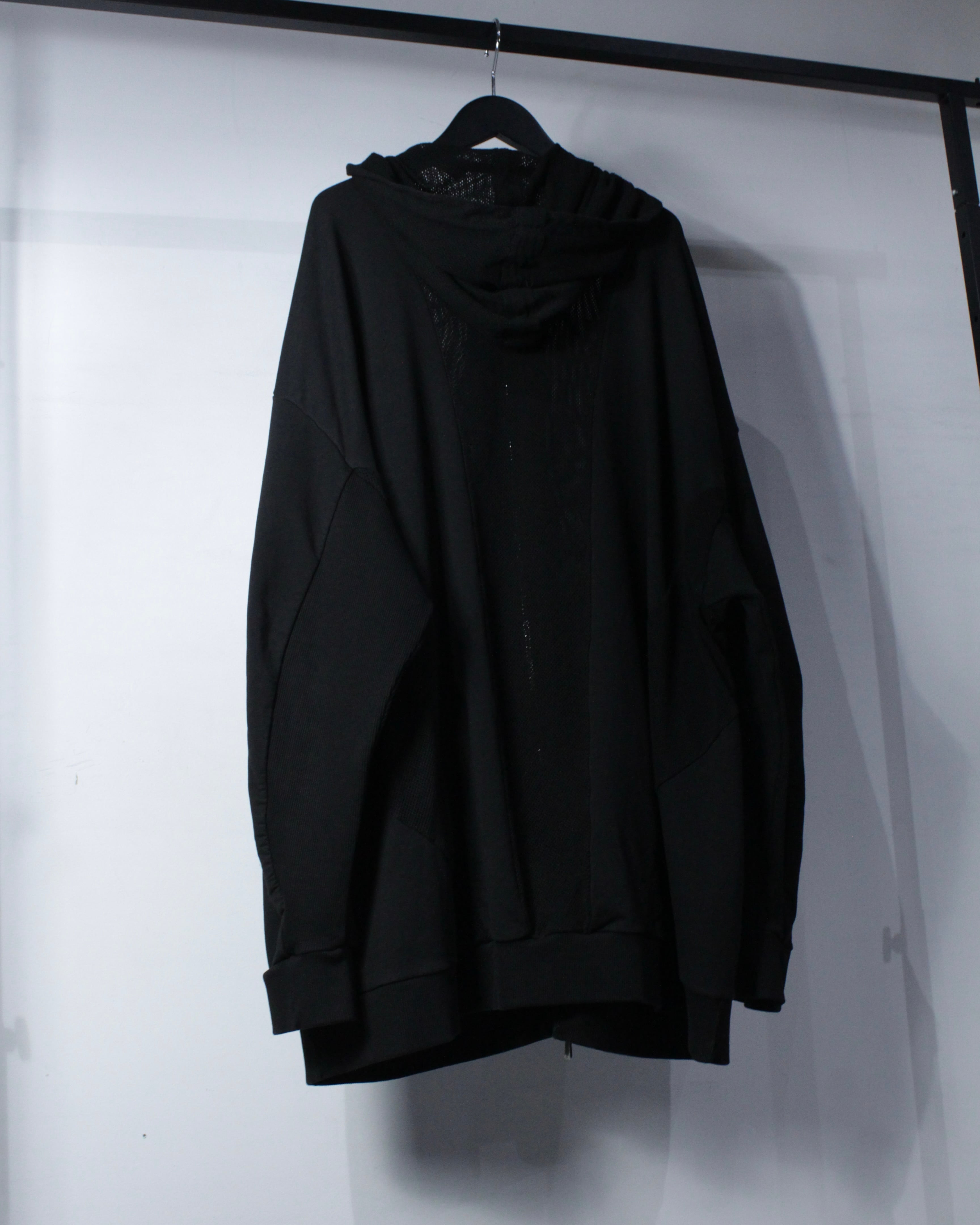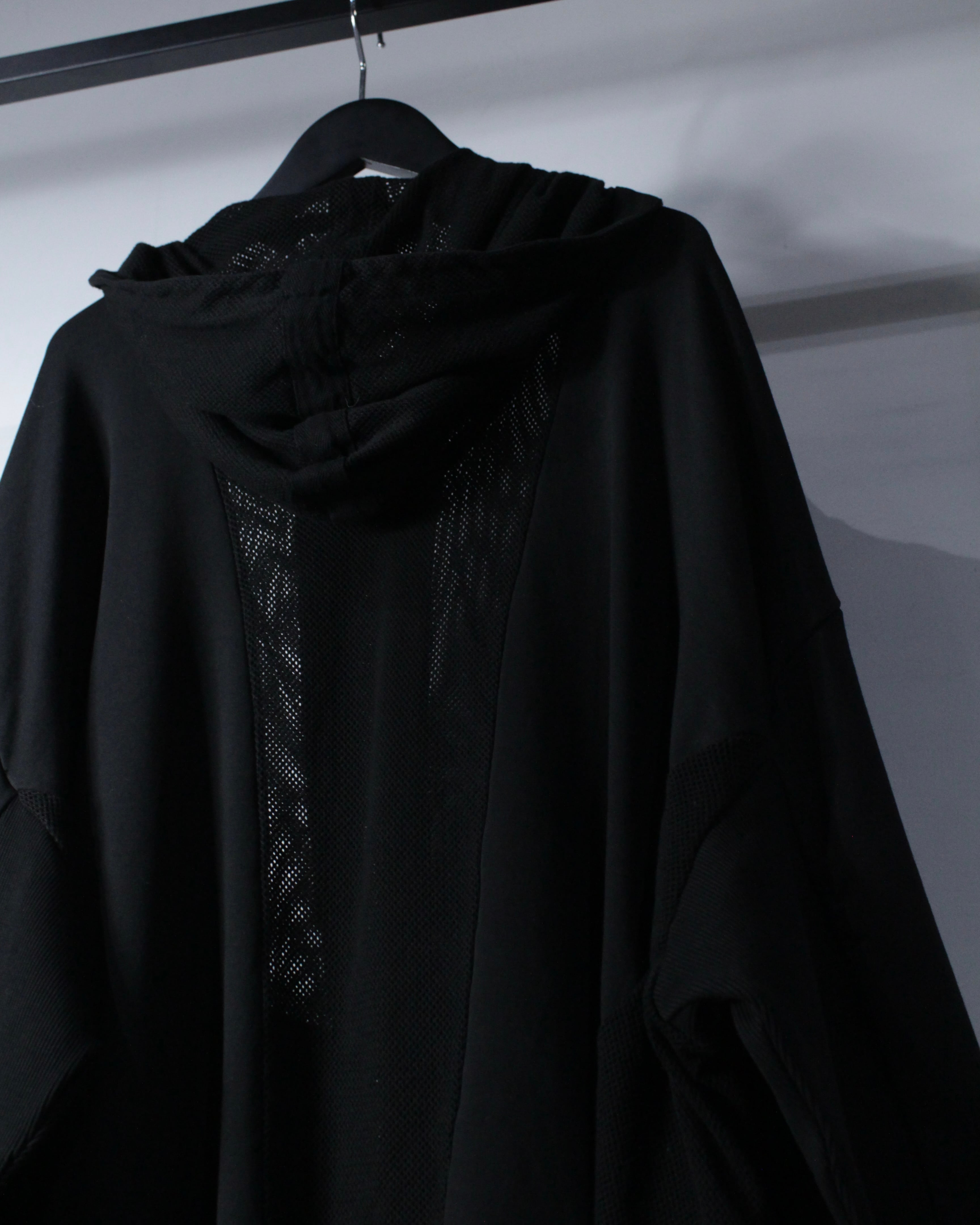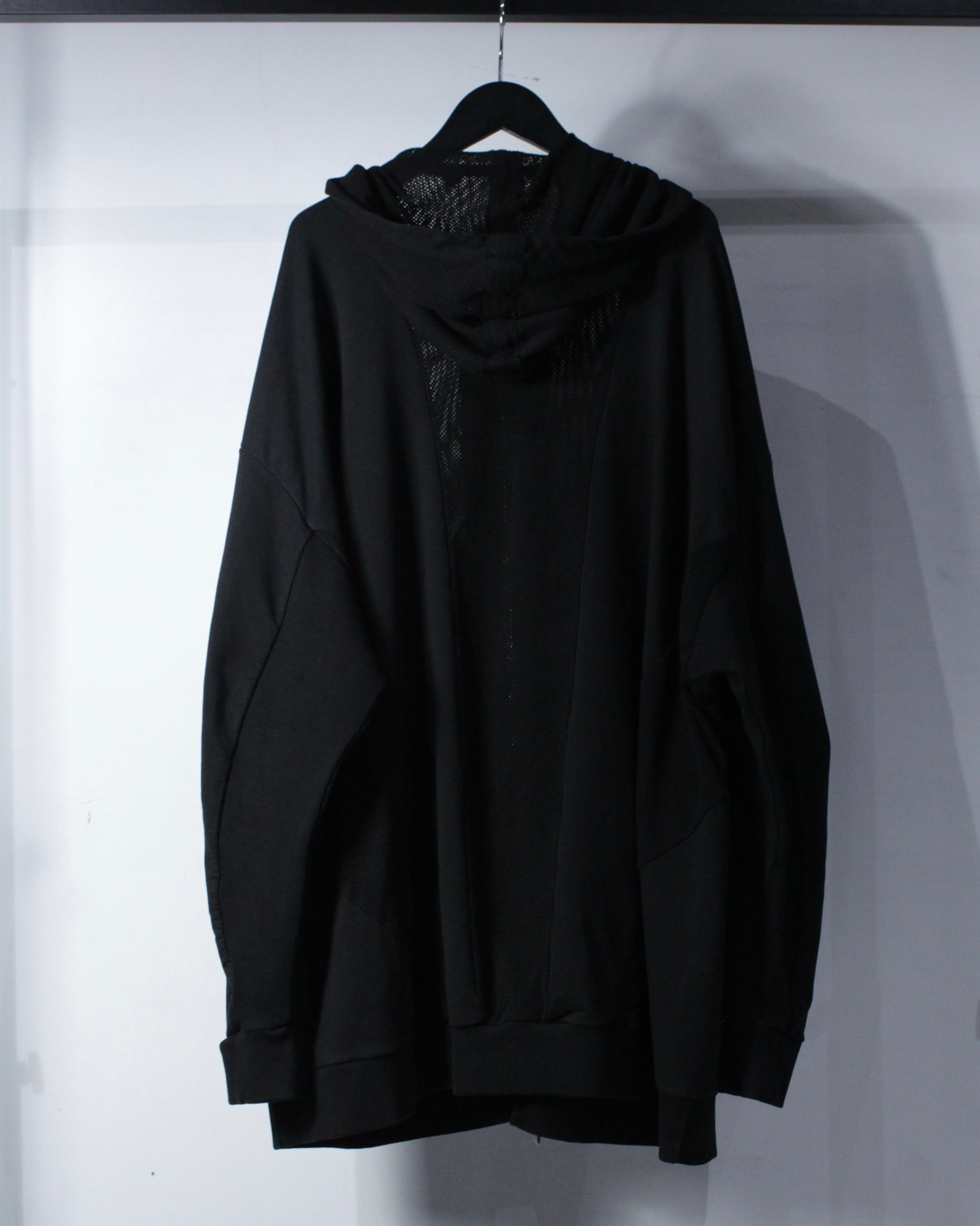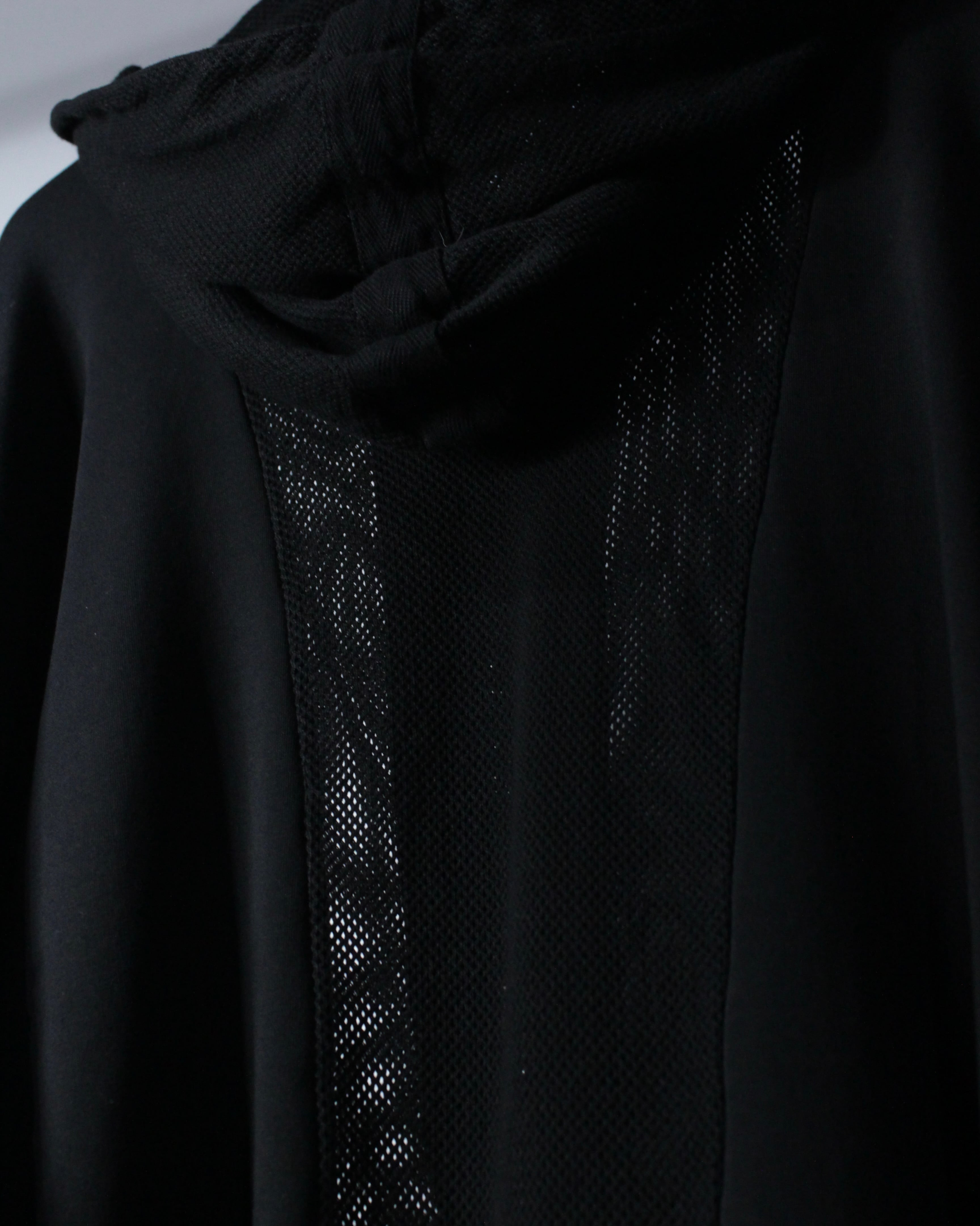 オールブラックで統一されたミニマルなボディに、背面からフードにかけて大胆にメッシュ切り替えを施した1着。ソリッドな雰囲気の中に、程良い透け感と軽快さを加えることで、単なるフーディに留まらないファッション性を感じさせる仕上がりとなっています