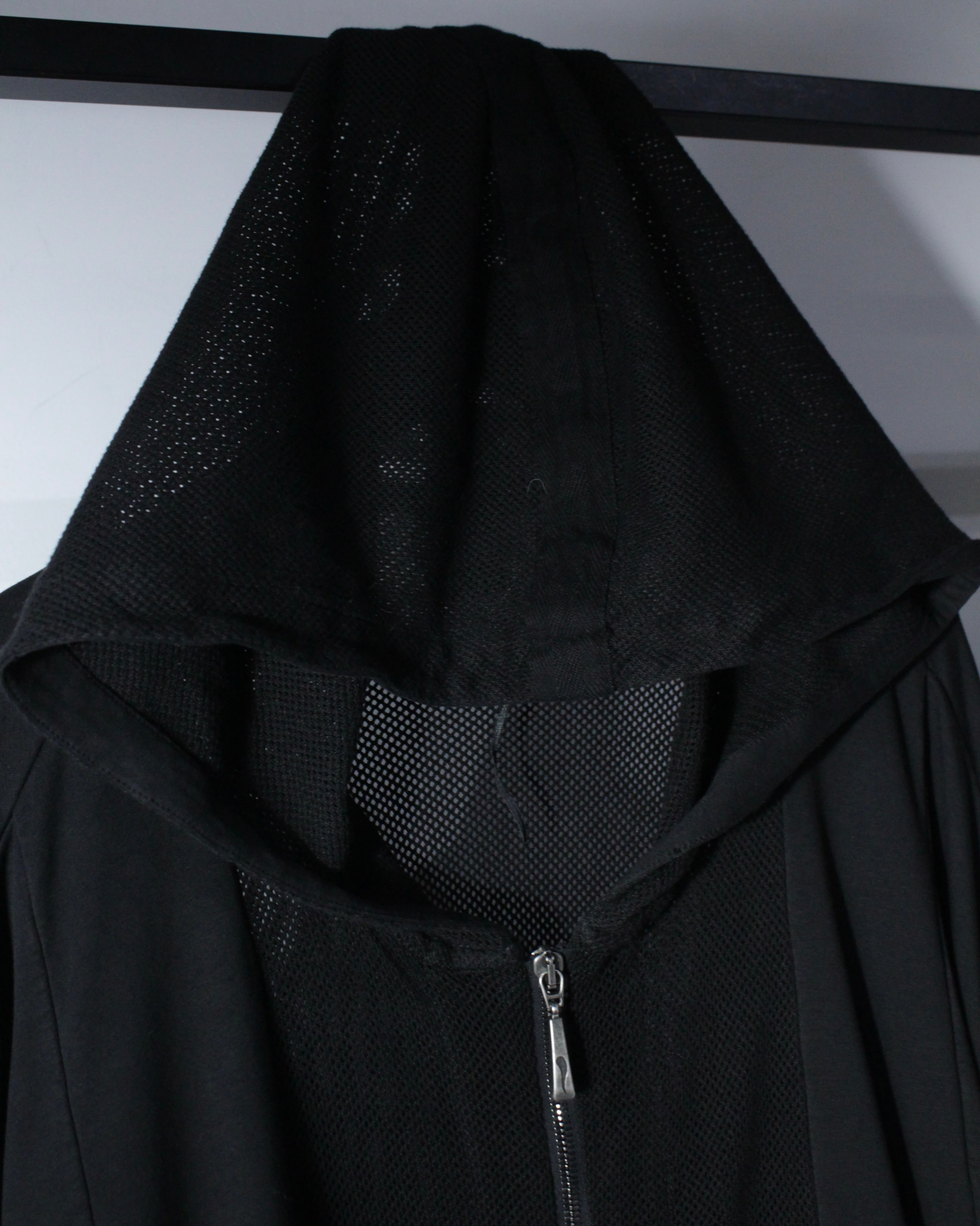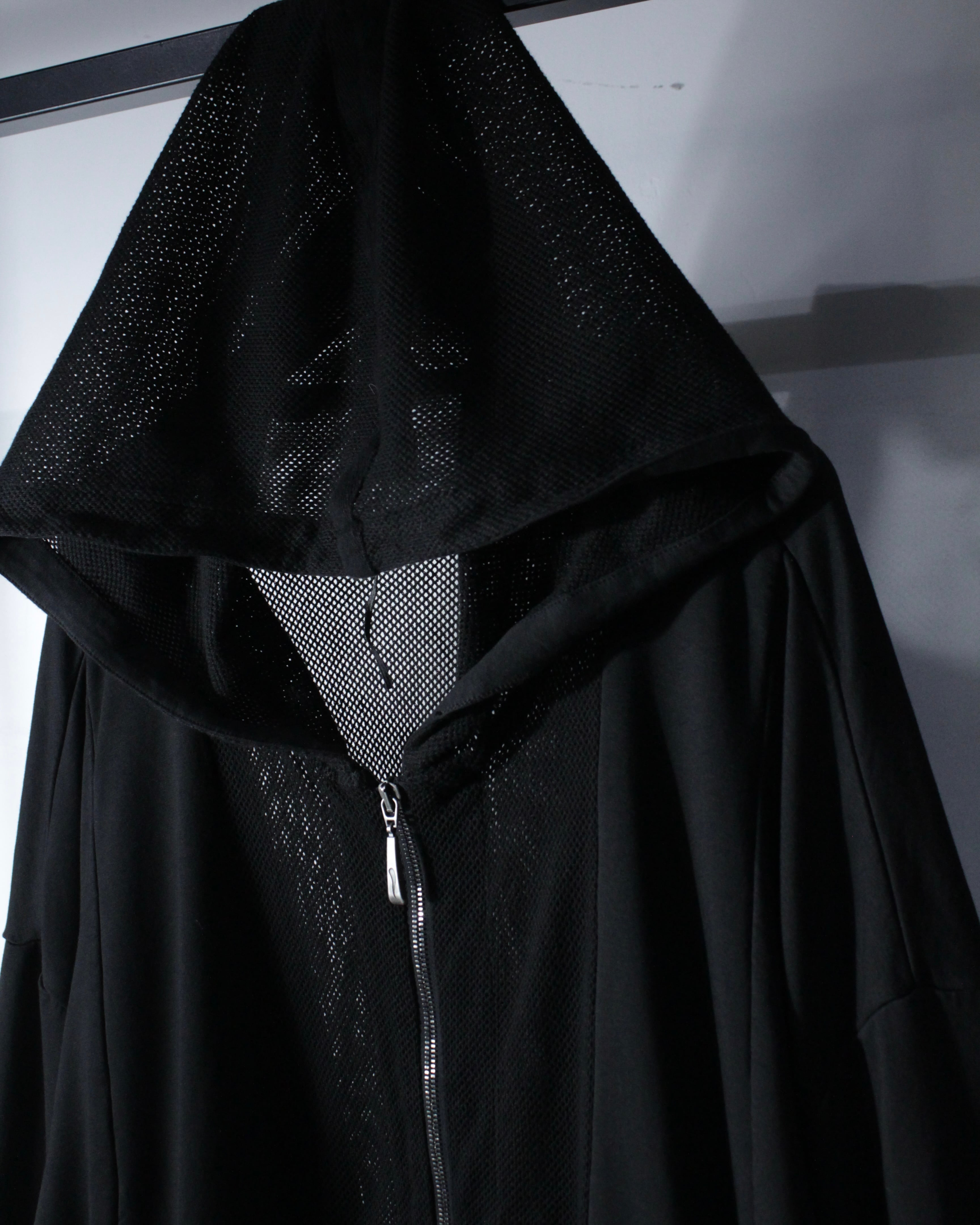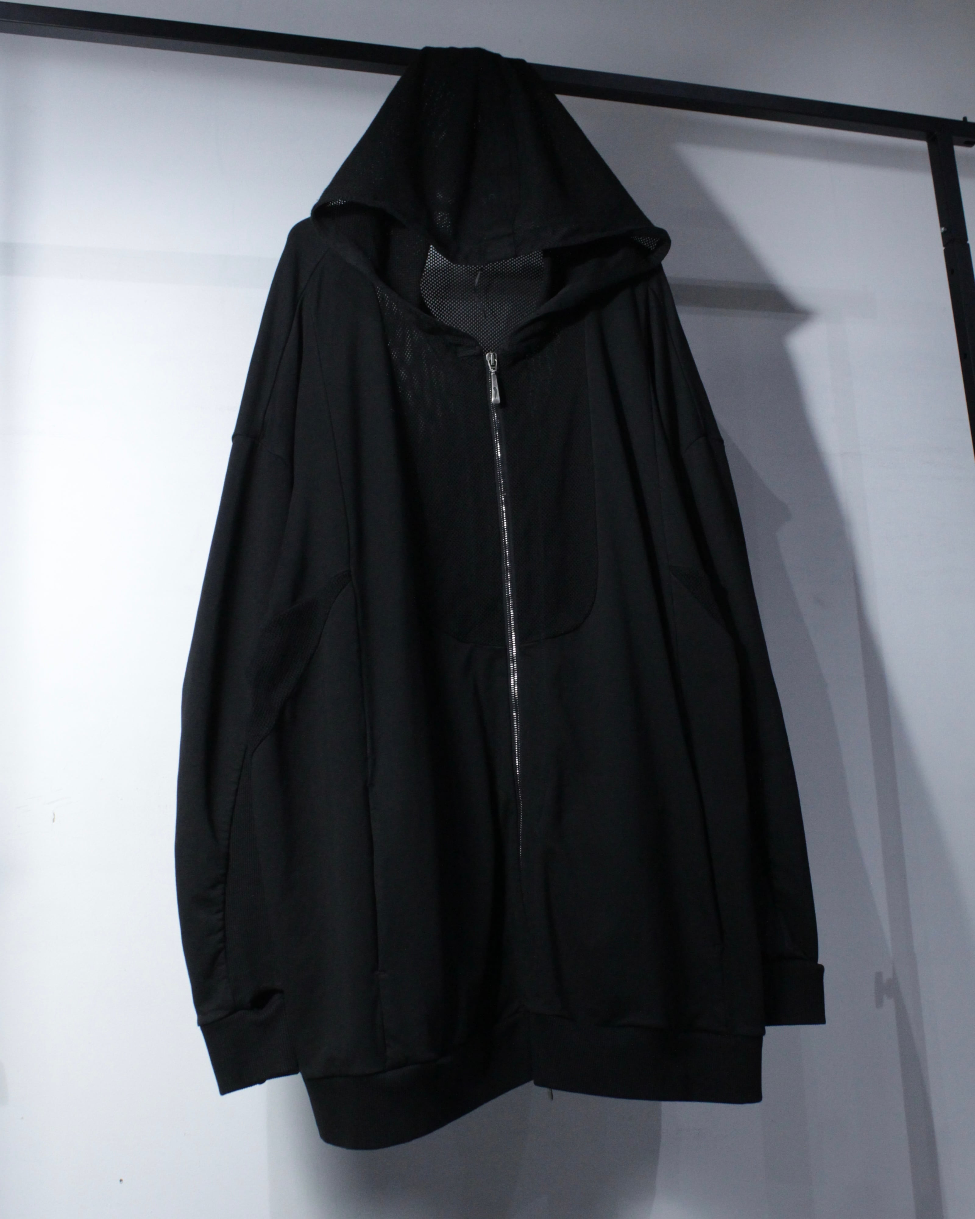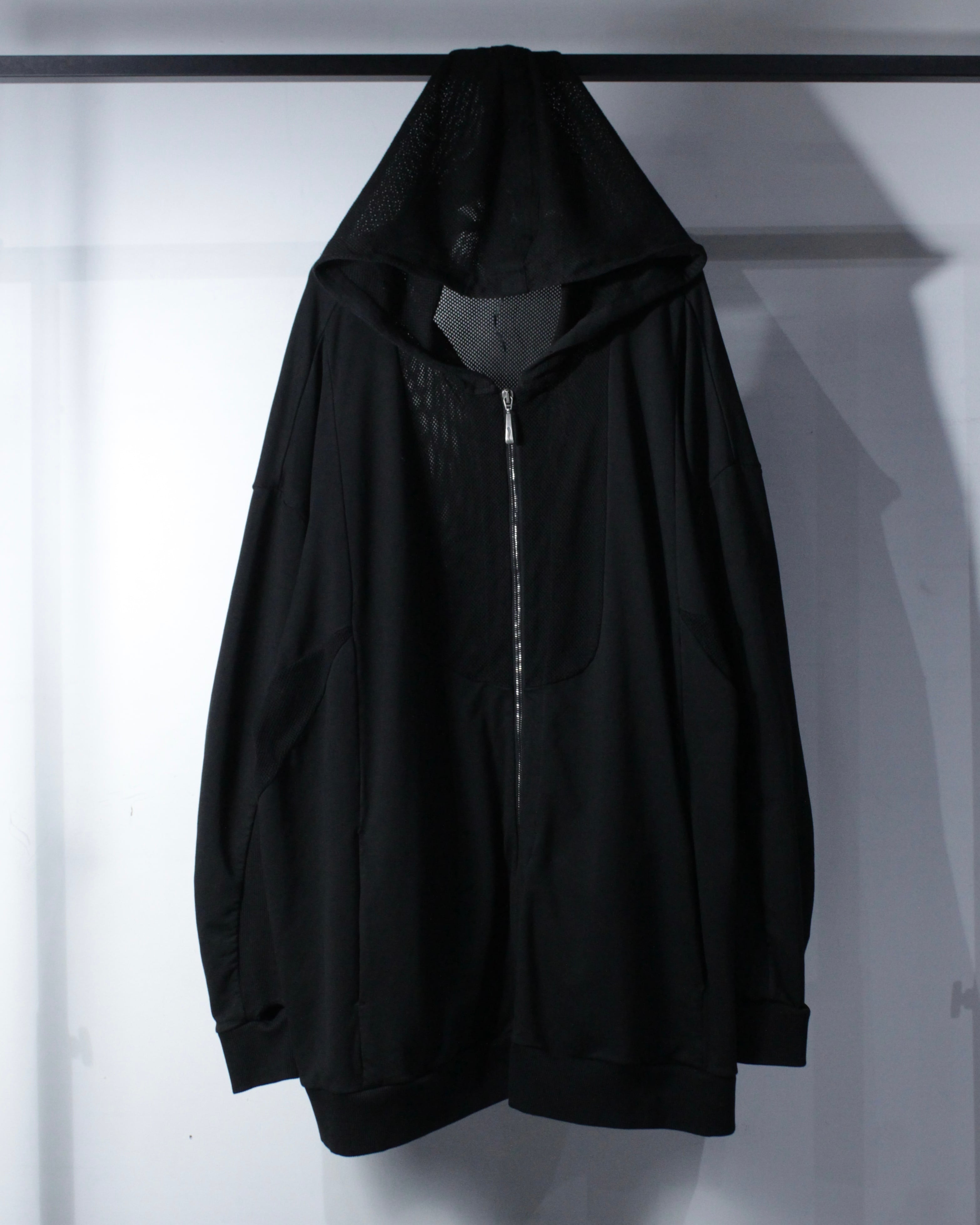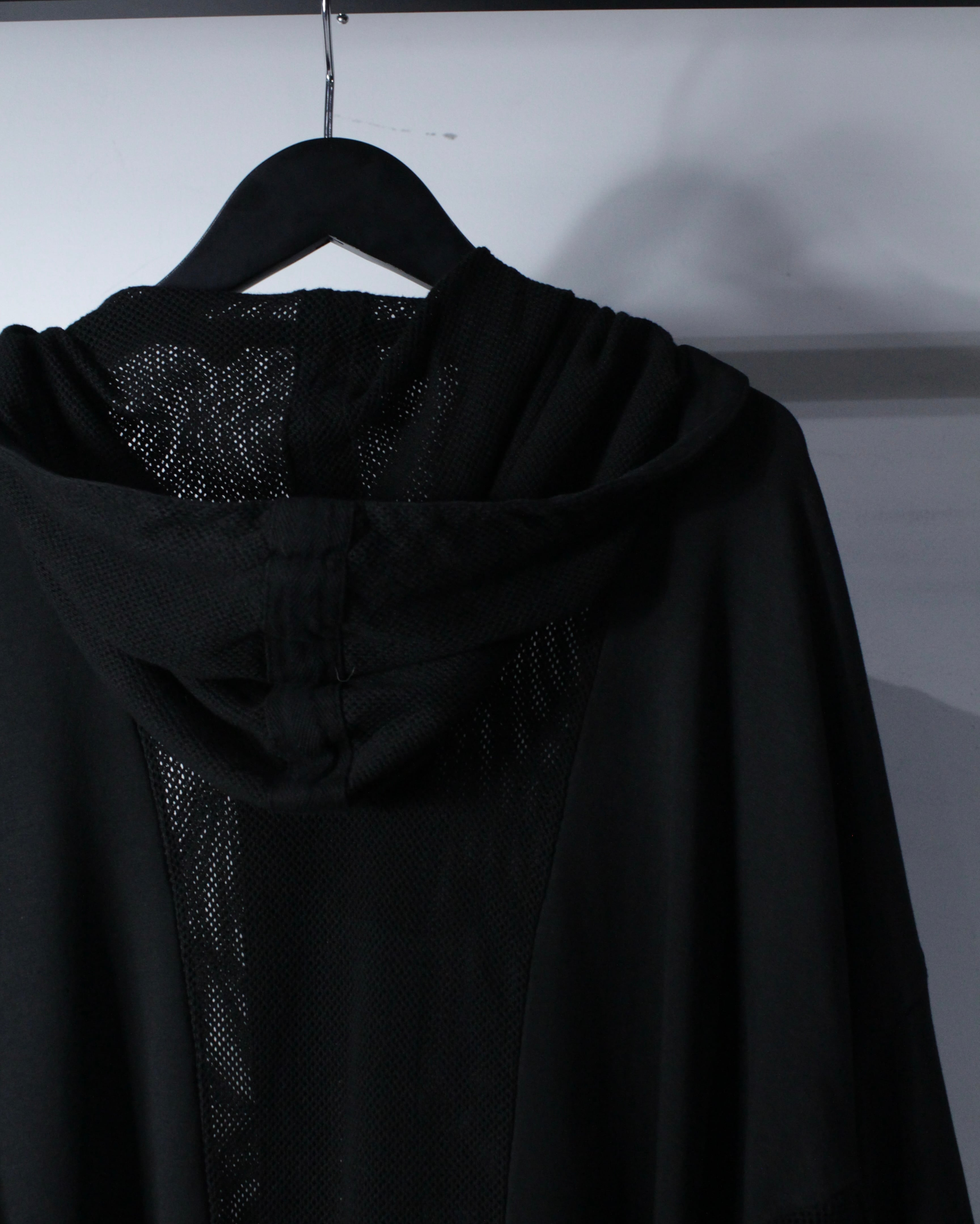 オールブラックで統一されたミニマルなボディに、背面からフードにかけて大胆にメッシュ切り替えを施した1着。ソリッドな雰囲気の中に、程良い透け感と軽快さを加えることで、単なるフーディに留まらないファッション性を感じさせる仕上がりとなっています