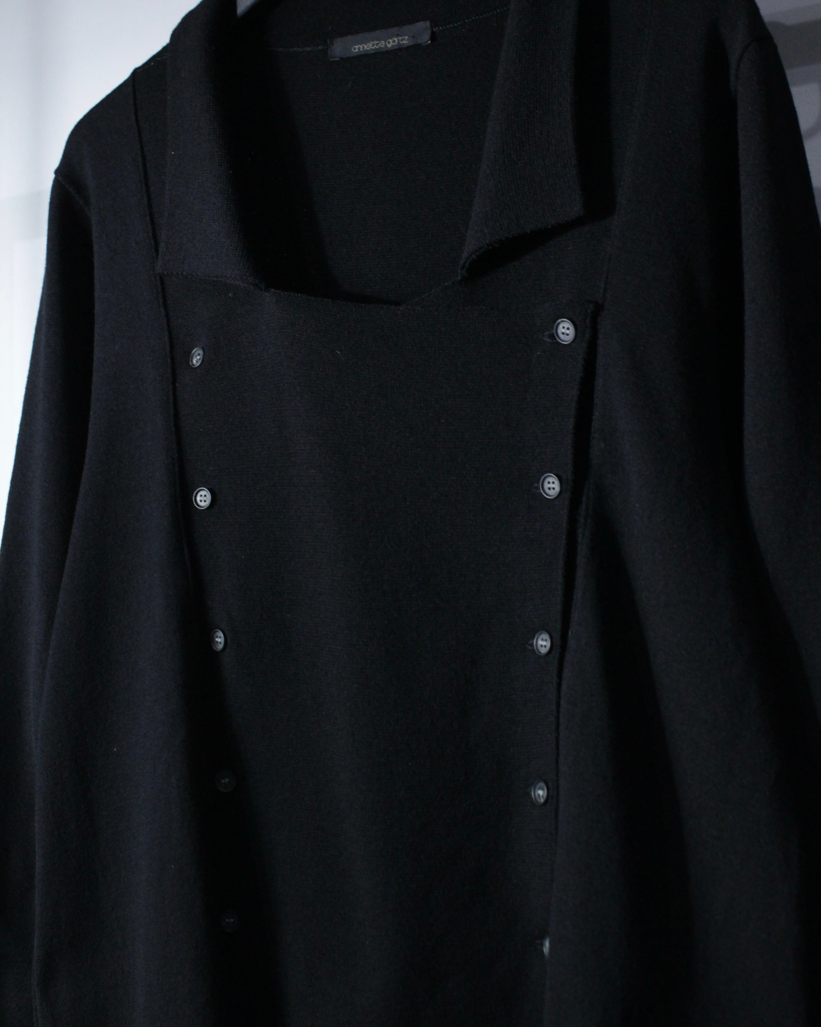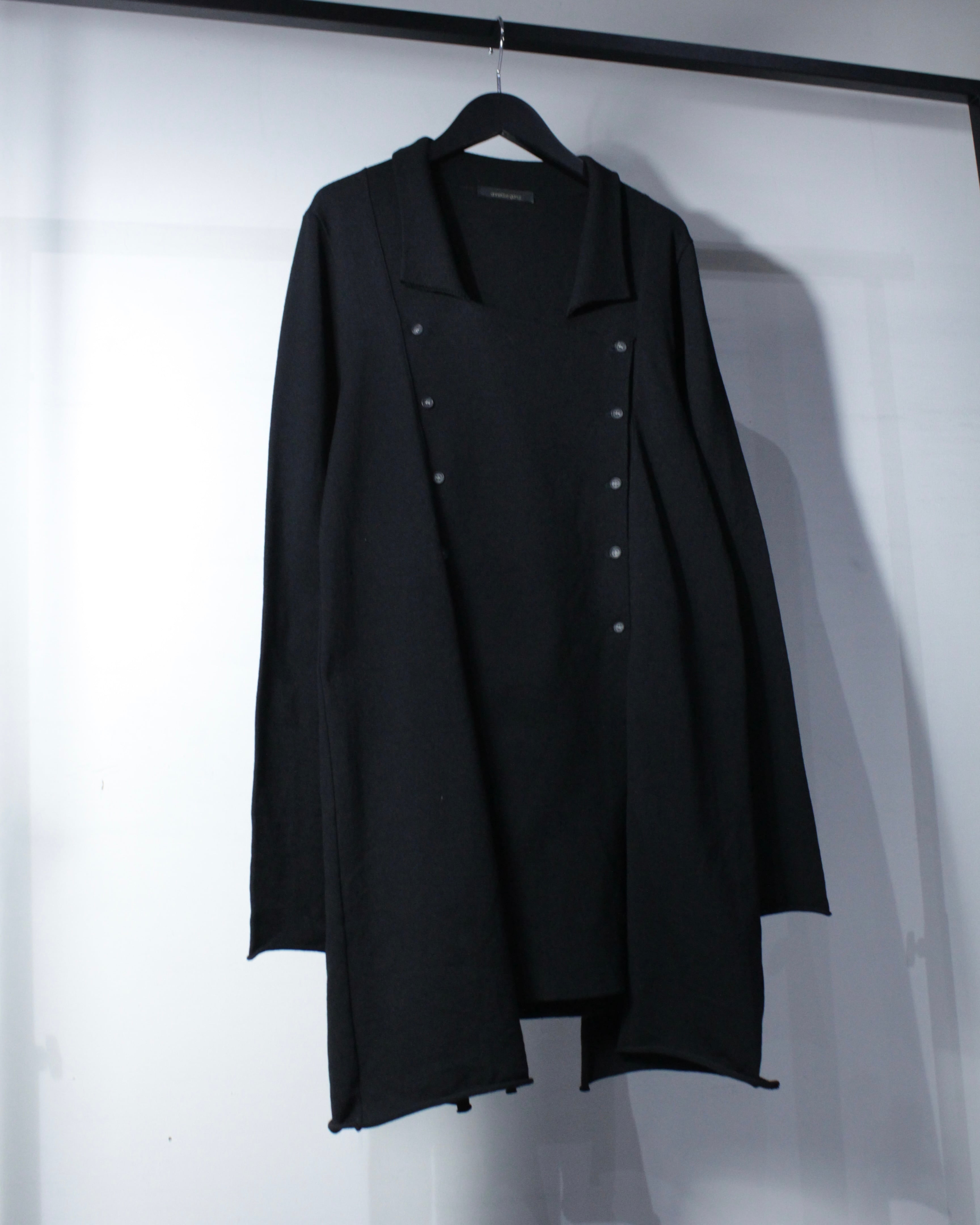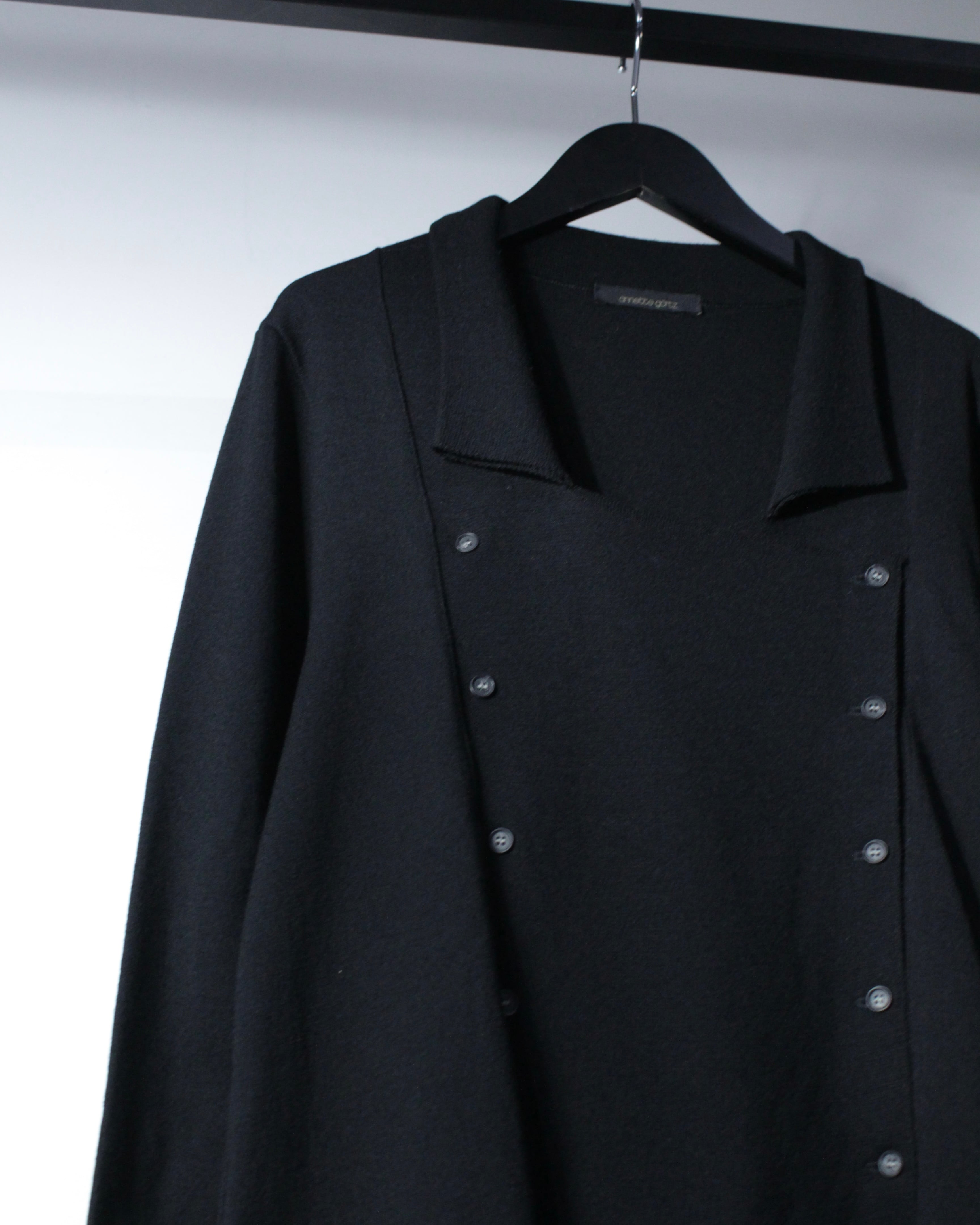 斜めに走る前立てに小ぶりなボタンを並べることで、クラシカルな空気感をモードへと昇華しています。広めに取られた襟元も相まって、着用時には独特なドレープと立体感を演出してくれるかと。