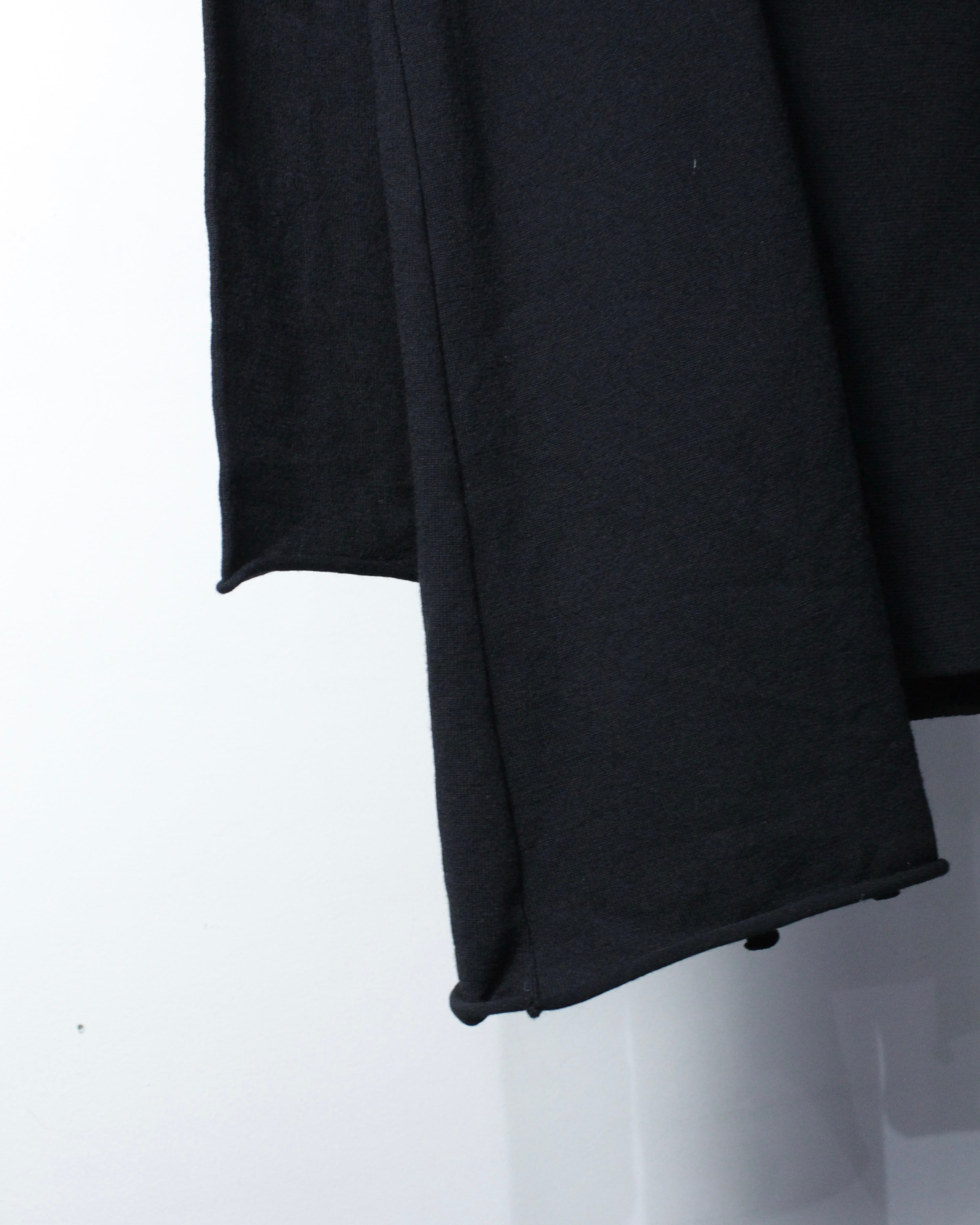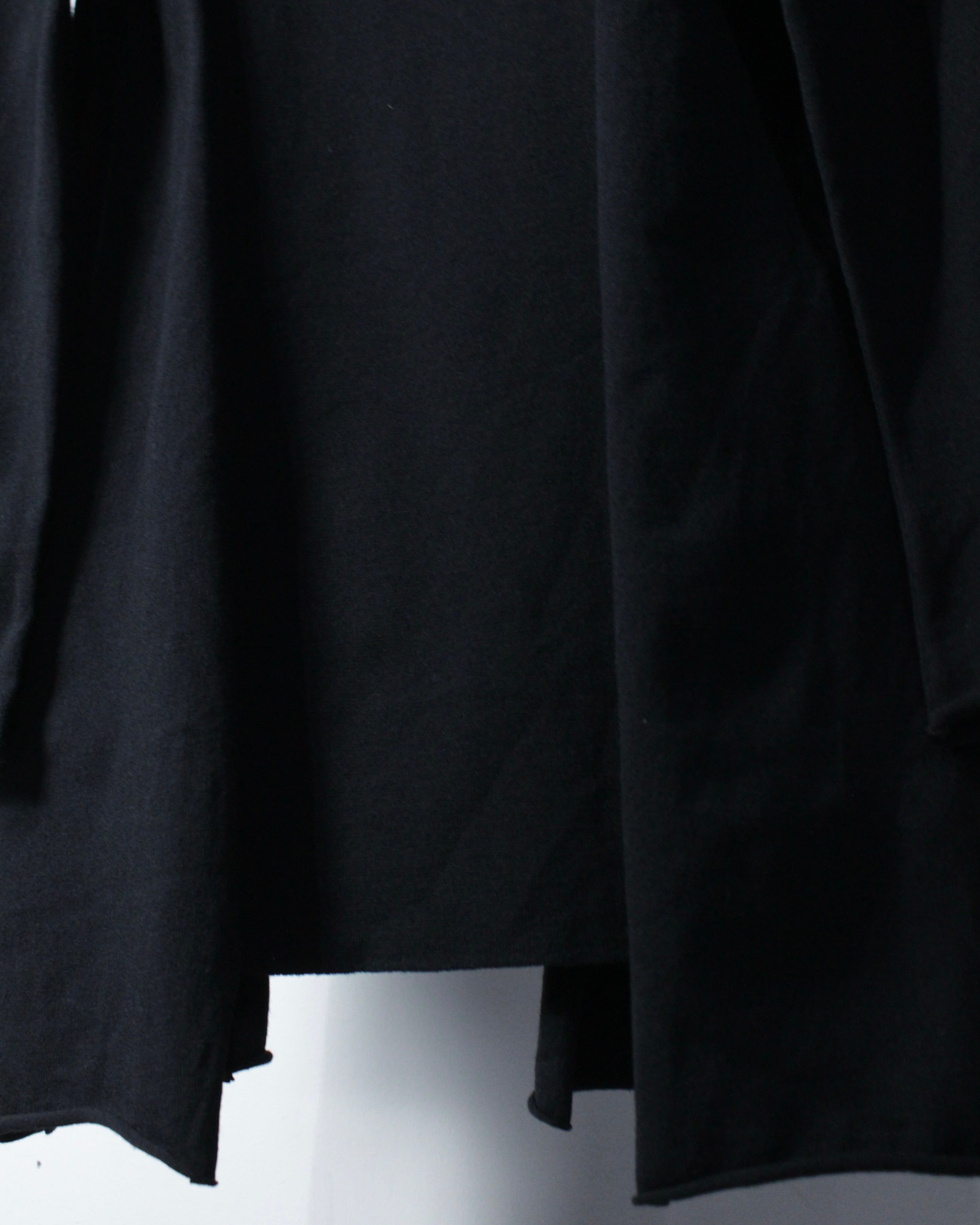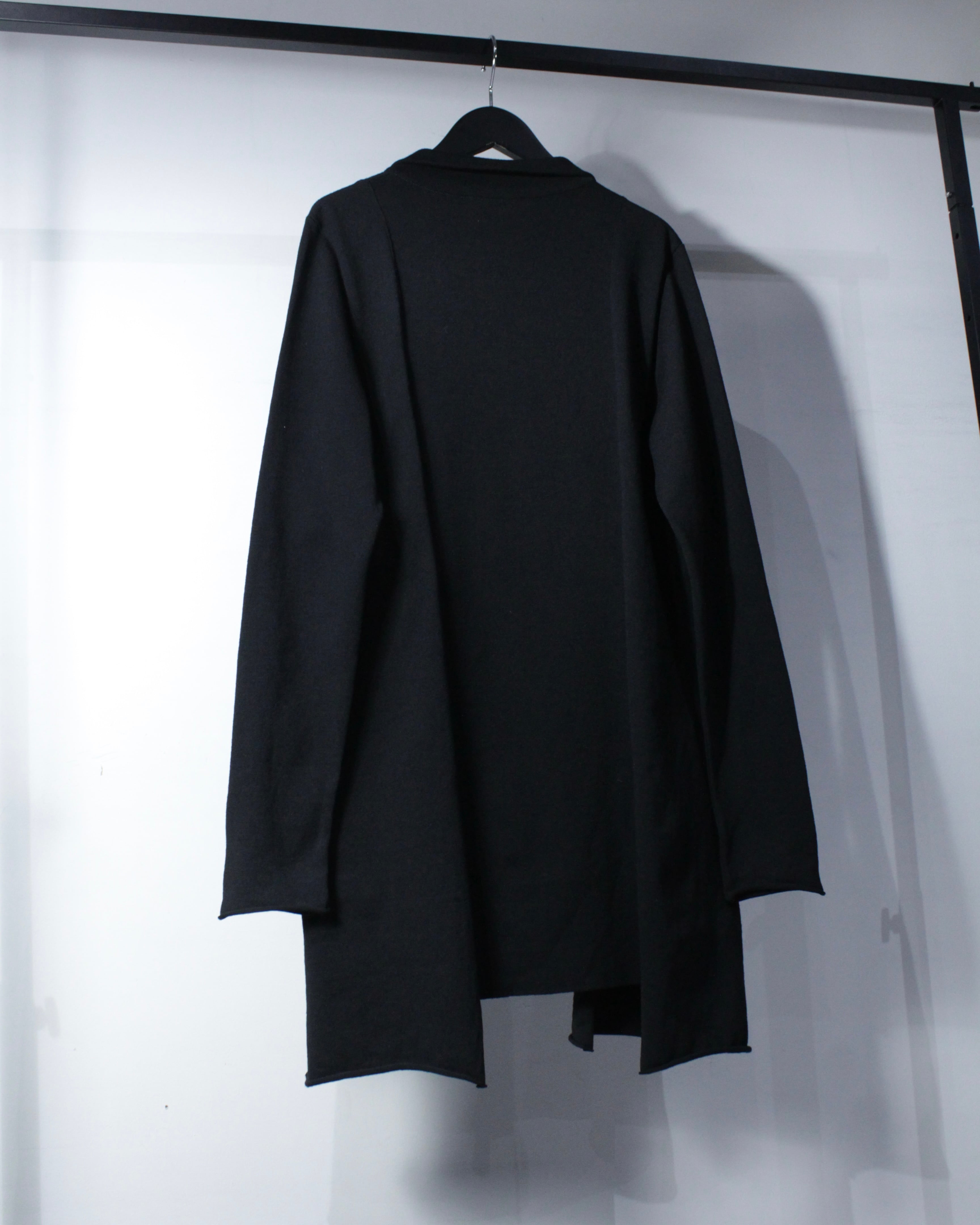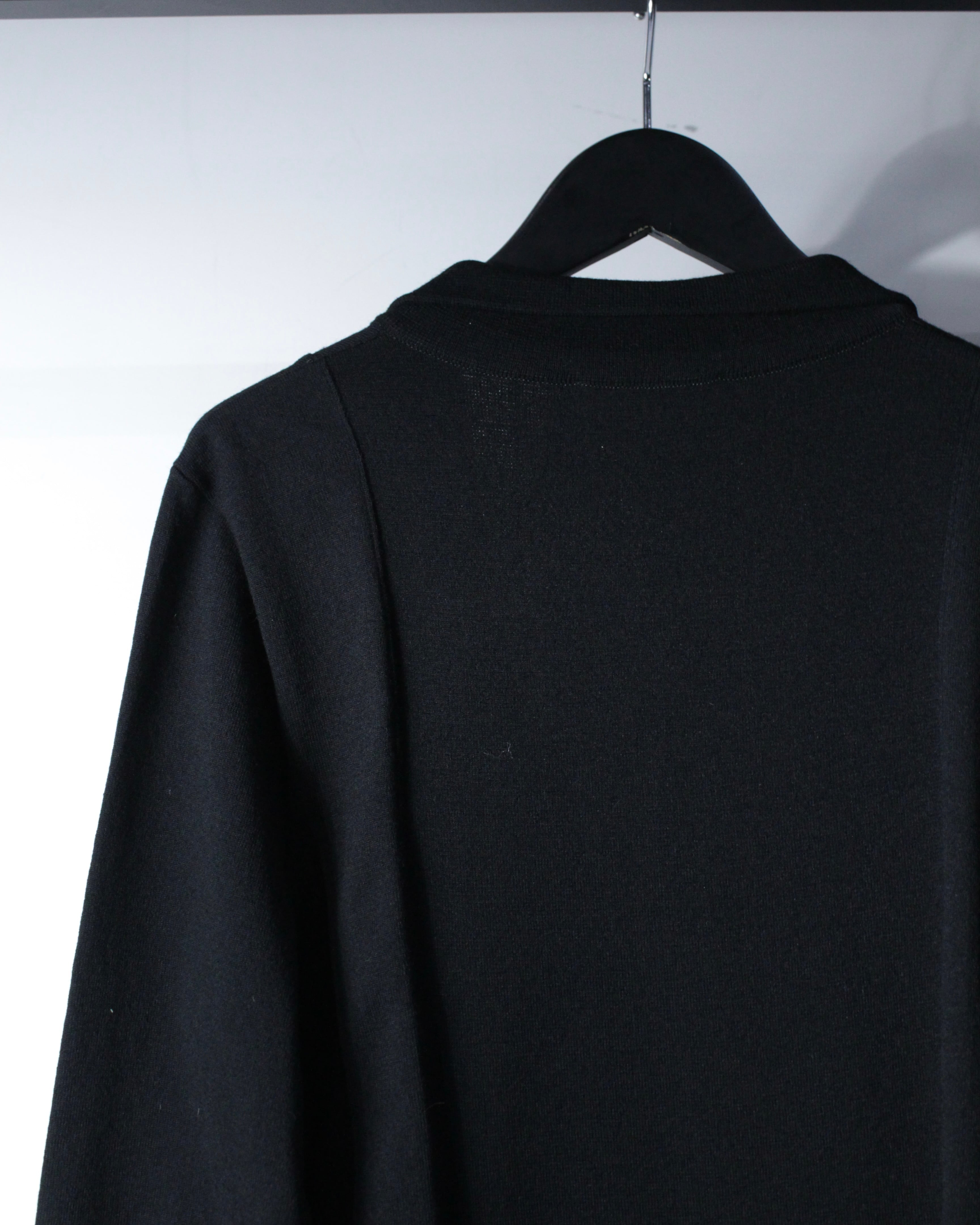 斜めに走る前立てに小ぶりなボタンを並べることで、クラシカルな空気感をモードへと昇華しています。広めに取られた襟元も相まって、着用時には独特なドレープと立体感を演出してくれるかと。