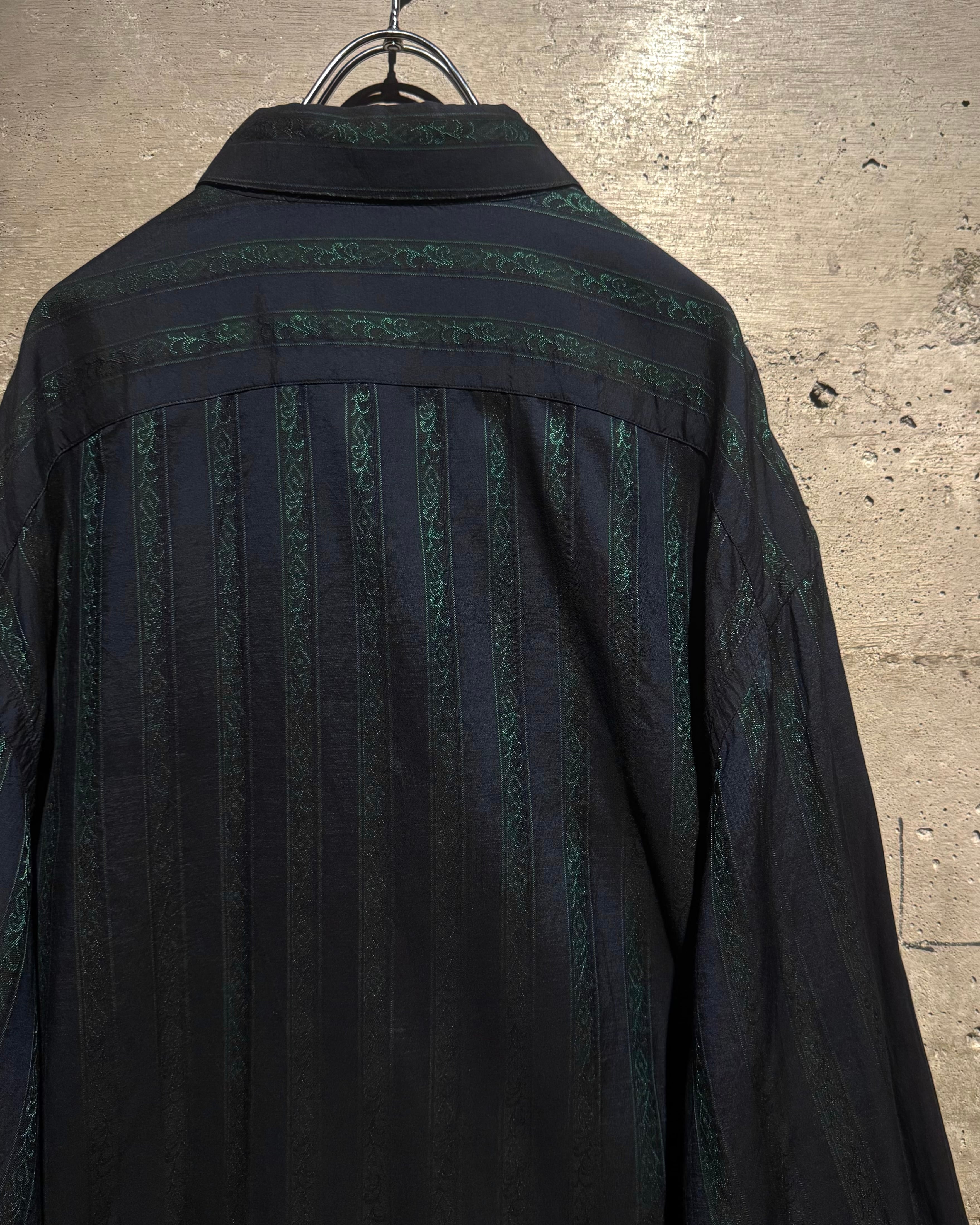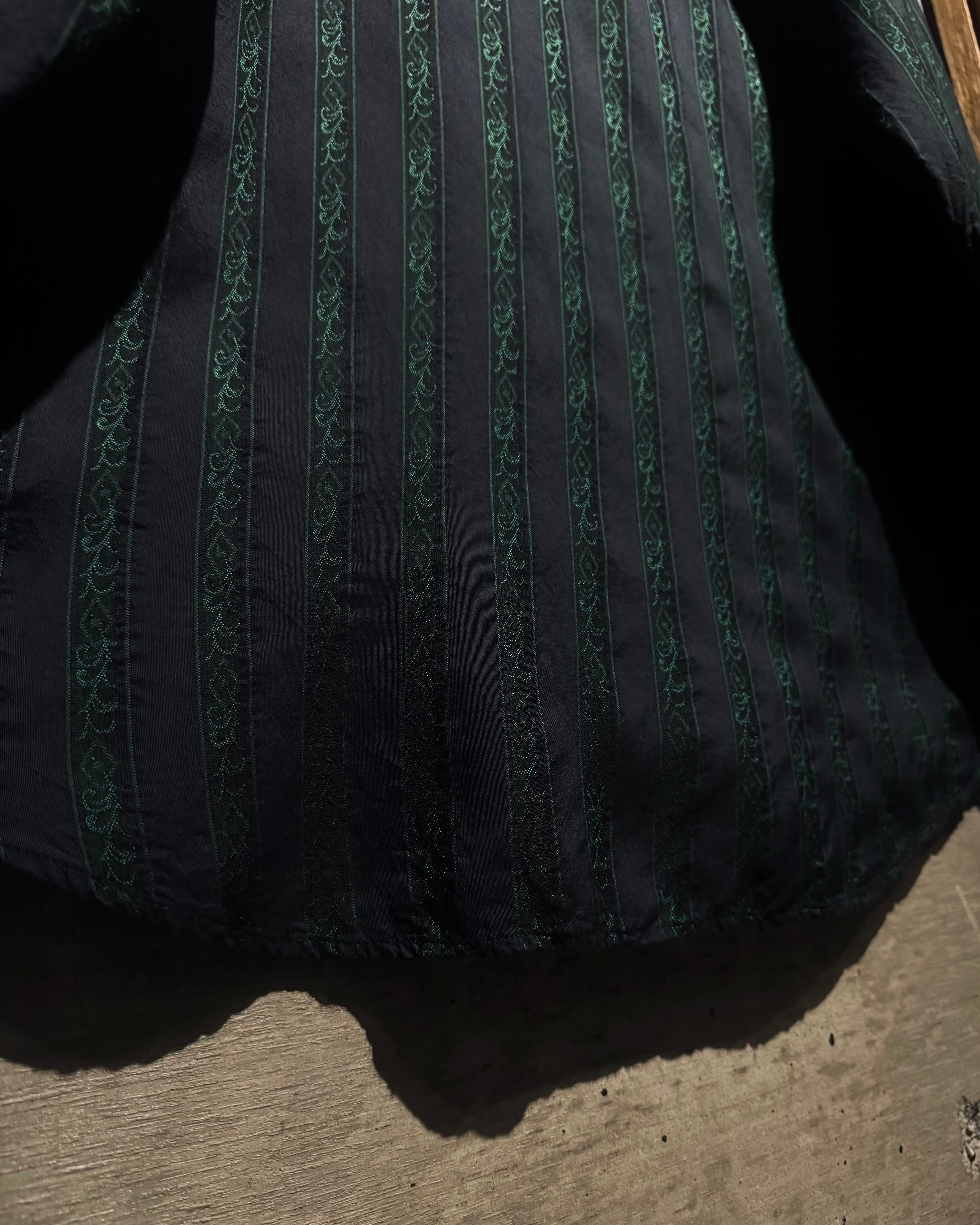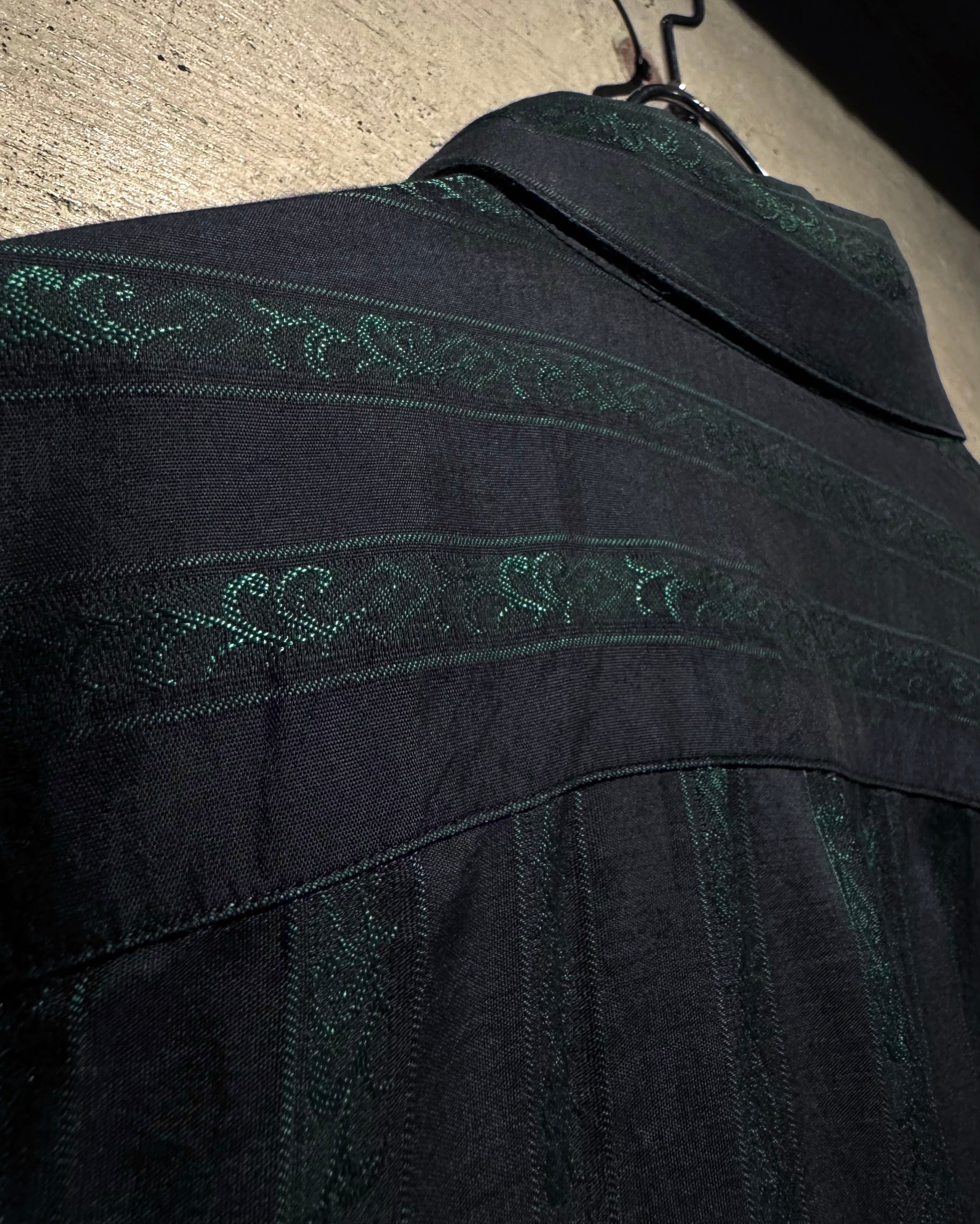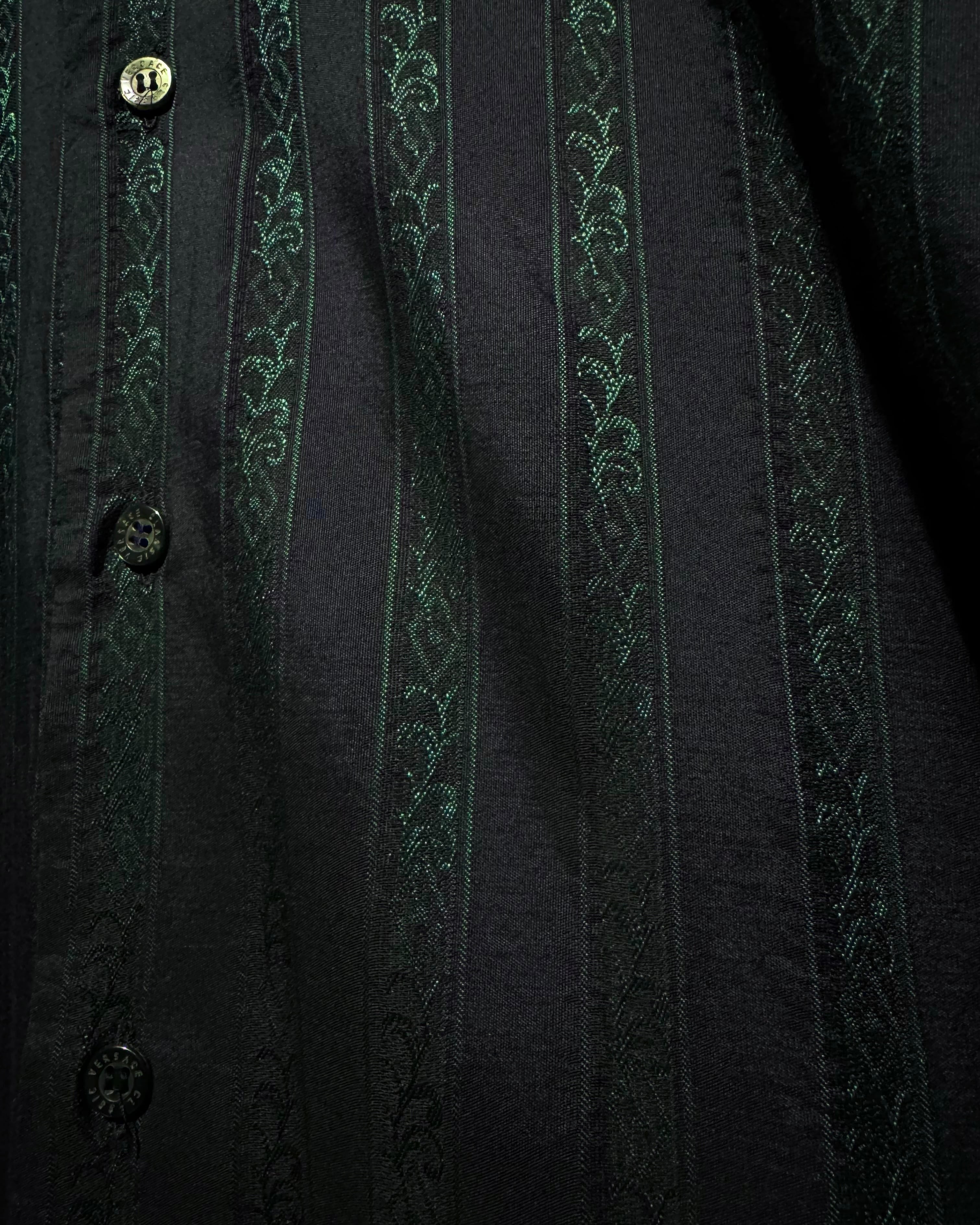 深みのあるネイビーボディをベースに、グリーンのジャガード織りでボタニカル調のストライプパターンを全面に配置した1着。