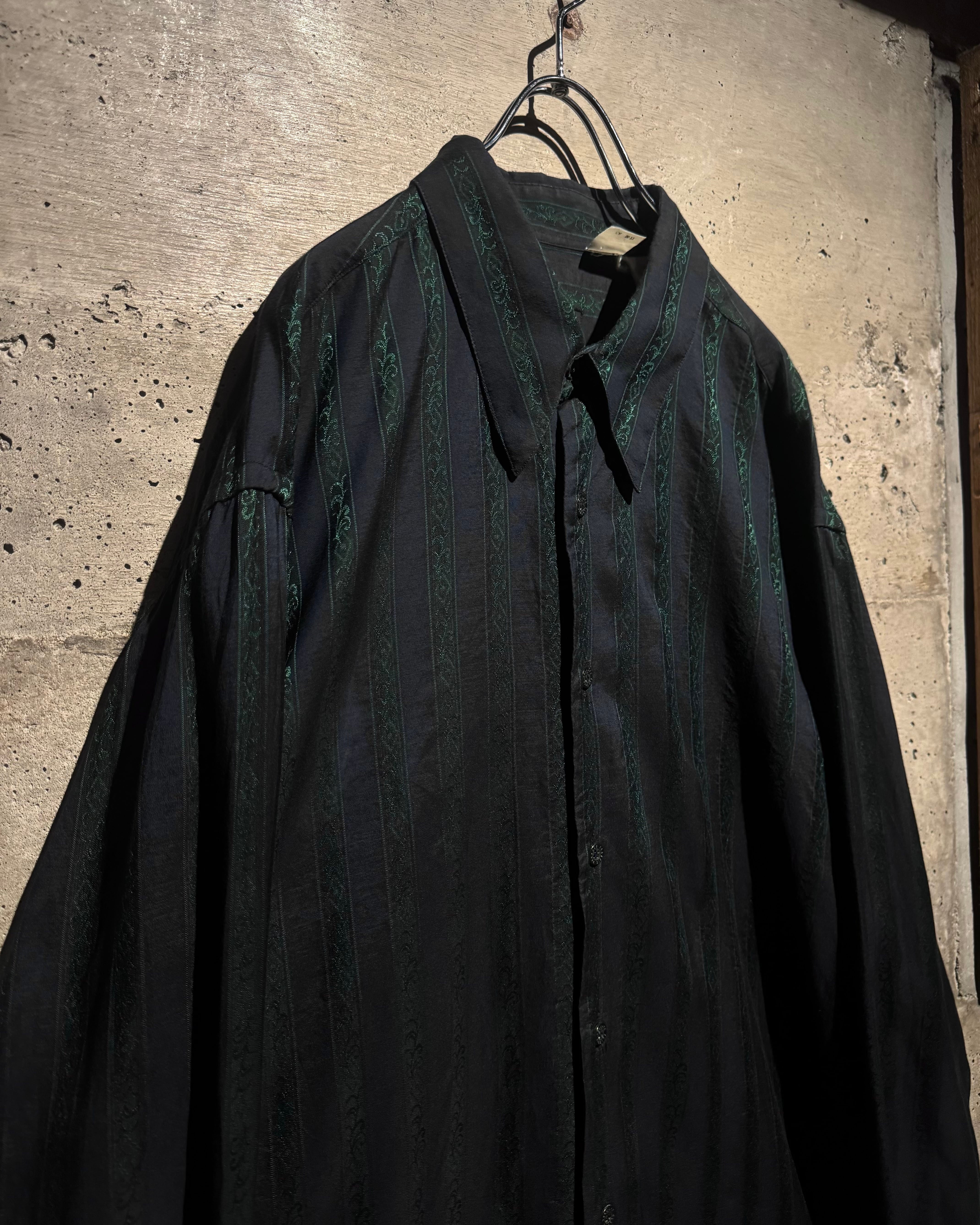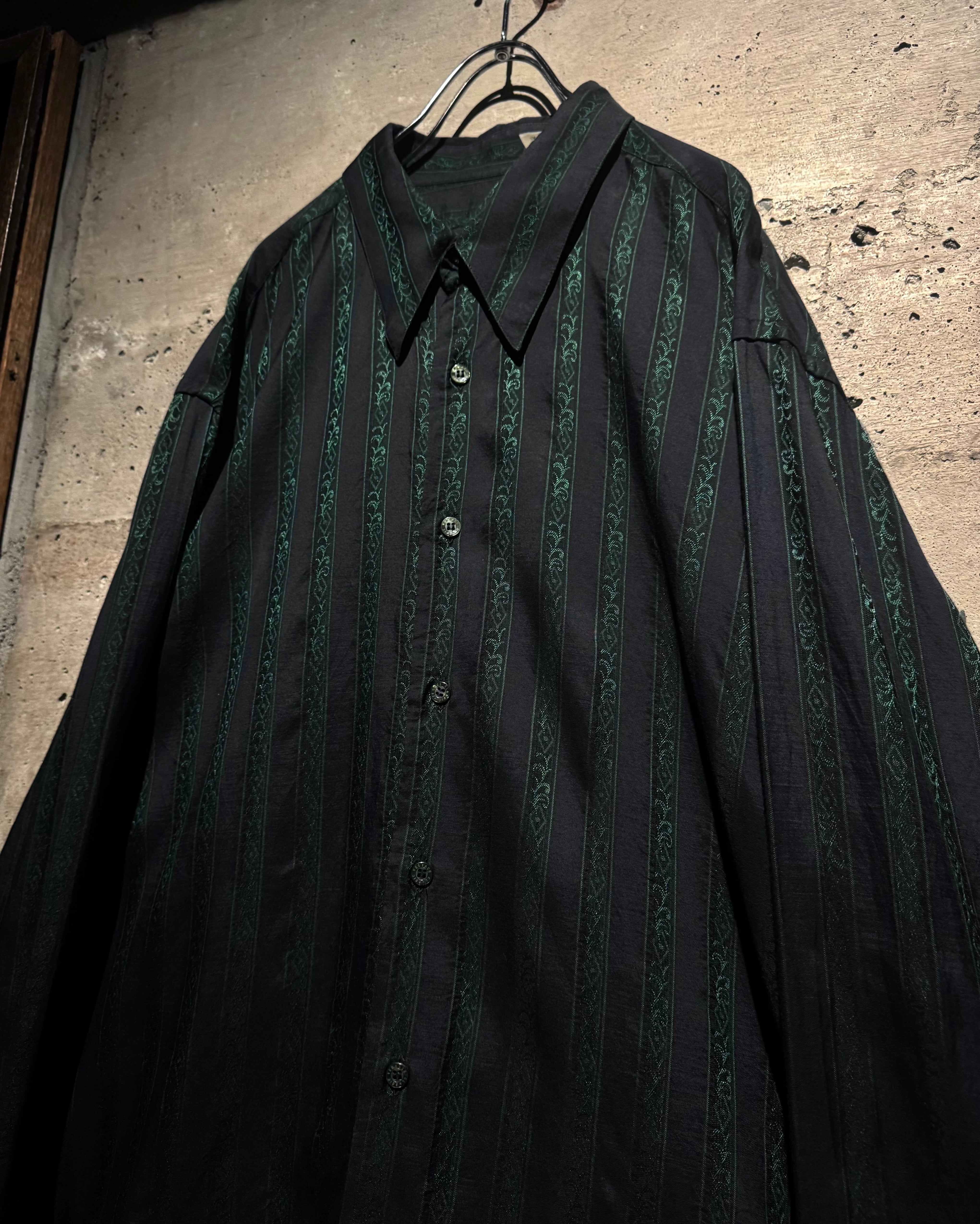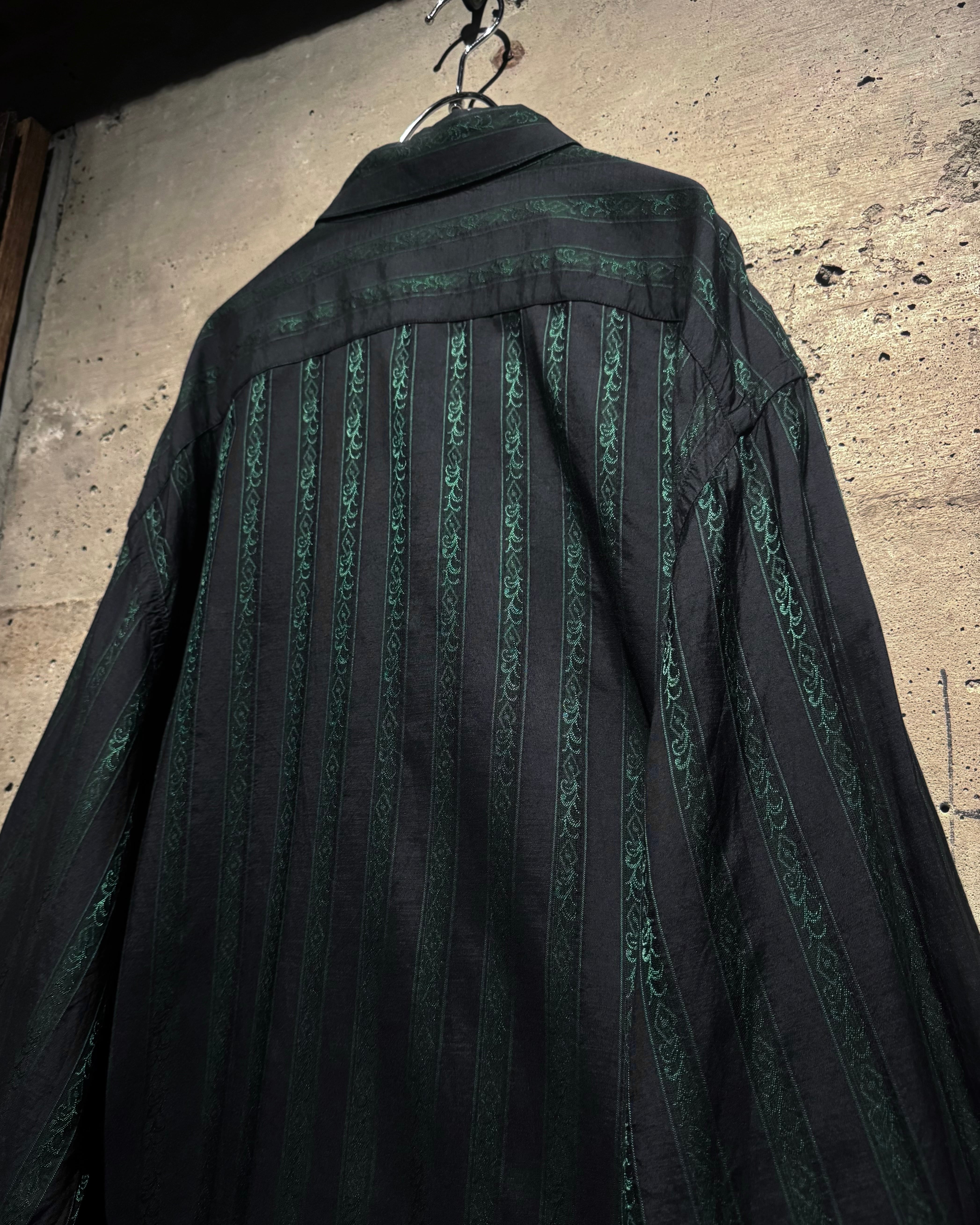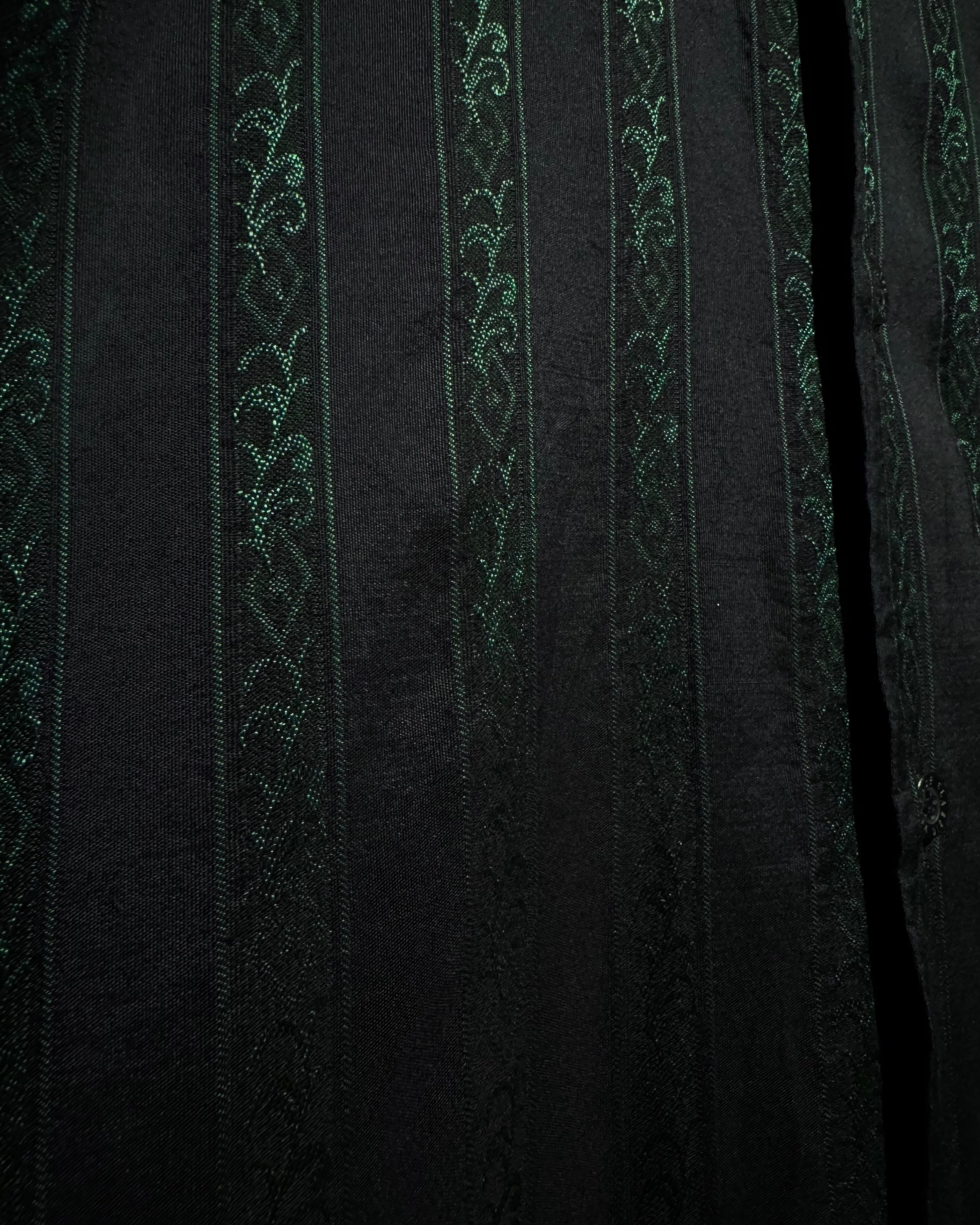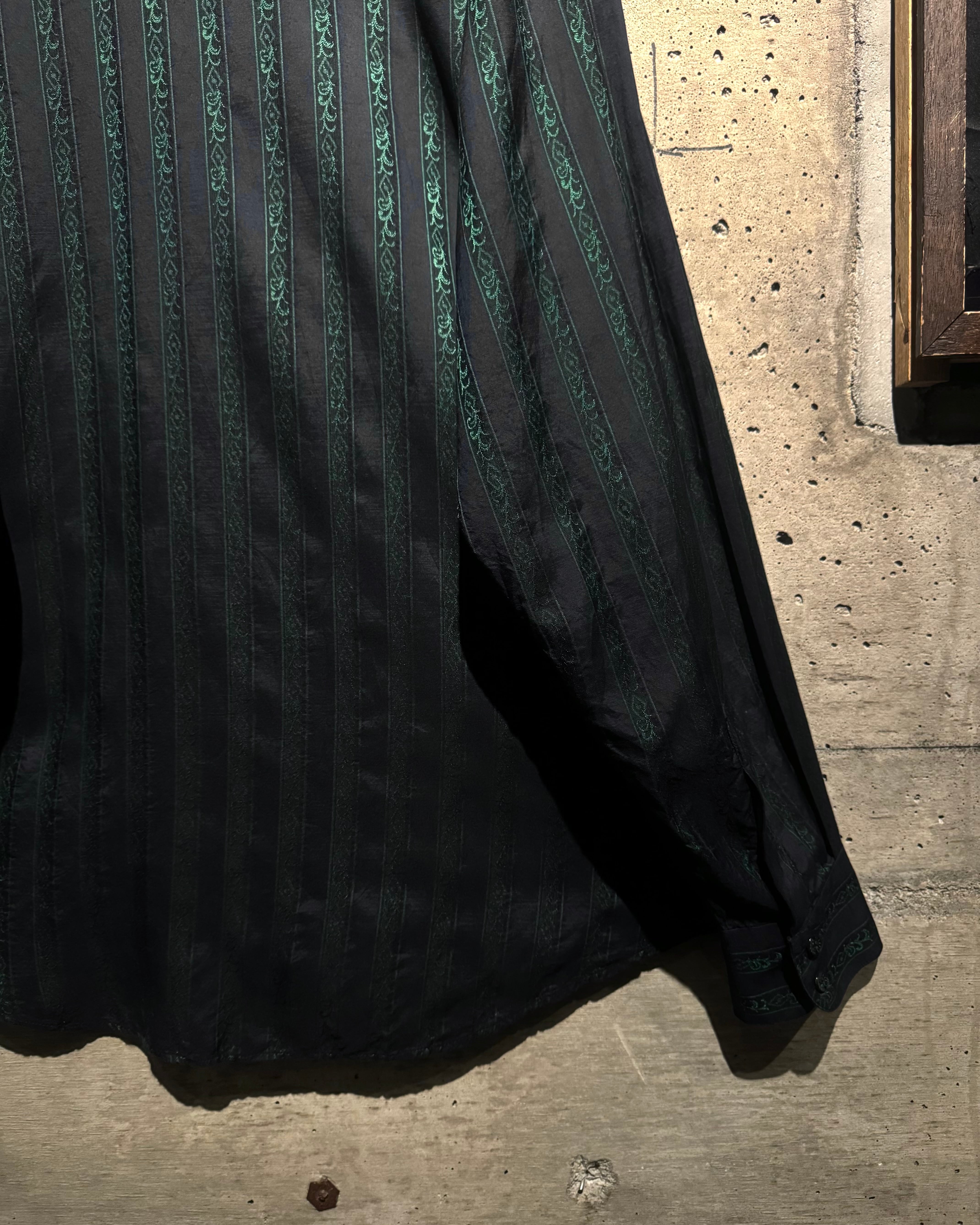 深みのあるネイビーボディをベースに、グリーンのジャガード織りでボタニカル調のストライプパターンを全面に配置した1着。