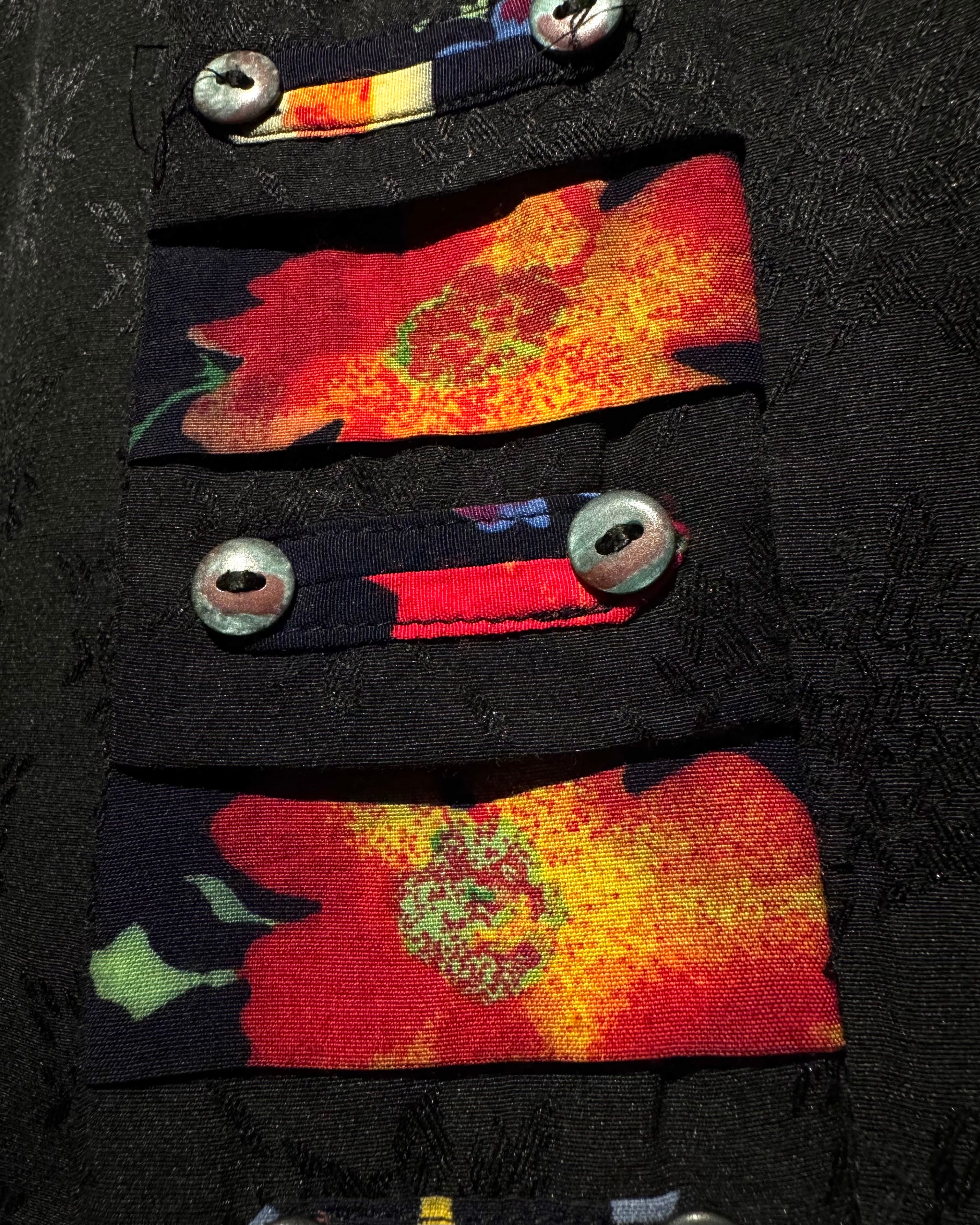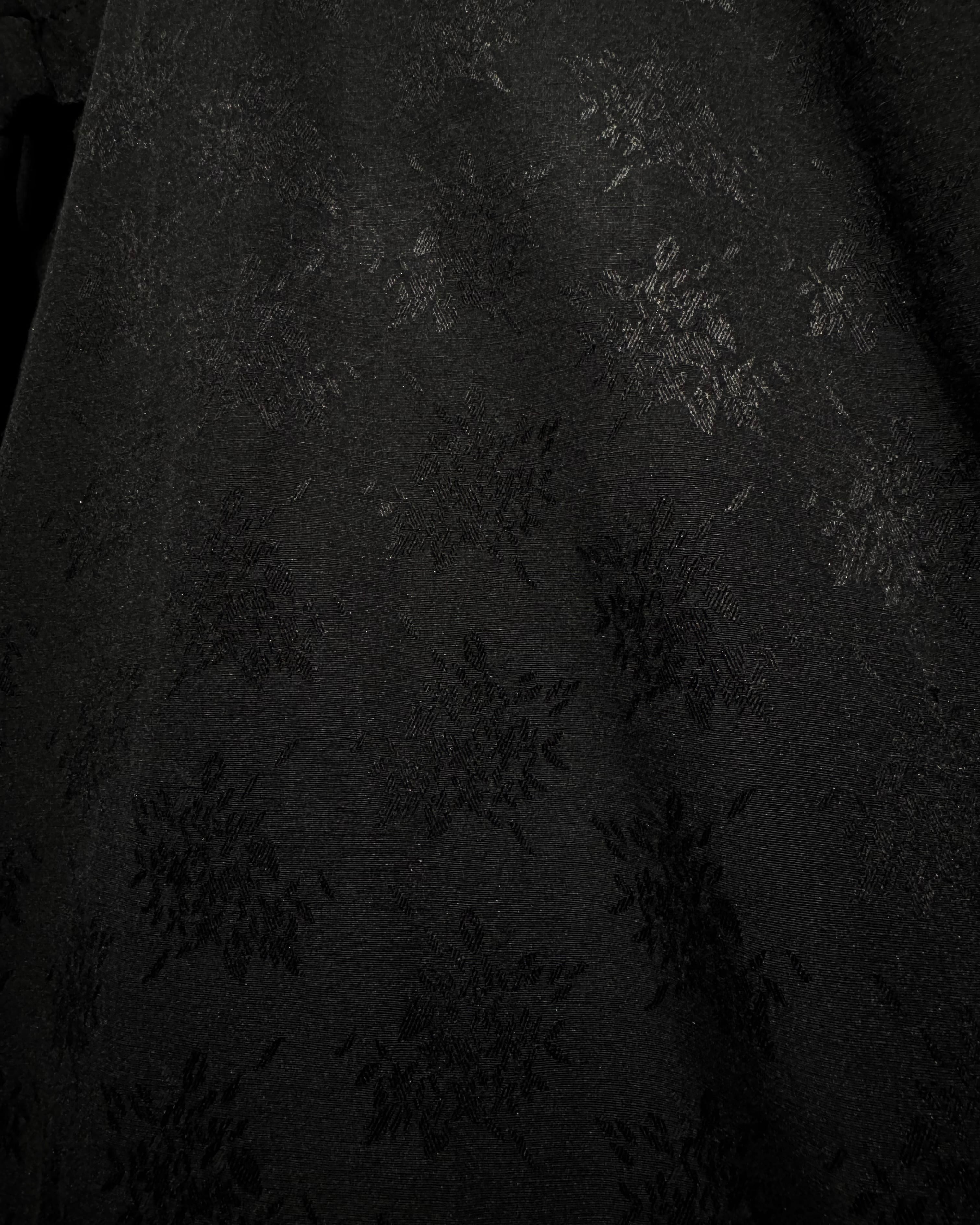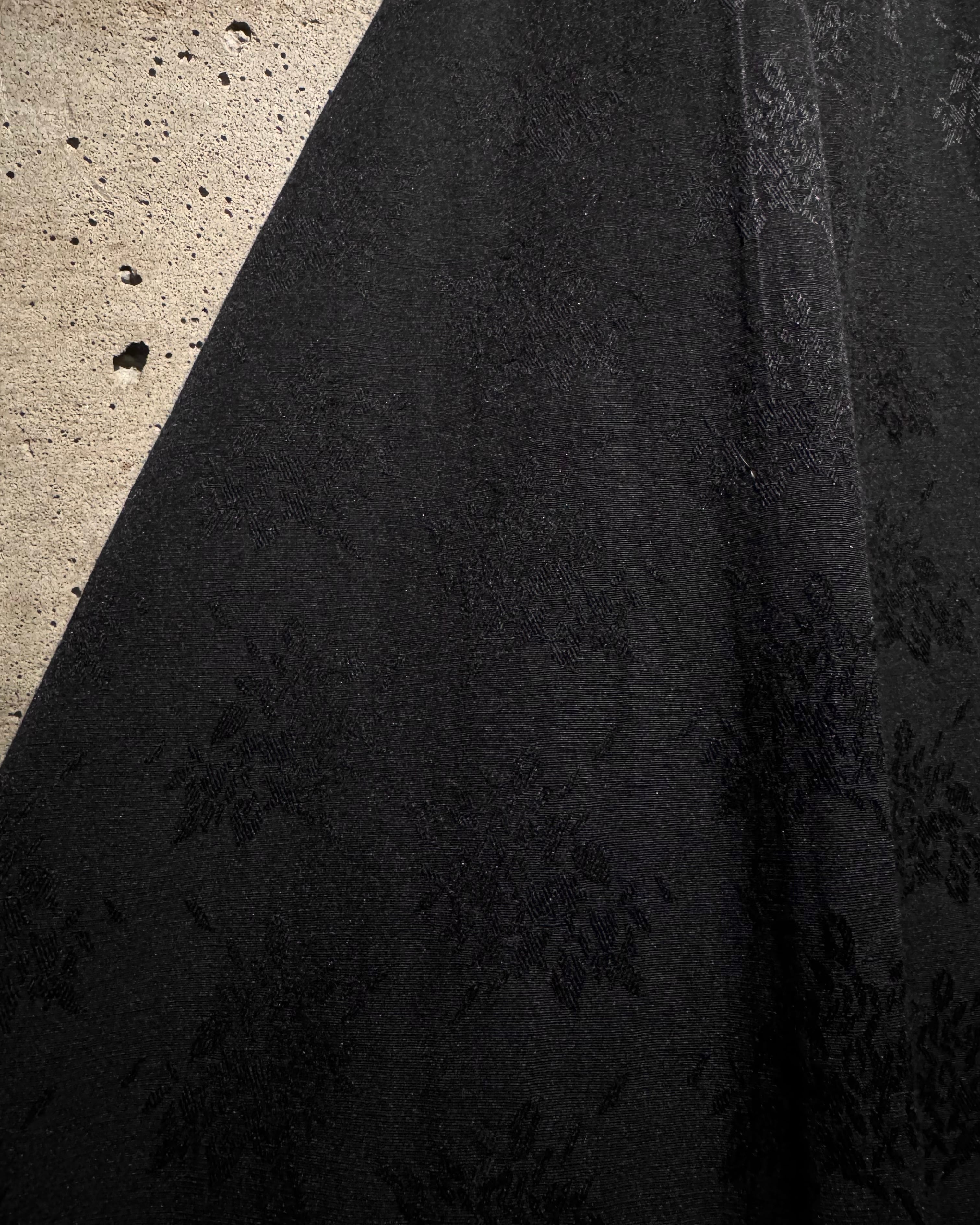 光の当たり方によって柄が浮かび上がる、ジャガード織りの奥行きのある表情に加え、鮮やかな花柄がブラックベースのボディに映える、完成度の高い非常に美しい仕上がりを見せています。