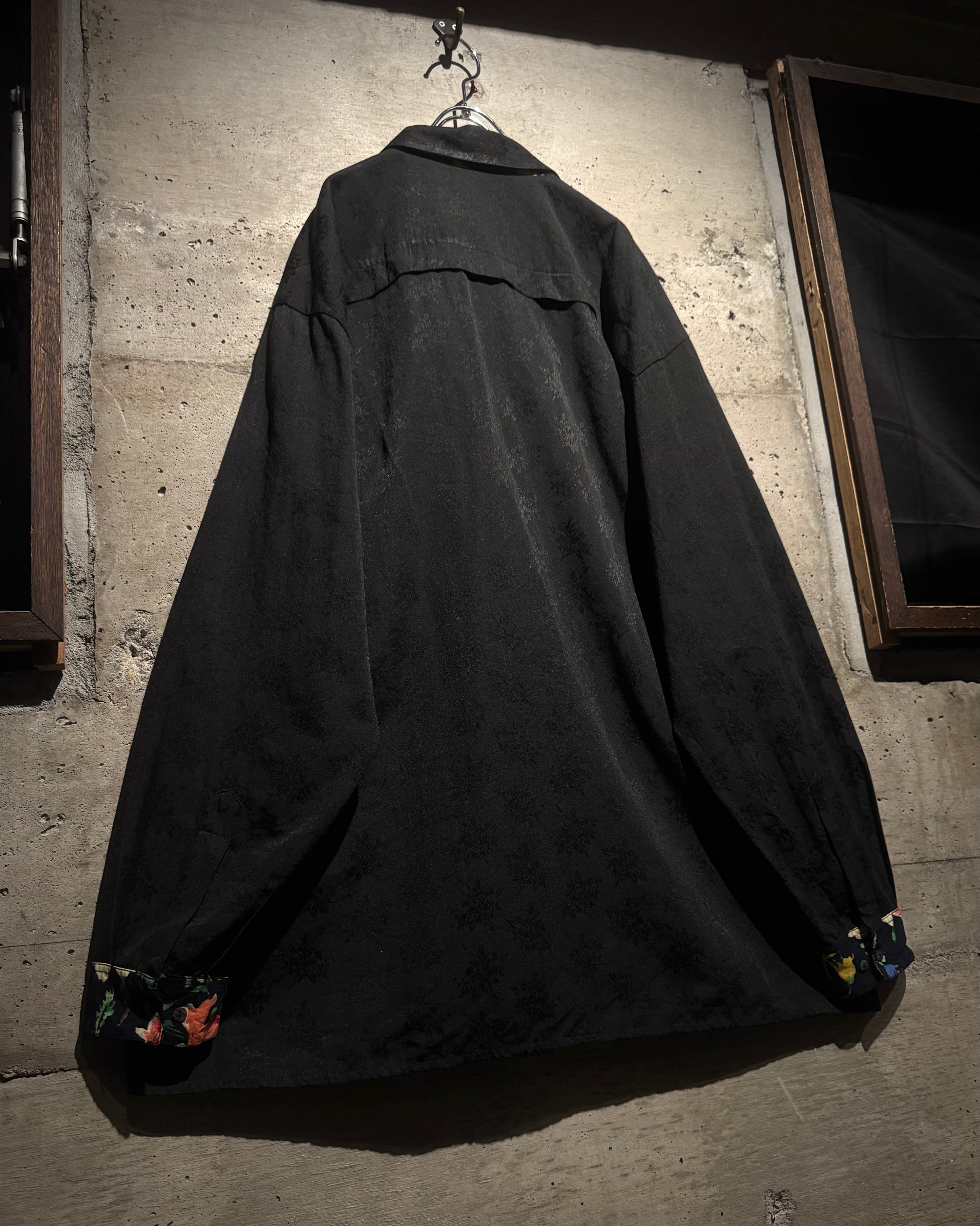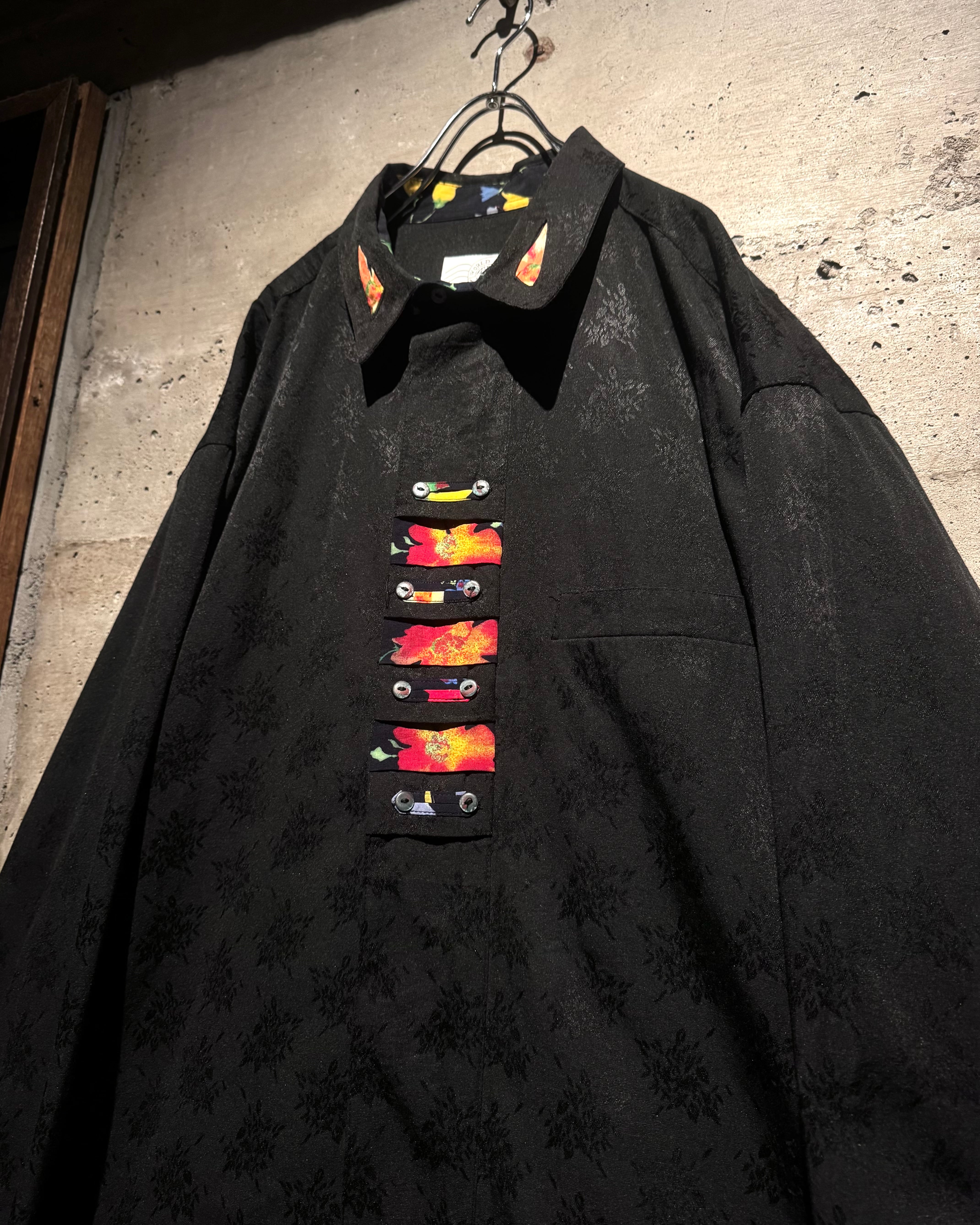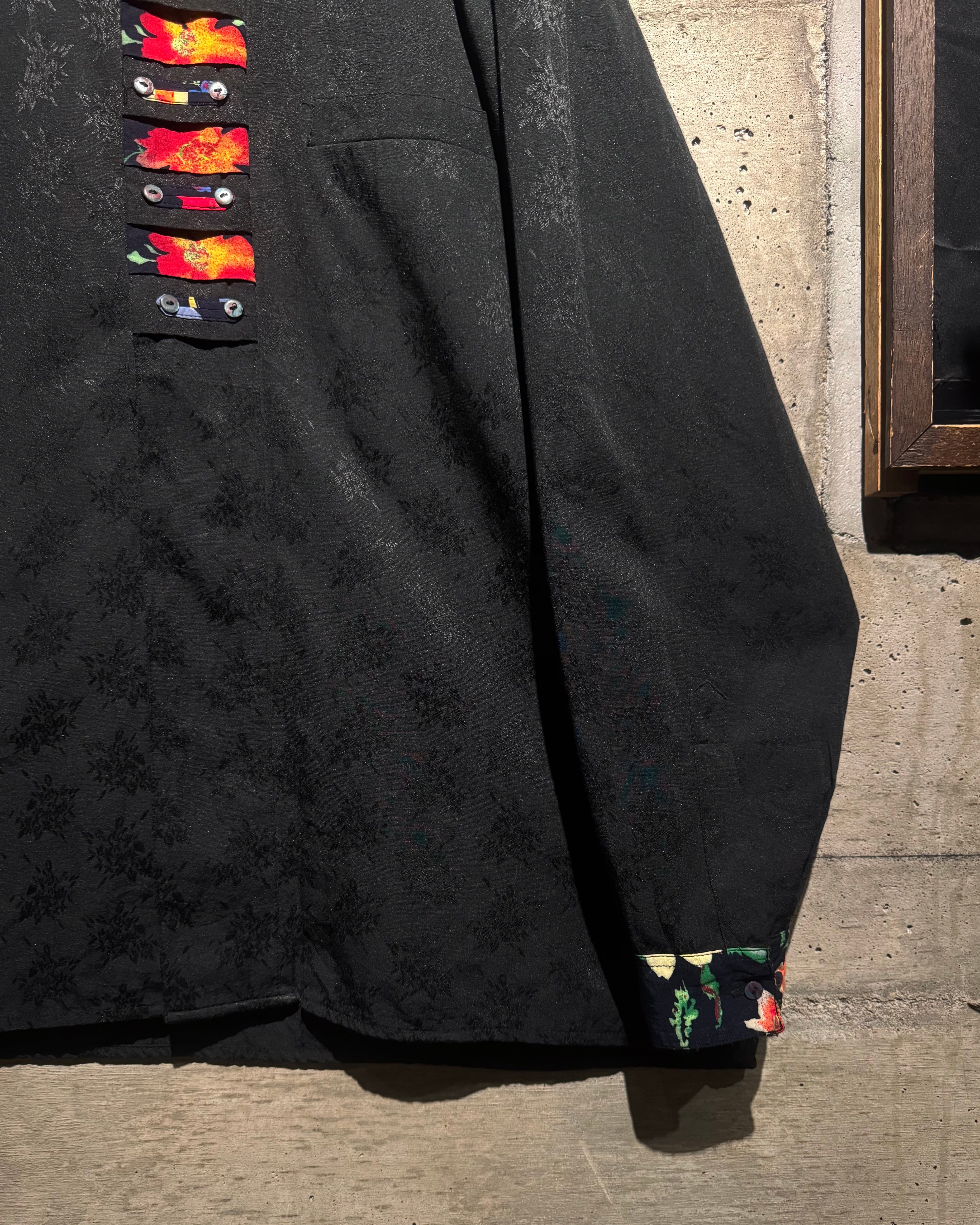ジャガード織りによってボディ全面に花柄を落とし込み、襟やカフス、前立て部分に異なるフラワーパターンの切り替えを施した1着。