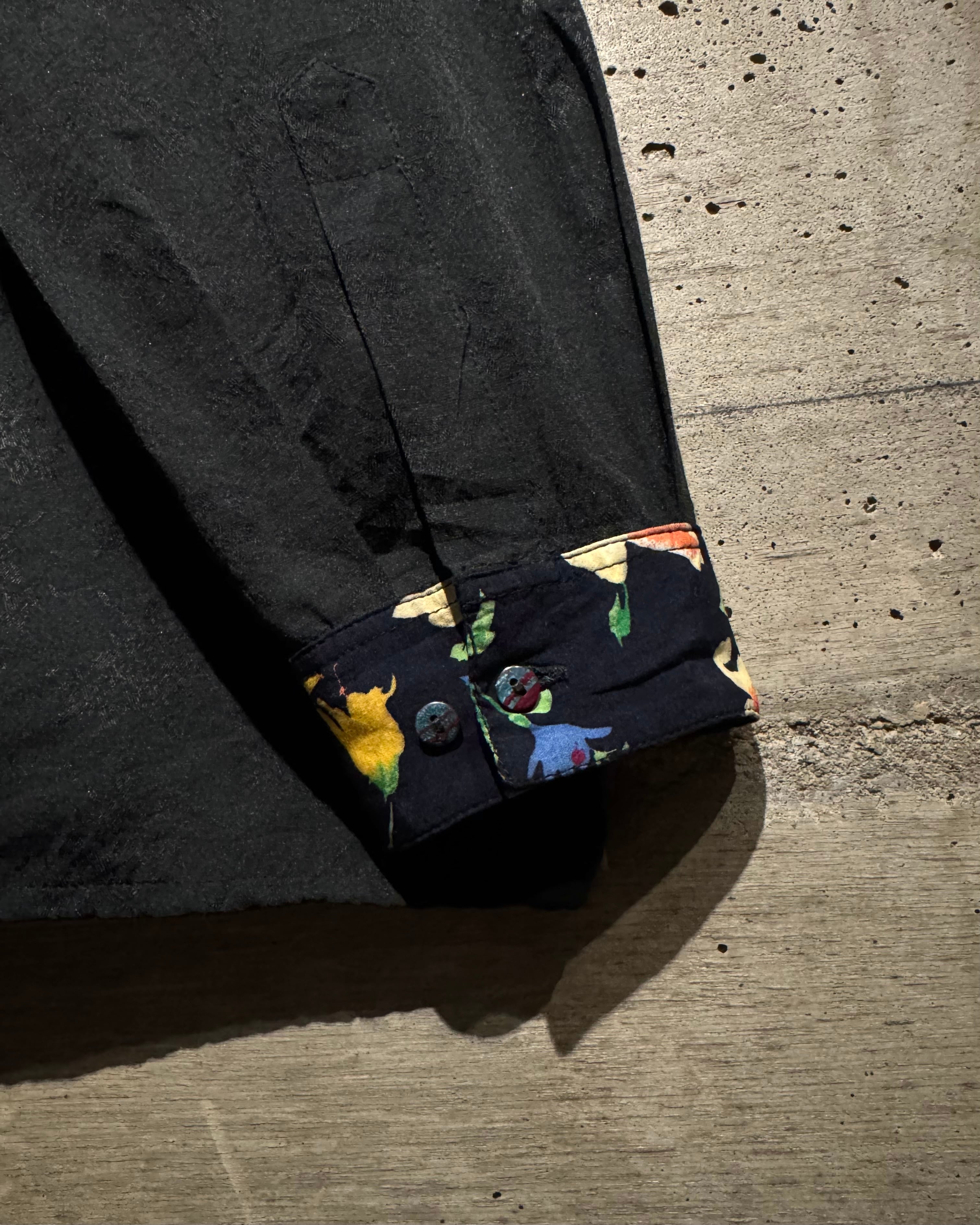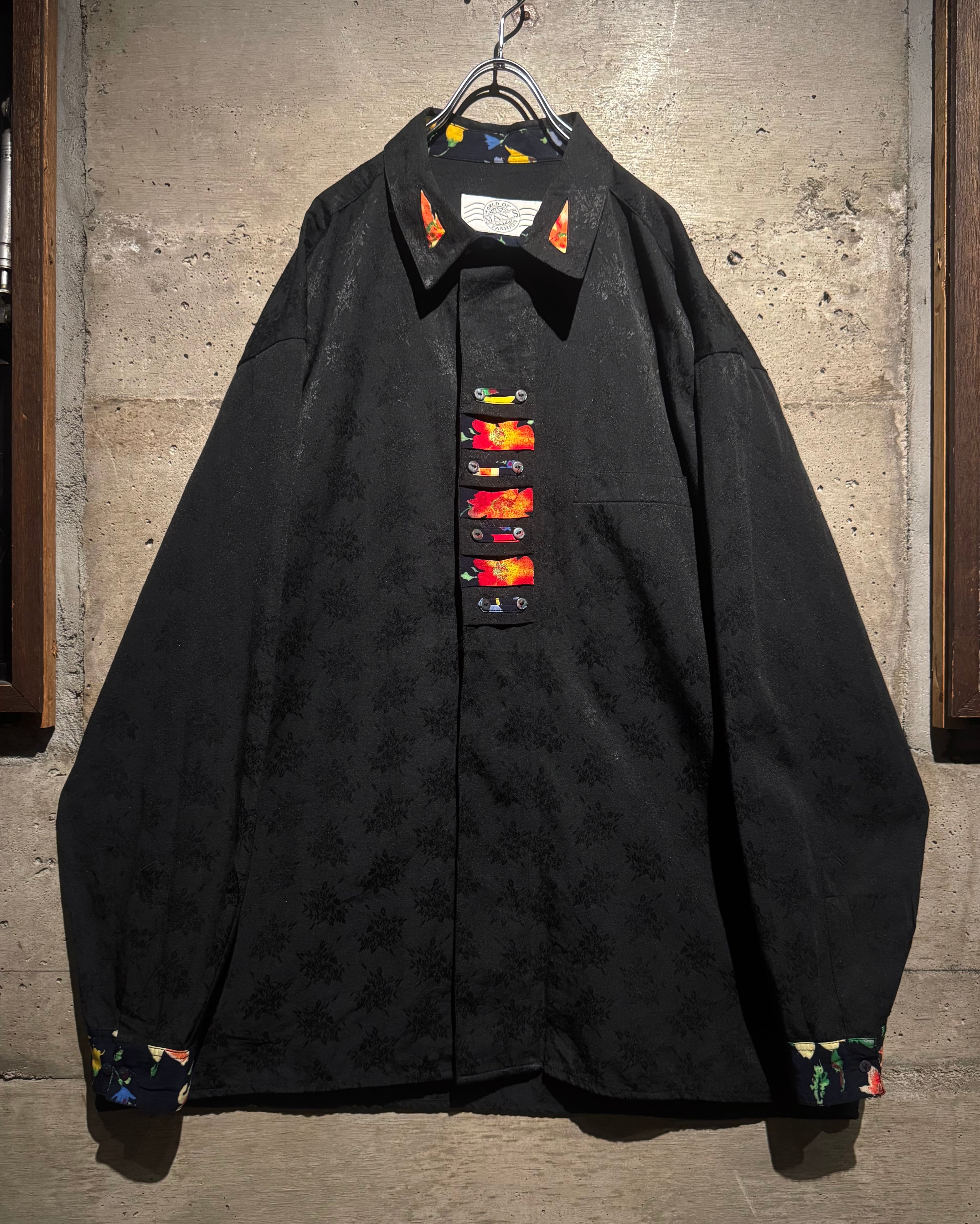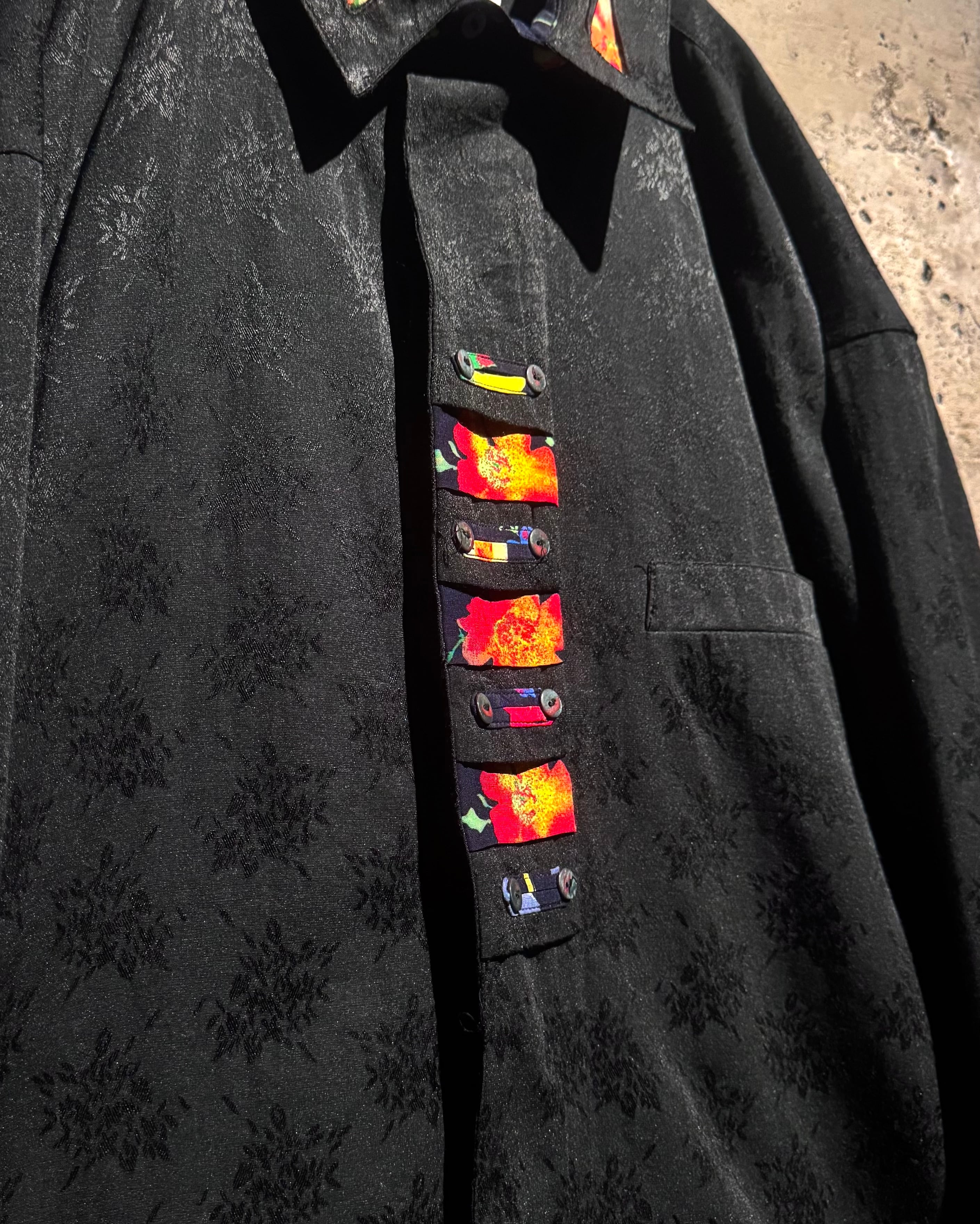 ジャガード織りによってボディ全面に花柄を落とし込み、襟やカフス、前立て部分に異なるフラワーパターンの切り替えを施した1着。
