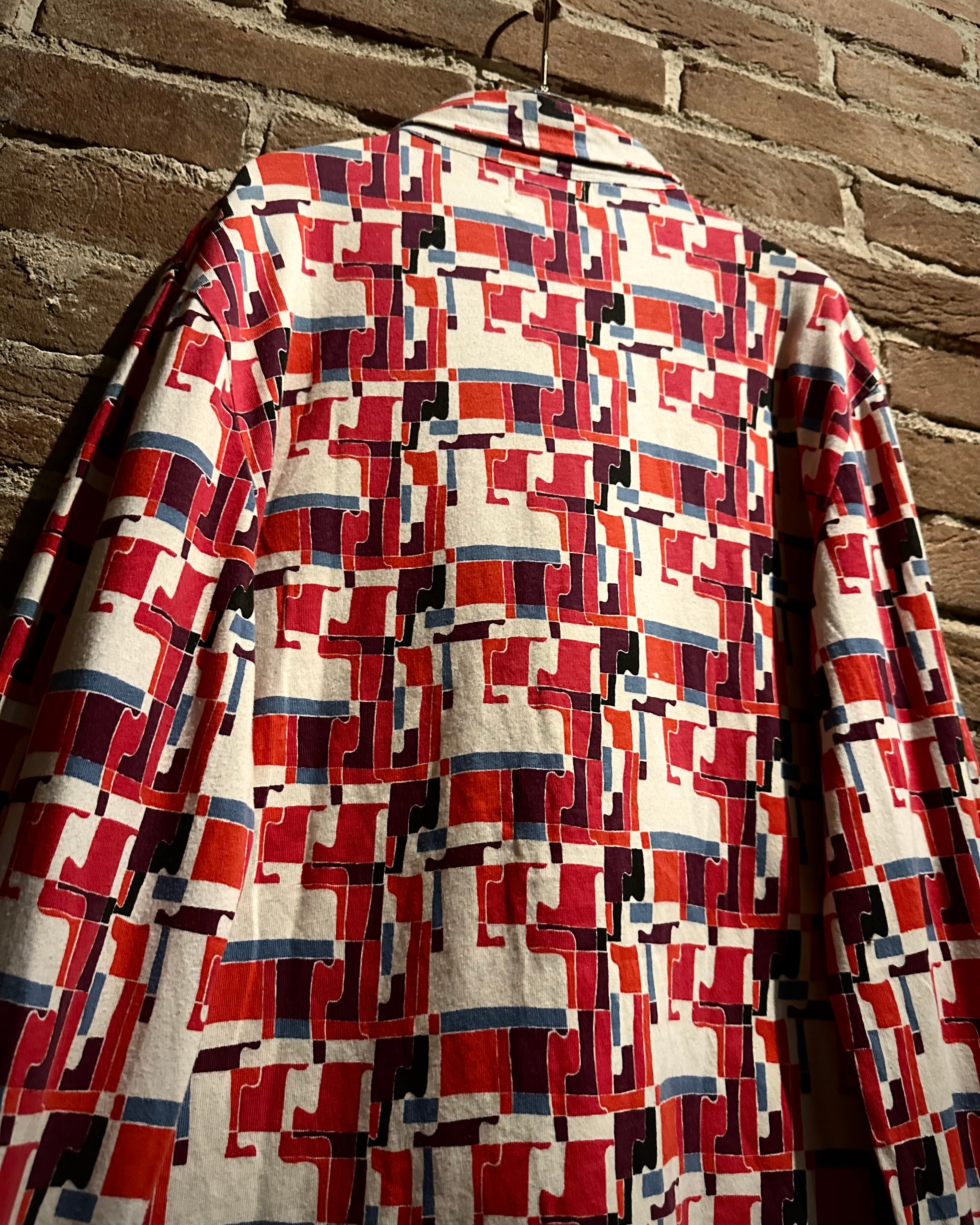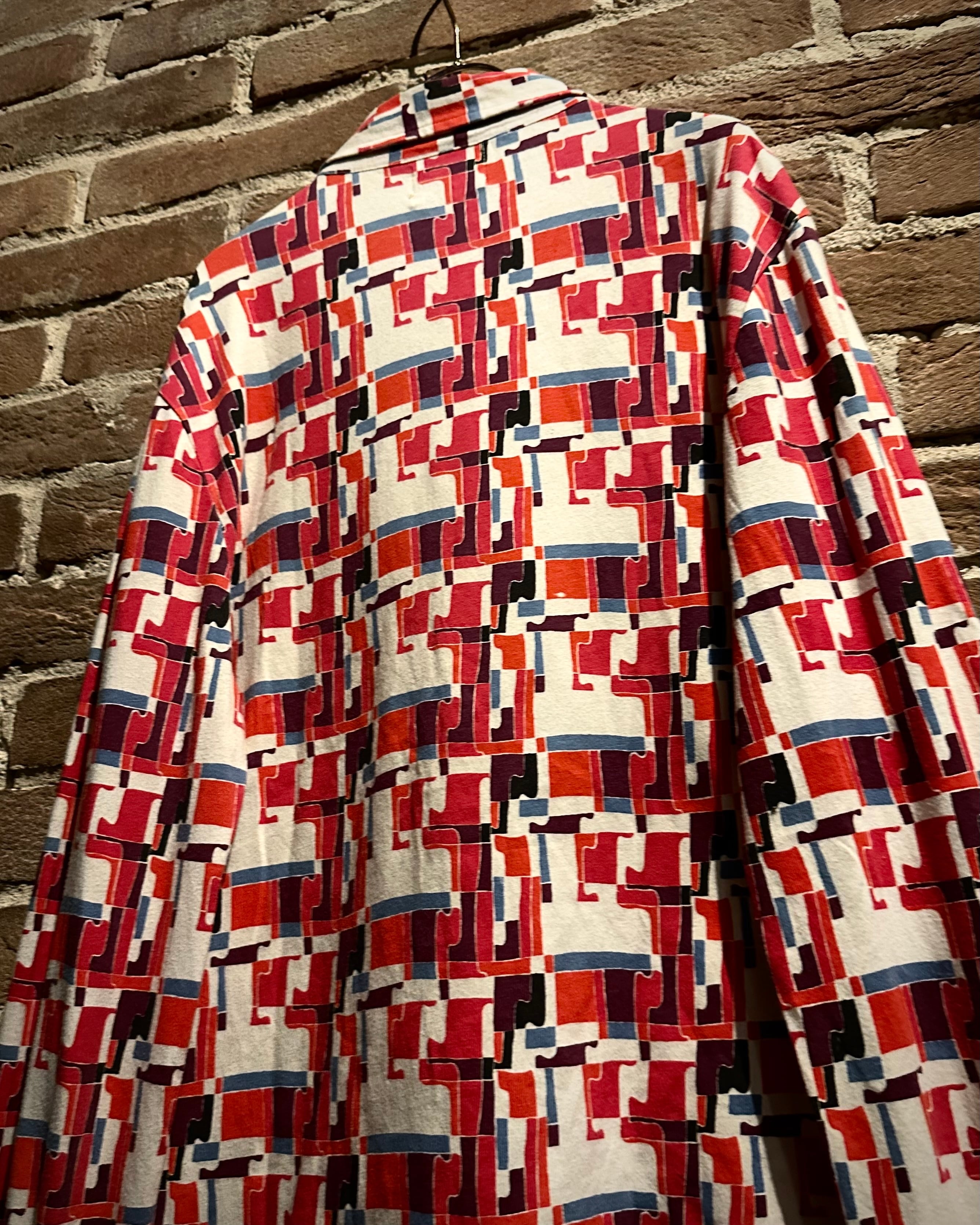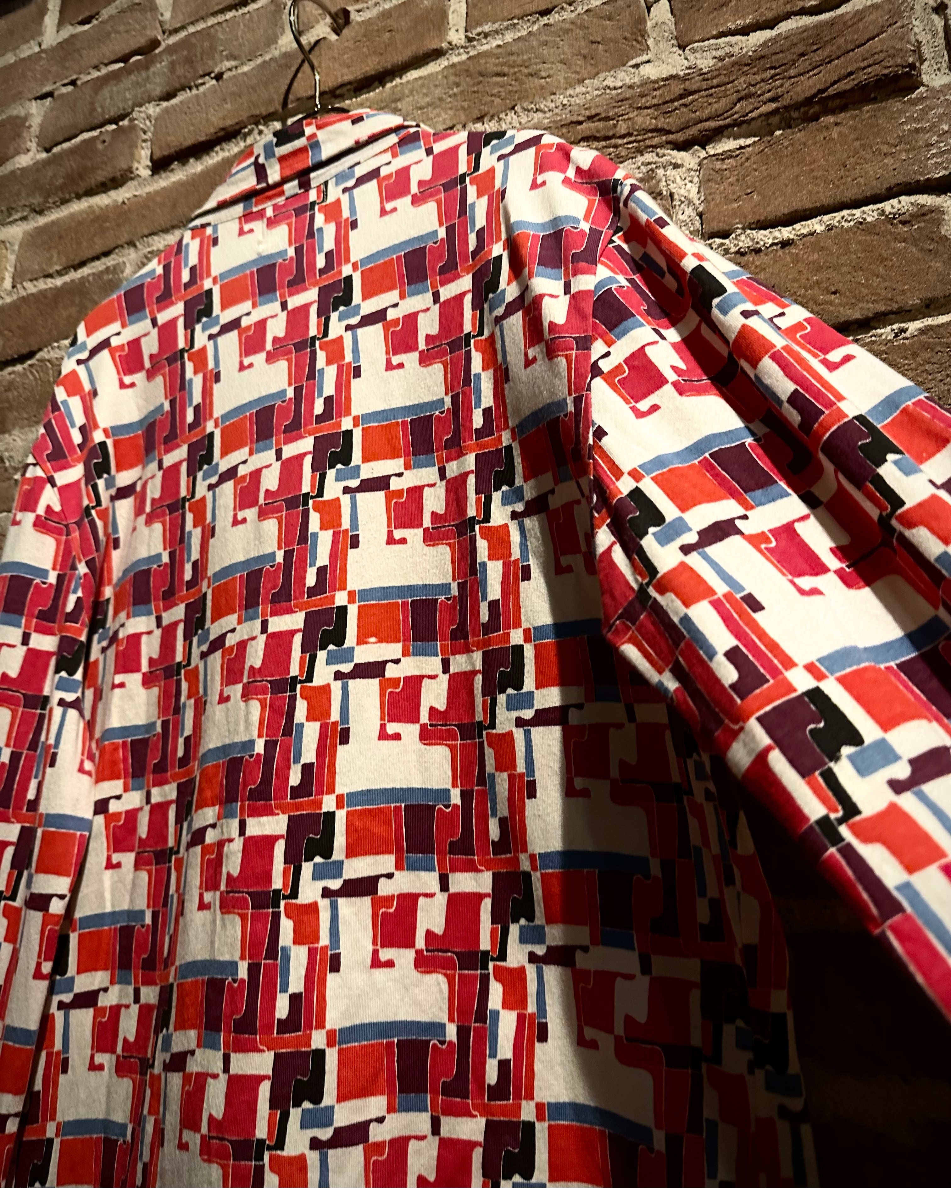 ホワイトベースのボディに、レッドやボルドー、ブラック、ブルーを用いた幾何学模様を全面に配置した1着。