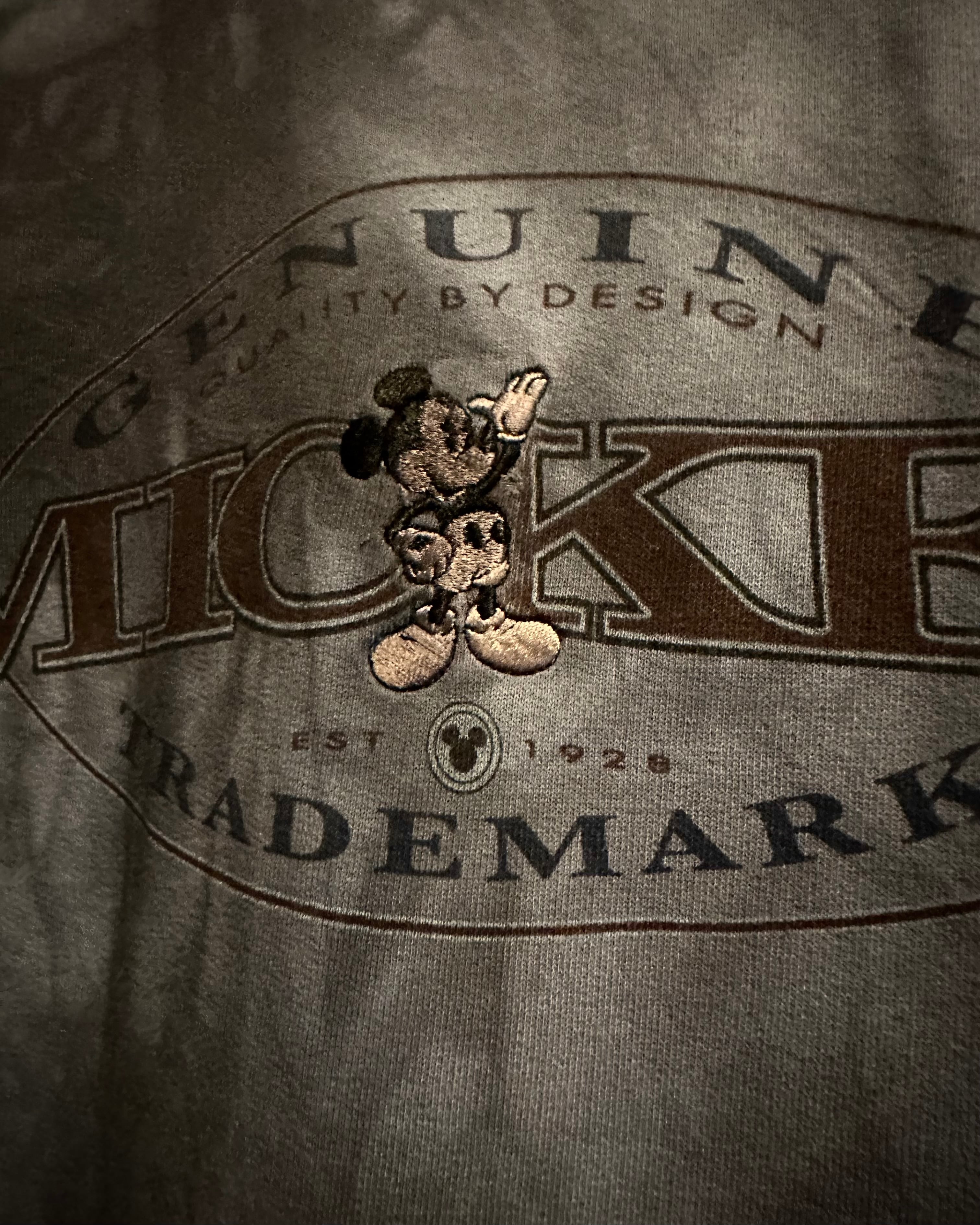 フロントには“MICKEY”ロゴを大きく載せ、その中央にはミッキーの姿を刺繍で配置。プリントだけでは出せない立体感が加わることで、ポップさが絶妙に表現されています。