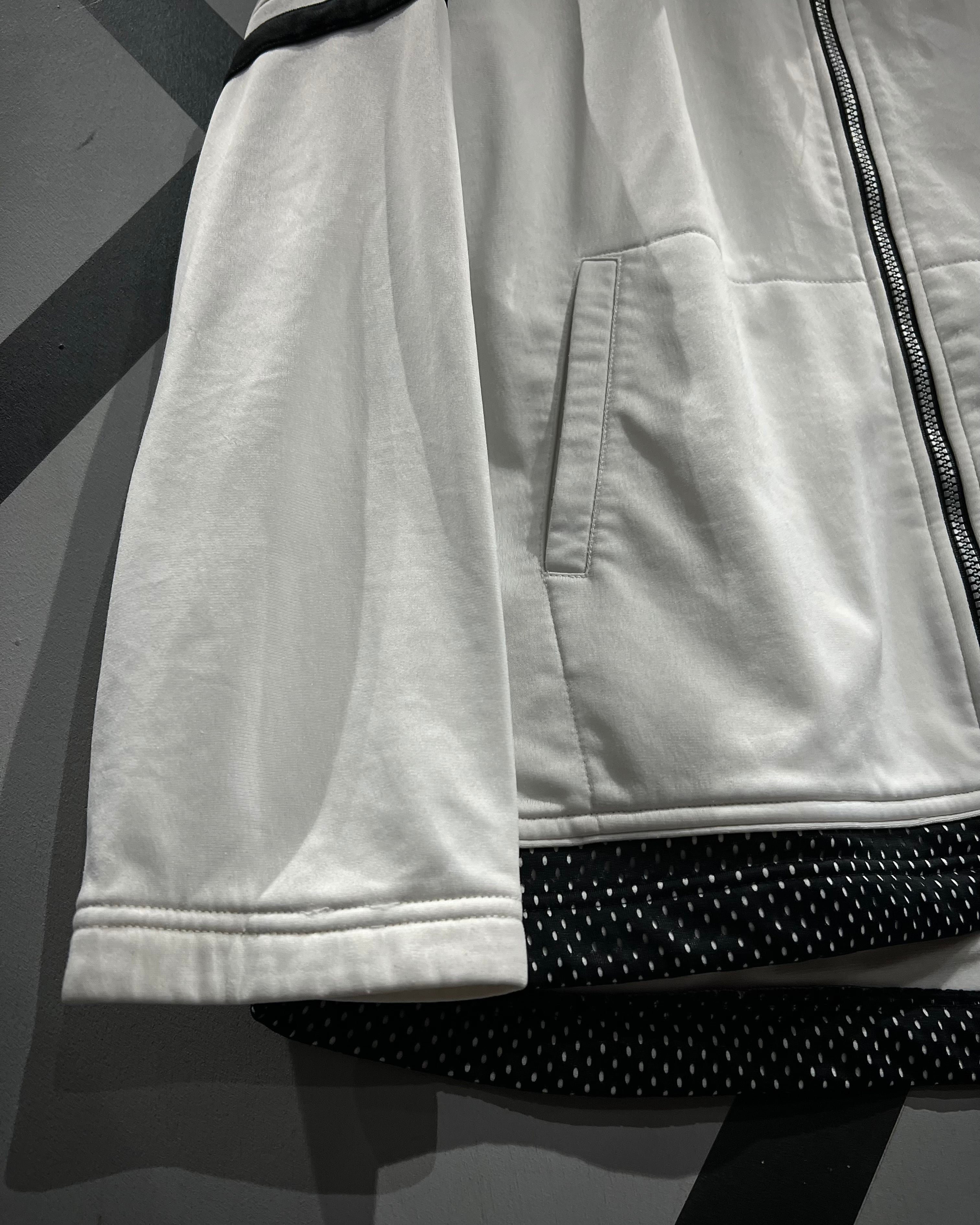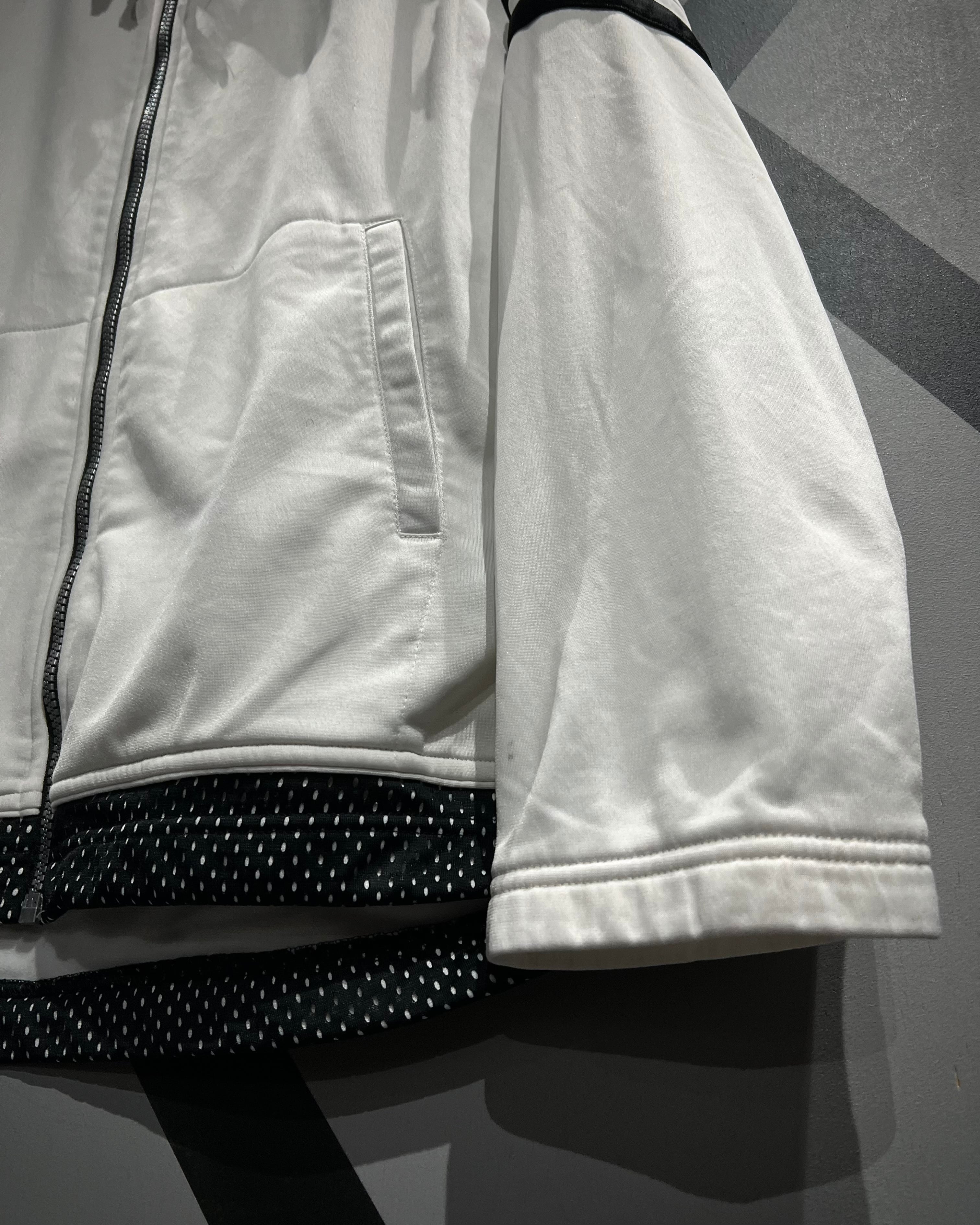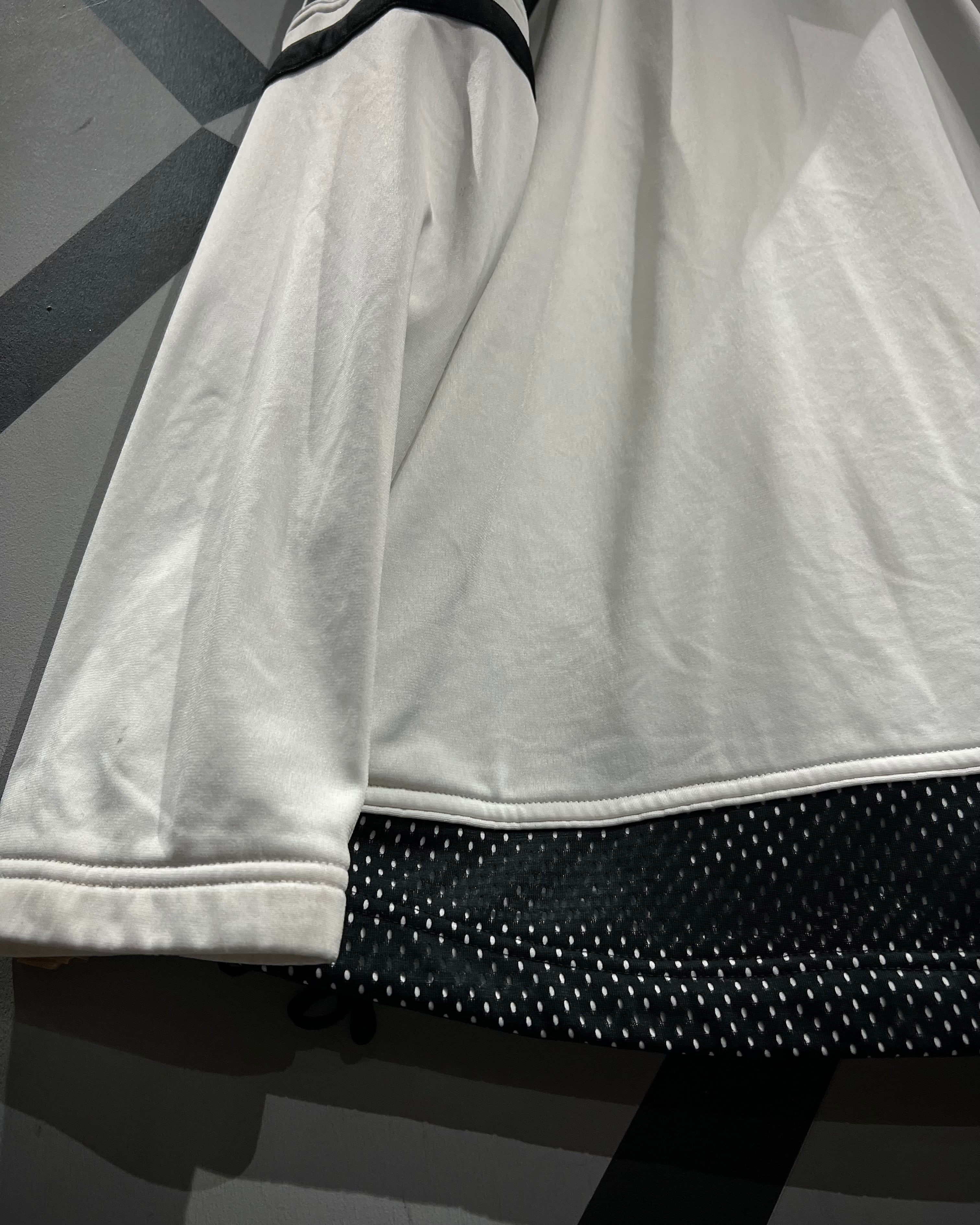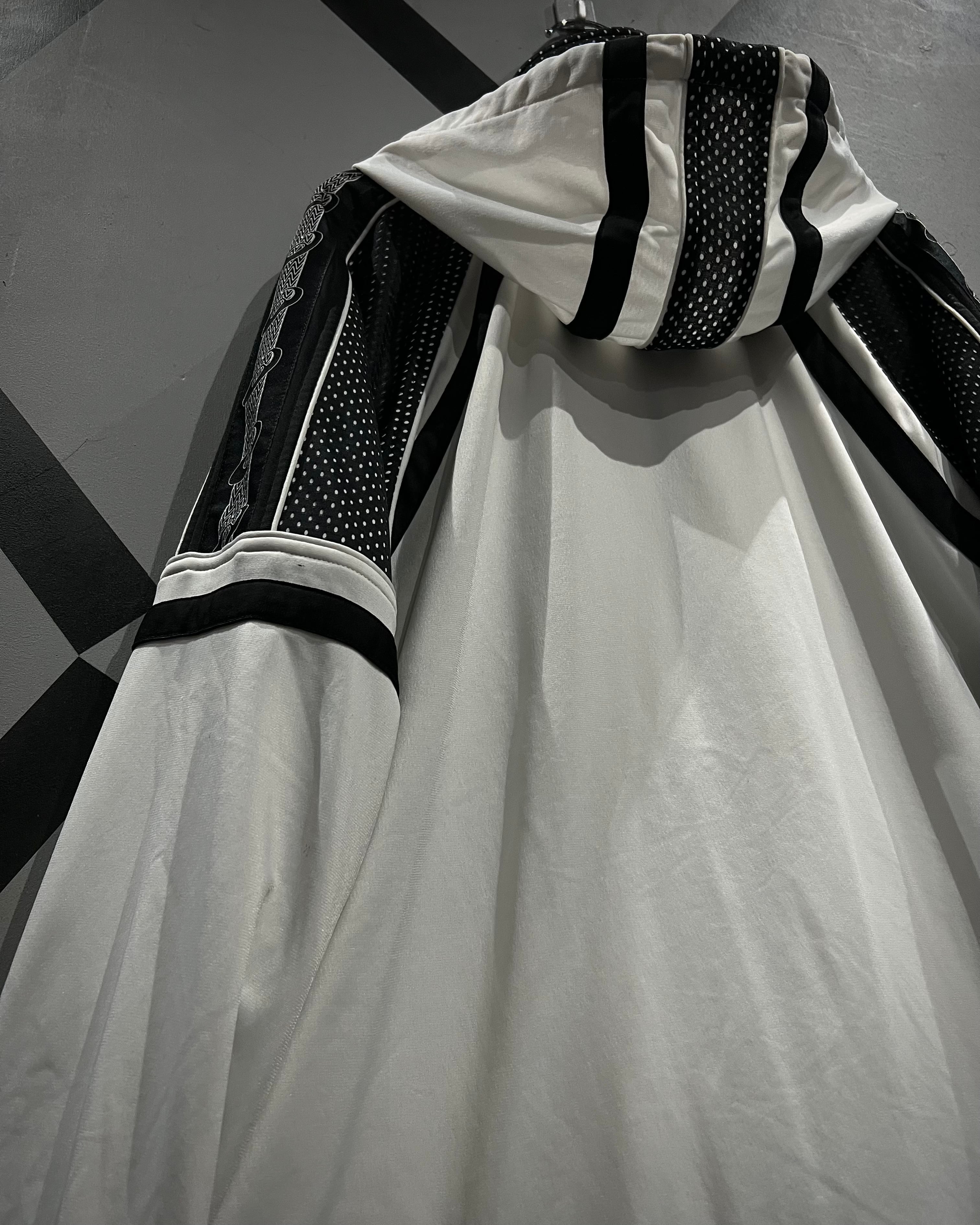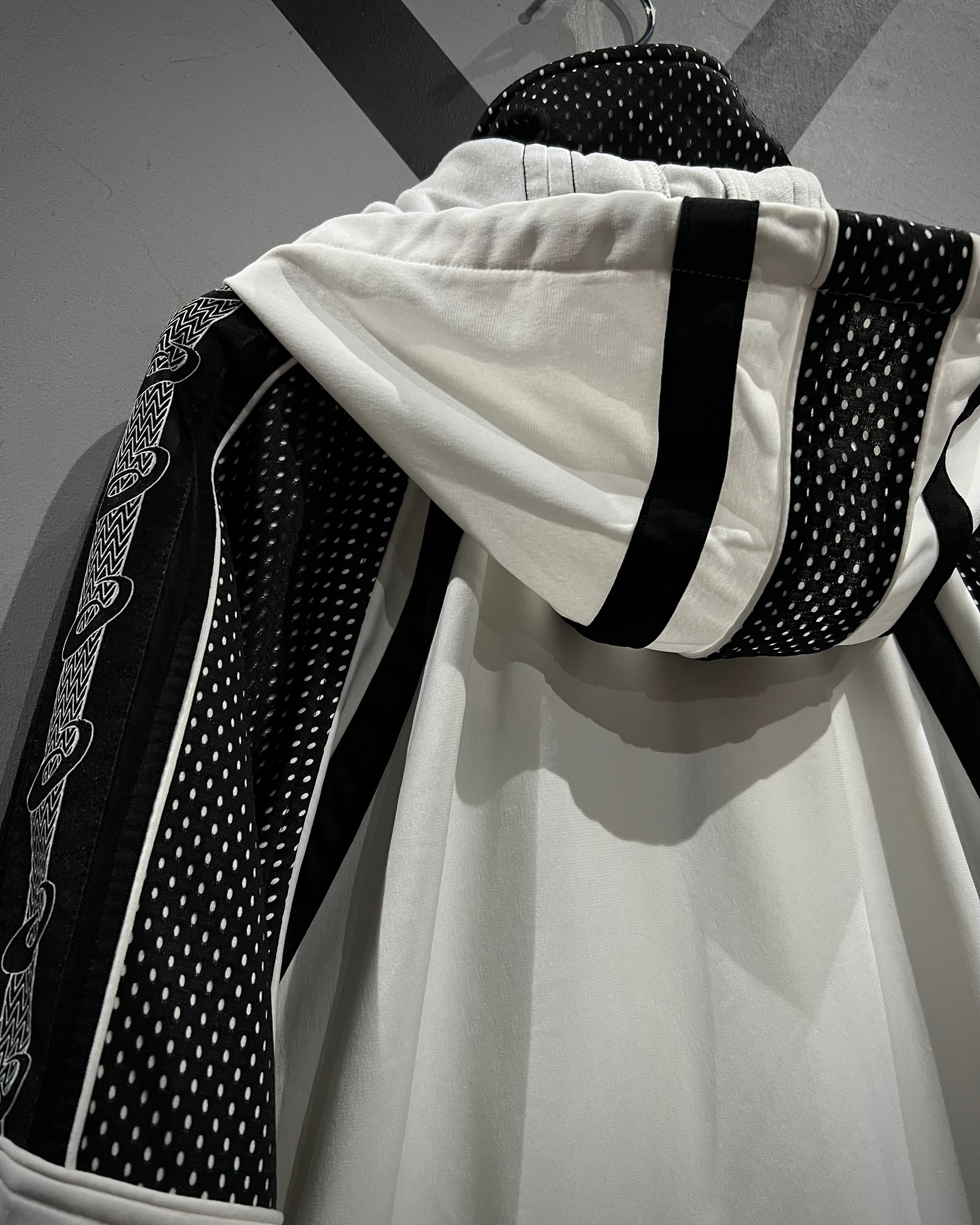 滑らかで程良く光沢を帯びたジャージ素材に、肩部分やフード、ネック、裾へ通気性に優れたメッシュ地を切り替えることで、よりスポーティなルックスに磨きがかかっています。