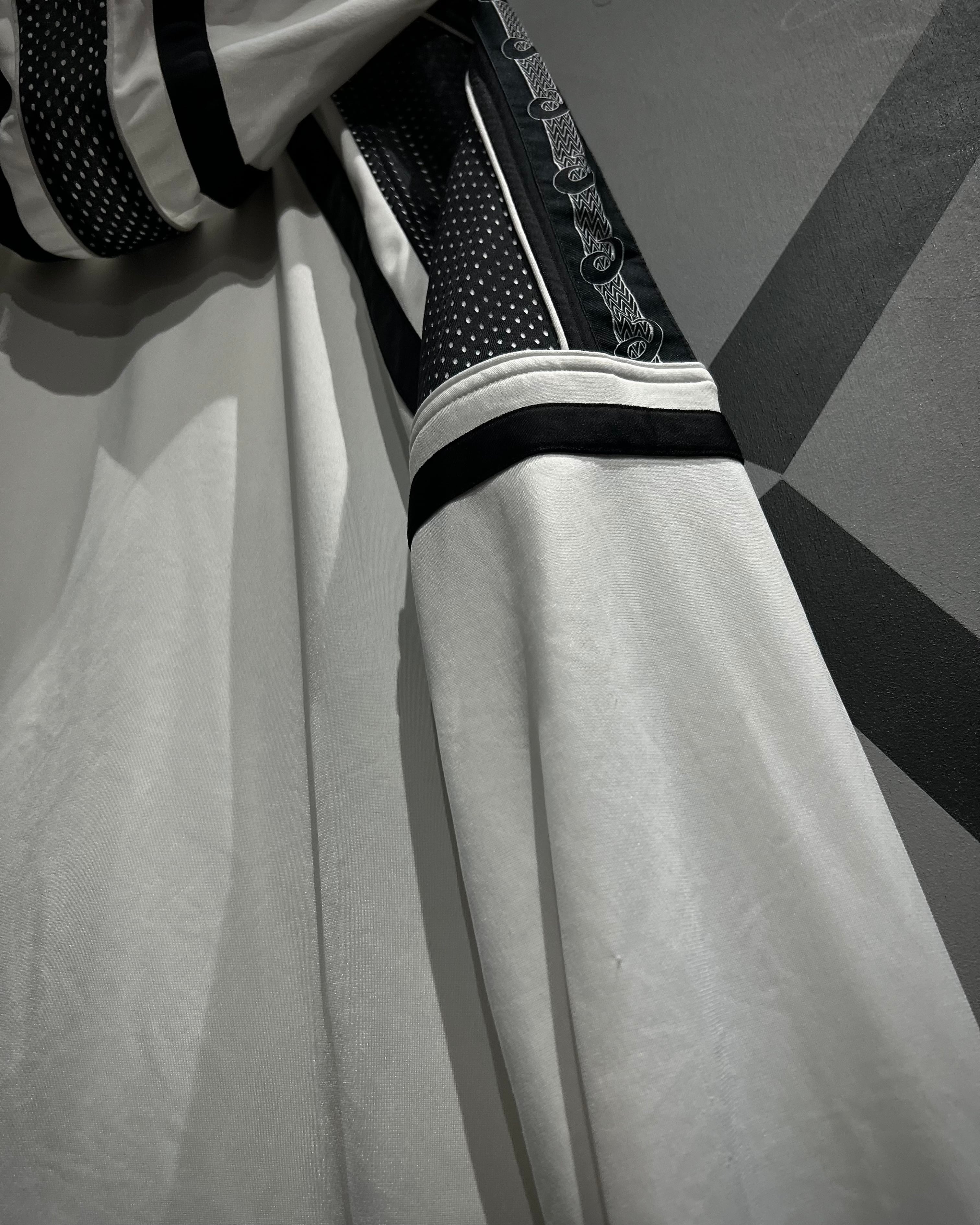 クリーンなホワイトボディをベースに、ブラックのラインやメッシュ切り替えを組み合わせた、モノトーンながらも圧倒的な存在感を放つ1着。