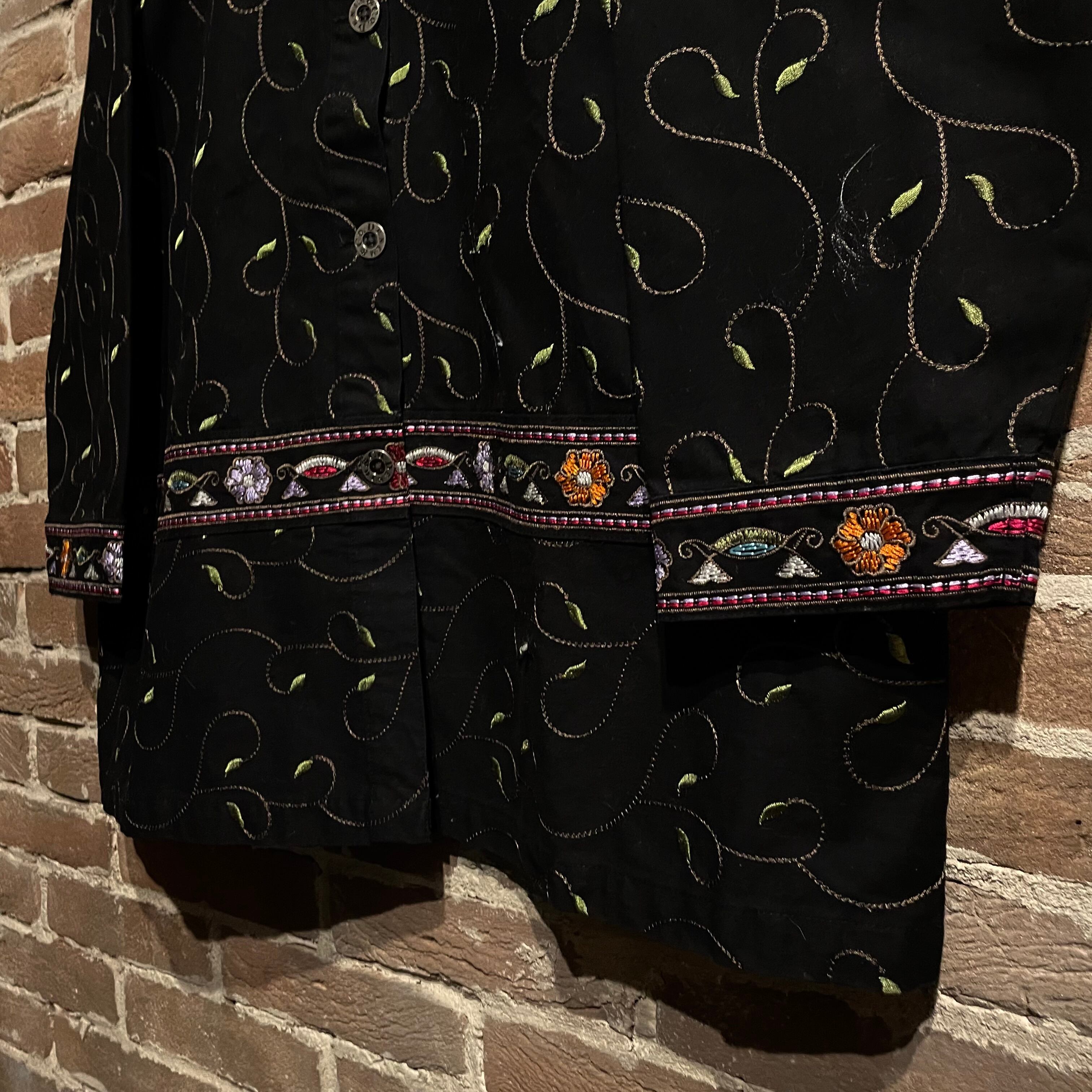 ゆったりしたオーバーなサイズのカバーオール型で肩からの落ち感もさる事ながら、着丈が長めなのもこなれ感が出ますね。襟元、袖口にまで緻密に花刺繍が施され、芸細やか。