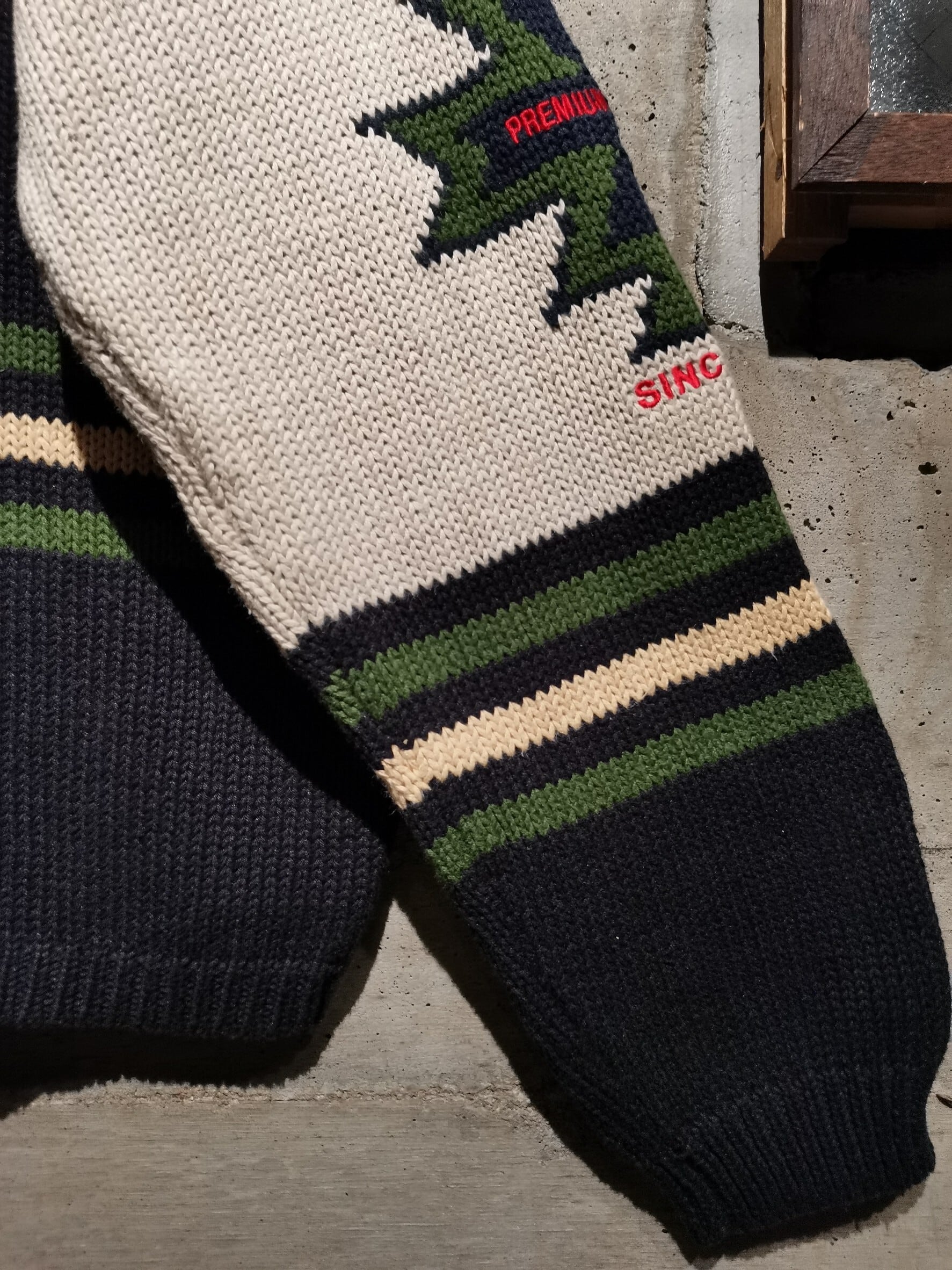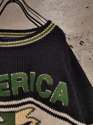 立体感のあるシェニール刺繍で"AMERICA"の文字をフロントに刻んだデザイン。ネイビー×白×緑のレトロな雰囲気を感じる配色バランスに"AMERICA"のレタリングデザインを落とし込み、独創的な世界観を確立。