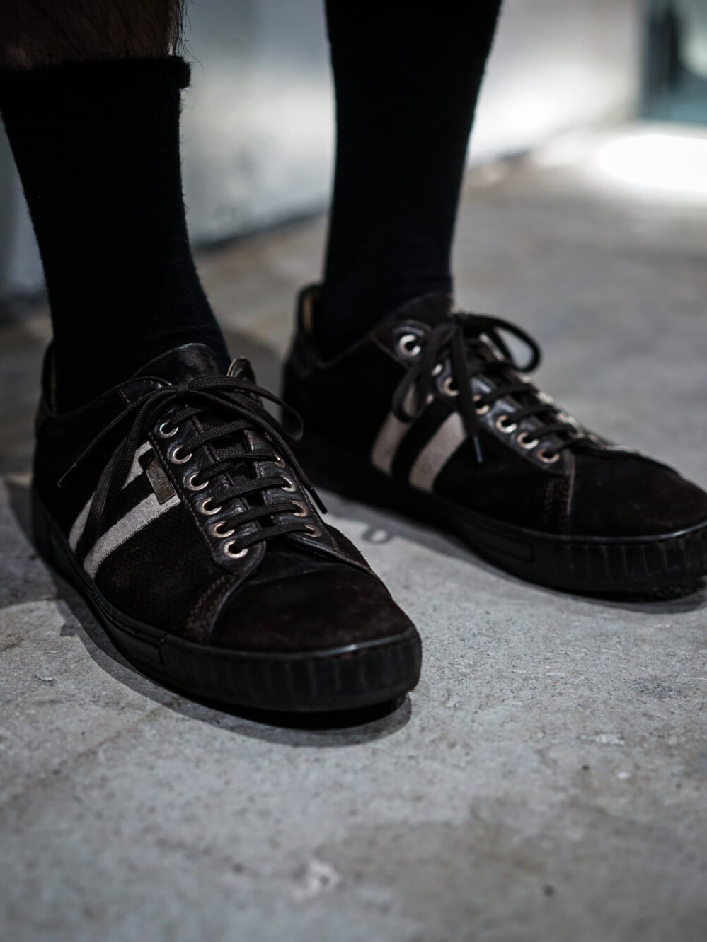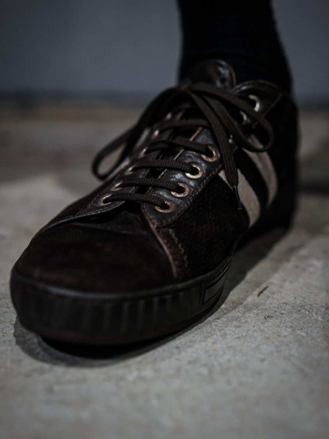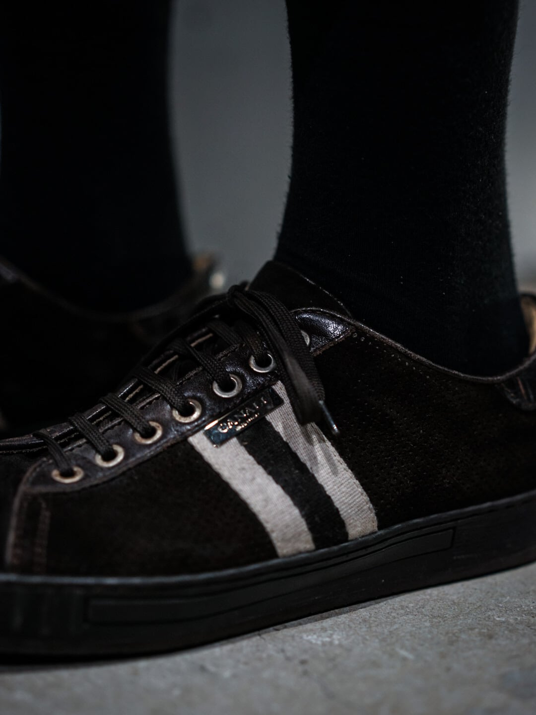 ラグジュアリー感漂う落ち着きのあるブラウンをベースとし、若干起毛感のあるスエード生地に包まれた、高級イタリアンブランドらしい一足。