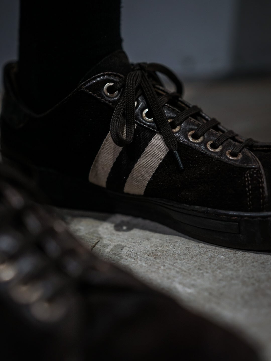 スラックスやフレアパンツなどクラシックなスタイリングの外しとしてこちらのエレガントなスニーカーを合わせると言わずもがな抜け感も演出でき、超格好いい。