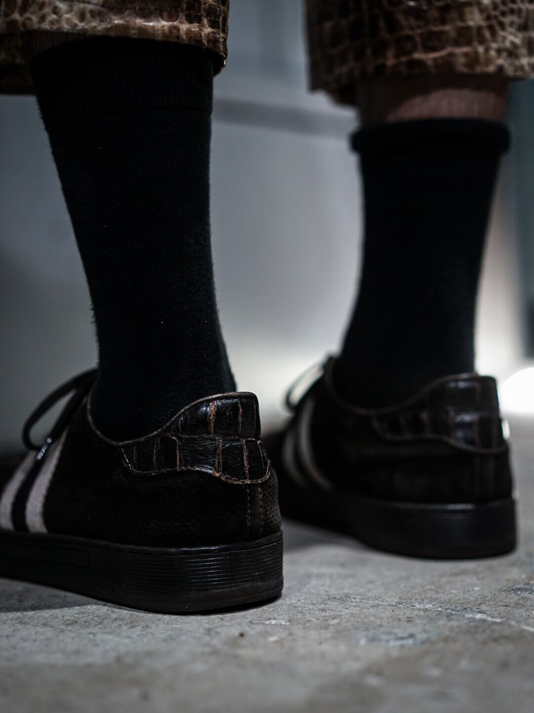 後ろには同系色であしらわれたパイソン柄の切り替えが目を惹き、サイドには太いラインが2本ホワイトで施されている上品さの見栄え満点の仕上がり。