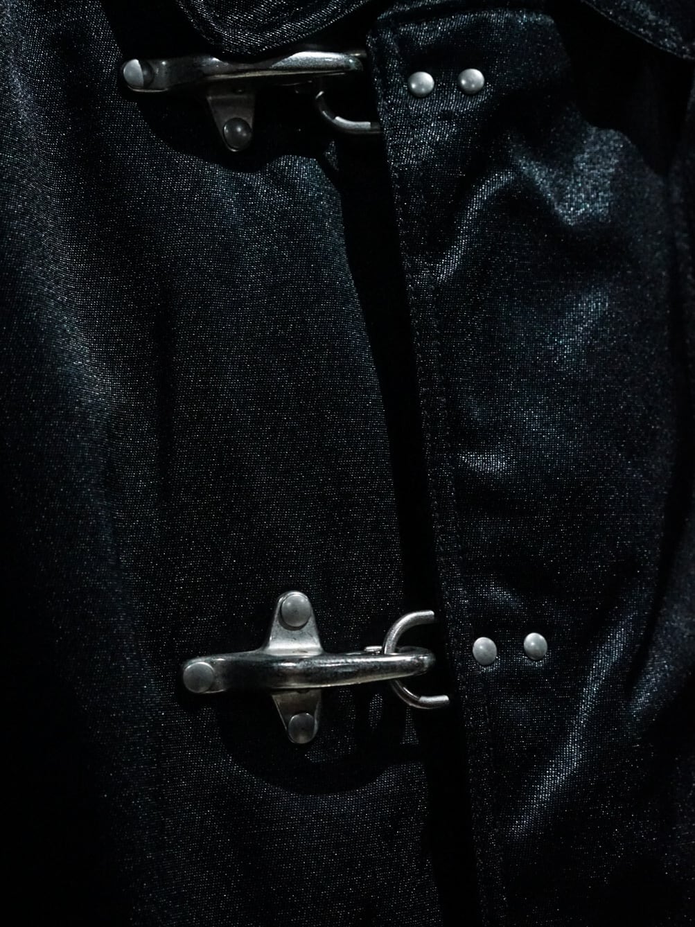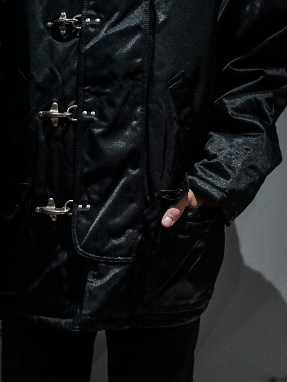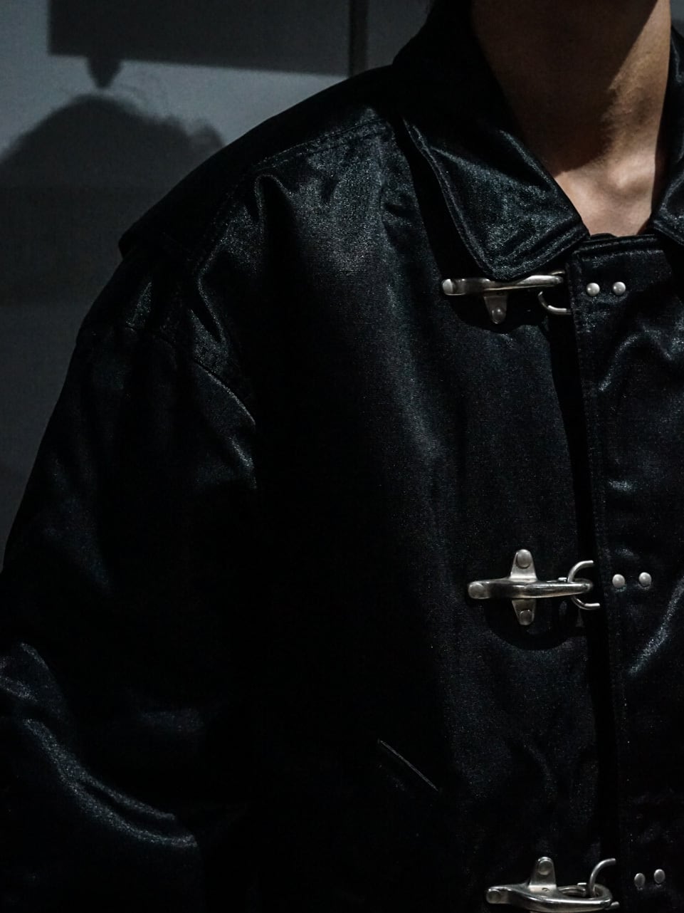 落ち着きのあるブラックの色味とナイロン混紡の素材放たれる柔らかく上品な光沢と、ソリッドな光沢を放つフックギミックがマリアージュ。クラシカルな表情のなかに気品漂うラグジュアリーな装いが服好きの心を擽ります。