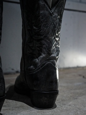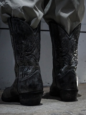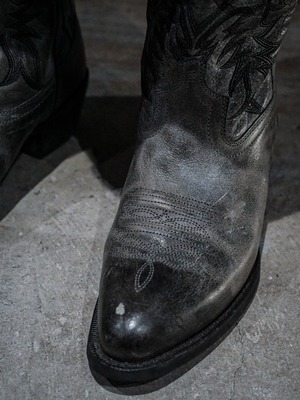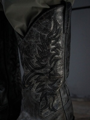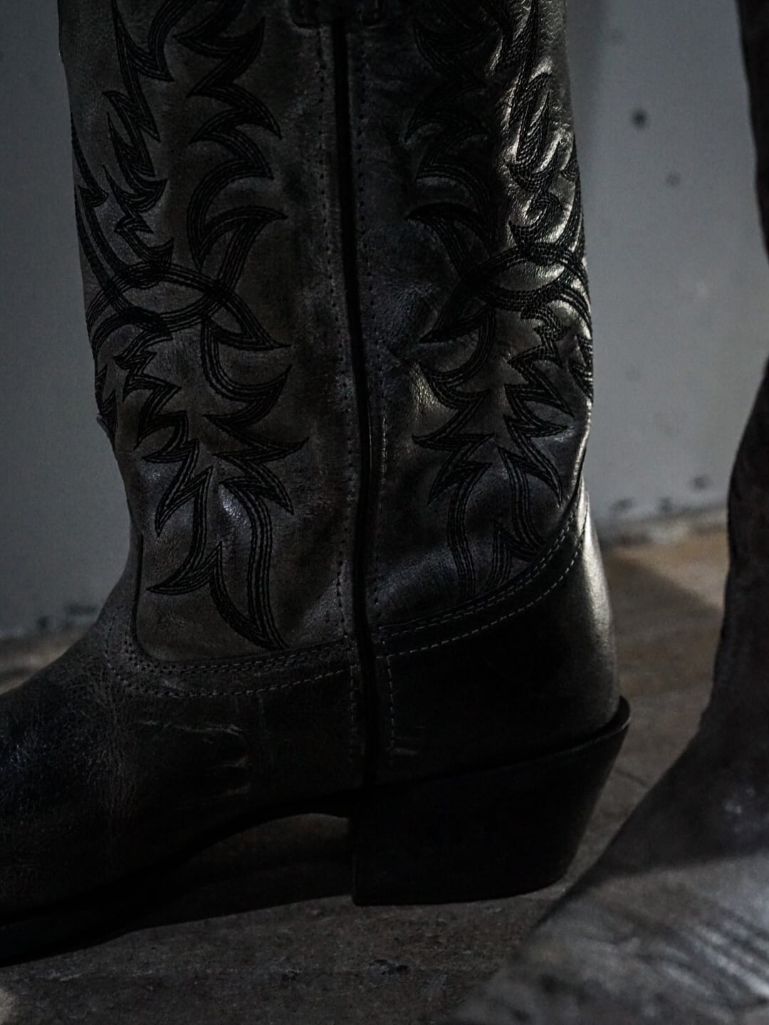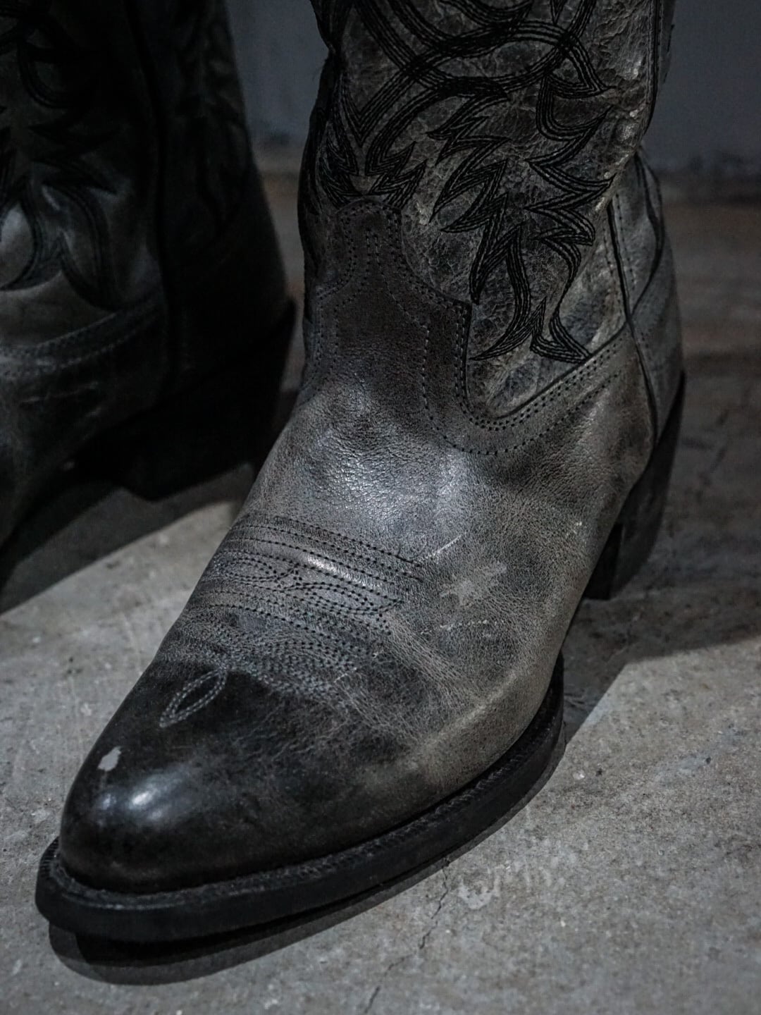 荒々しくフェードが効いた深いグレーに、ウェスタンブーツらしいアーティスティックな刺繍デザインを載せた、レトロながらラグジュアリーな表情に仕上げられた類稀な一品となっております。