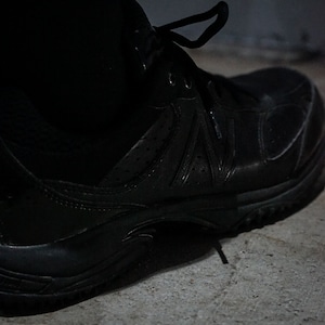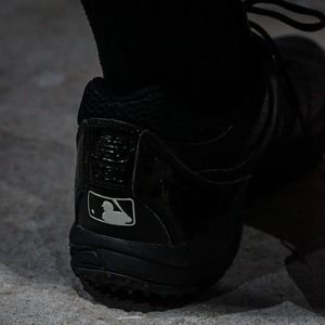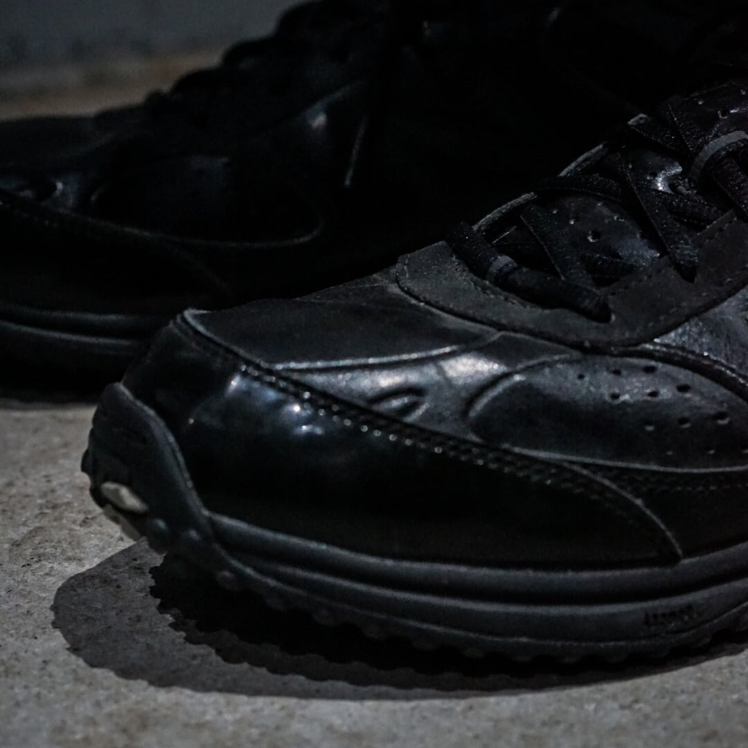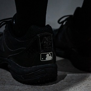 ボディにはレザーとエナメルを切り替え。ソリッドな光沢を放ちオールブラックながら奥行きのある仕上がりにまとまった野球用トレーニングシューズ。