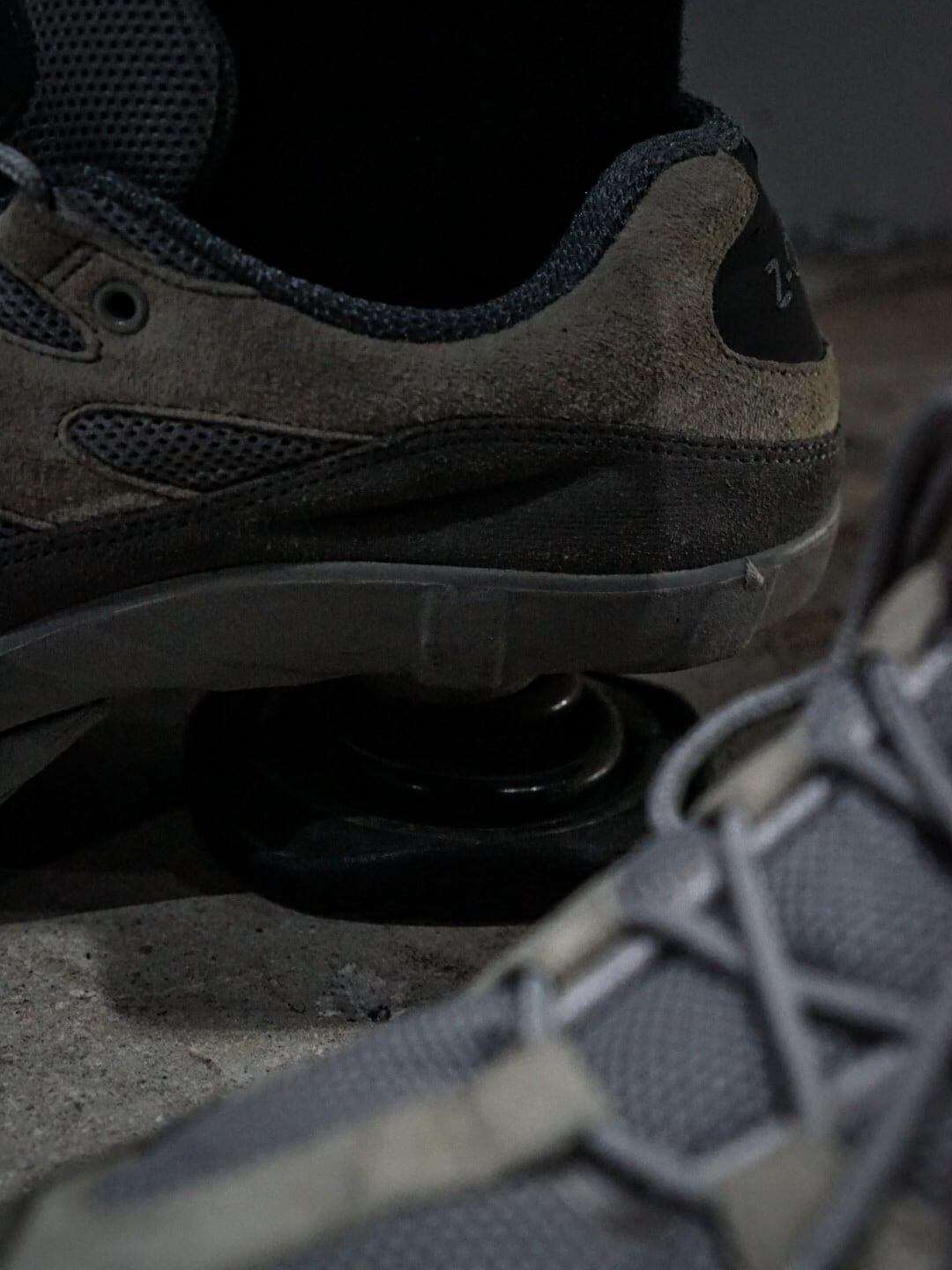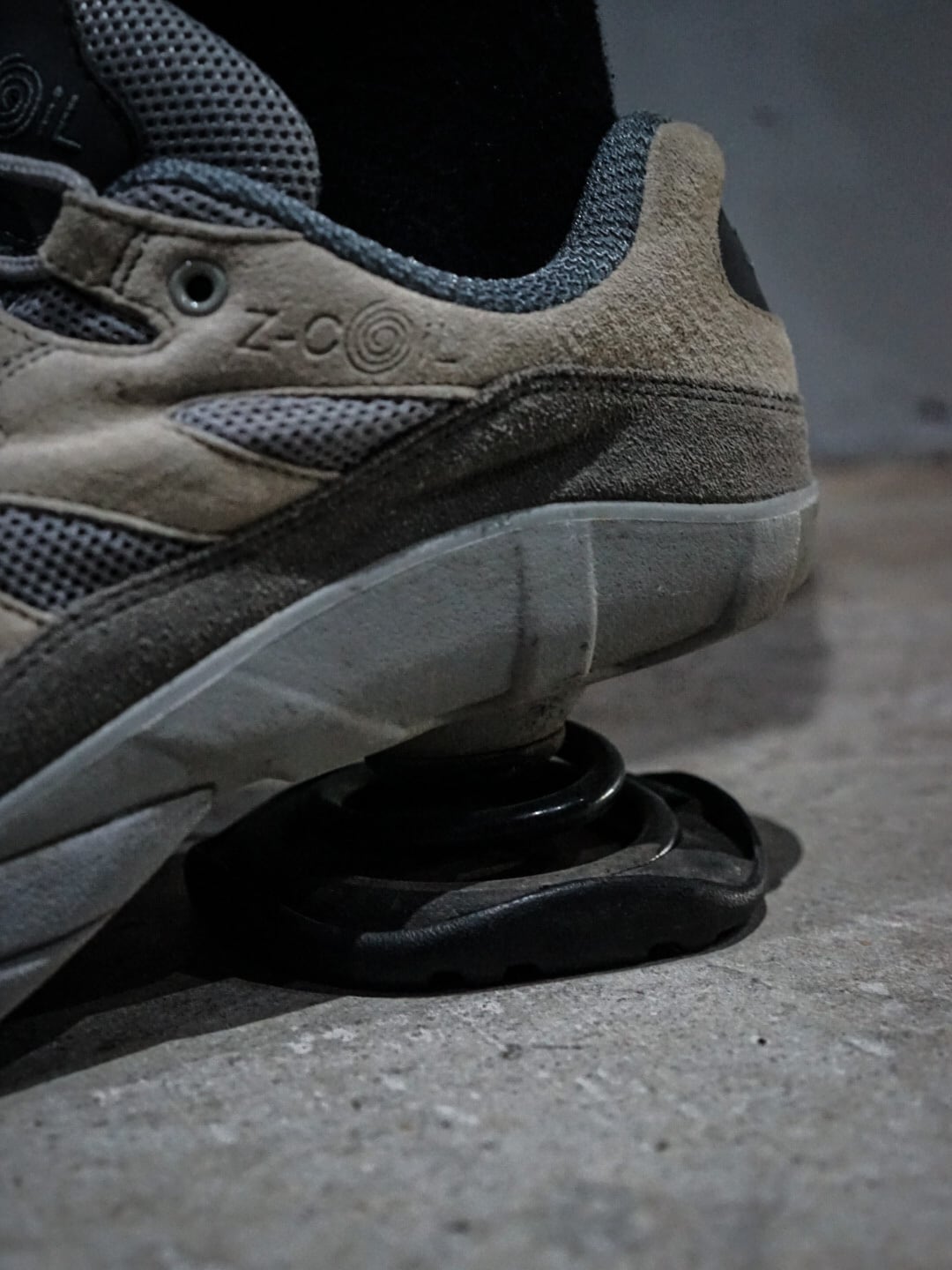 なんと言ってもバネのヒールが特徴的なテクニカルなデザインが際立つこちらのスニーカー。