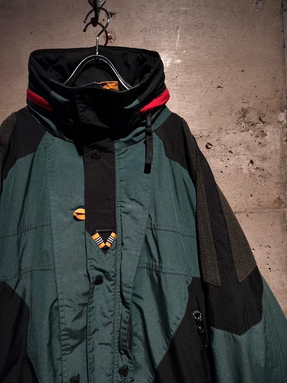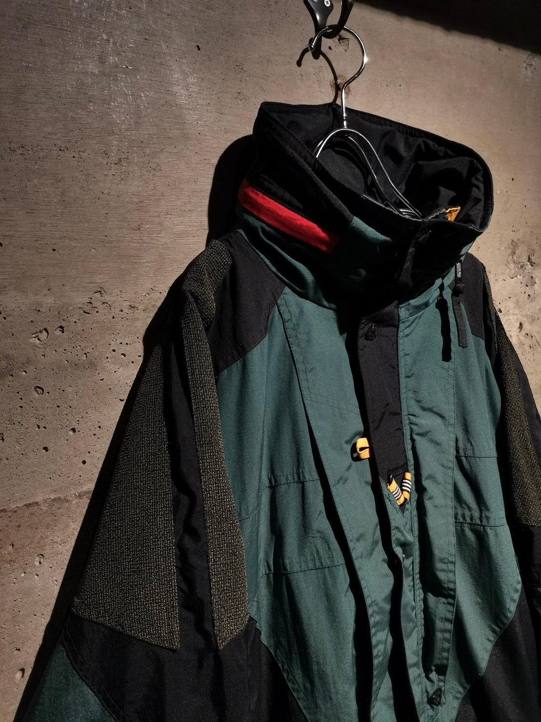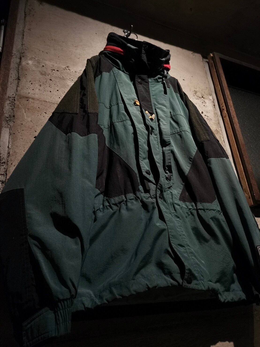 スモーキーグリーンをベースにブラックを切り替え、赤色の差し色が◎ボディにはジップポケット、ウエストと裾にはドローコードのギミックをON。ギュッと絞ればシルエットに変化をつけることも可能です。