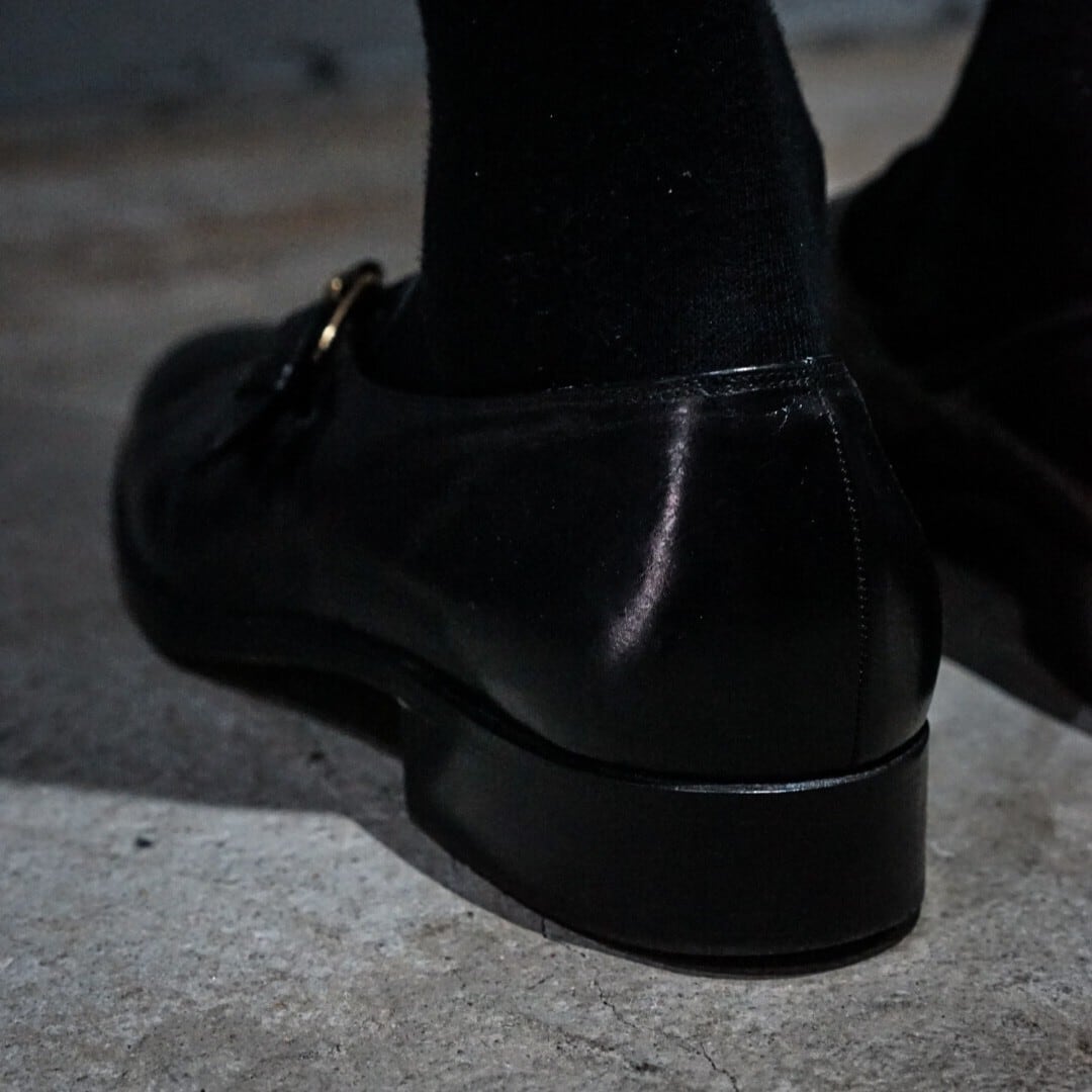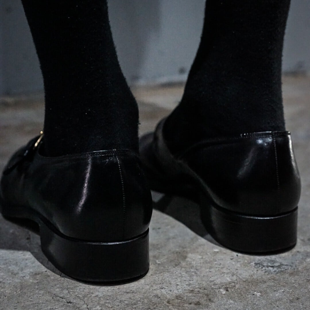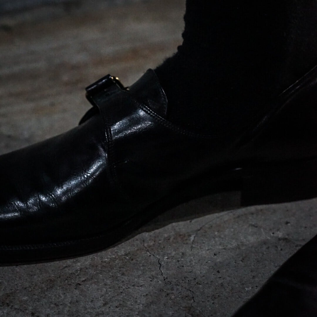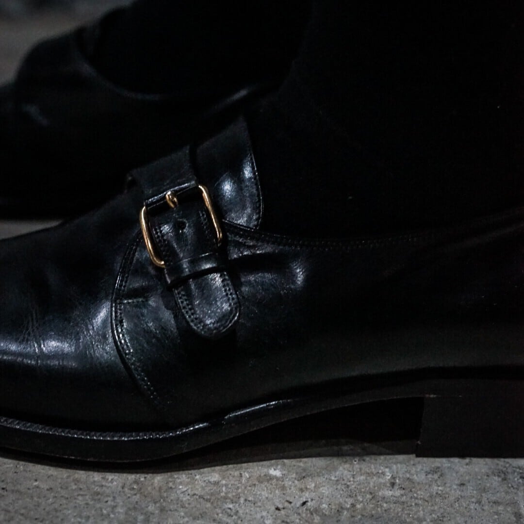 鈍い光沢を帯びた上質なブラックレザーを使用したモンクシューズ。高いレザーの質に細かな縫製、計算された美しいフォルムによってエレガントな仕上がりとなった逸品。