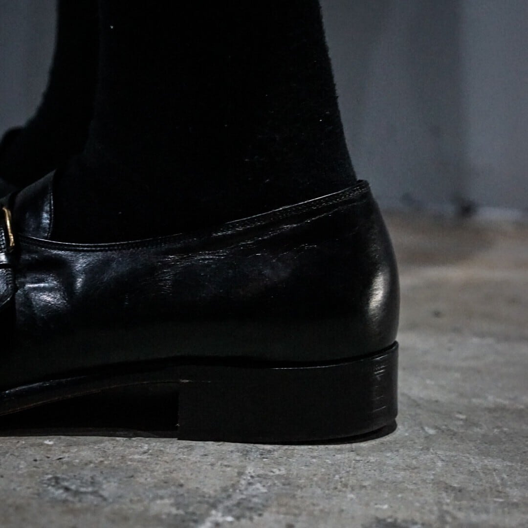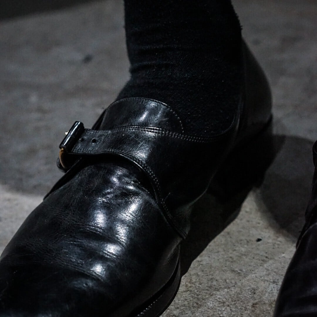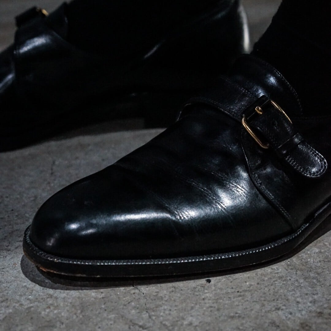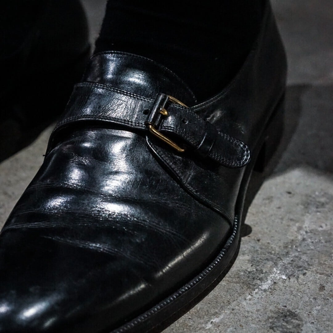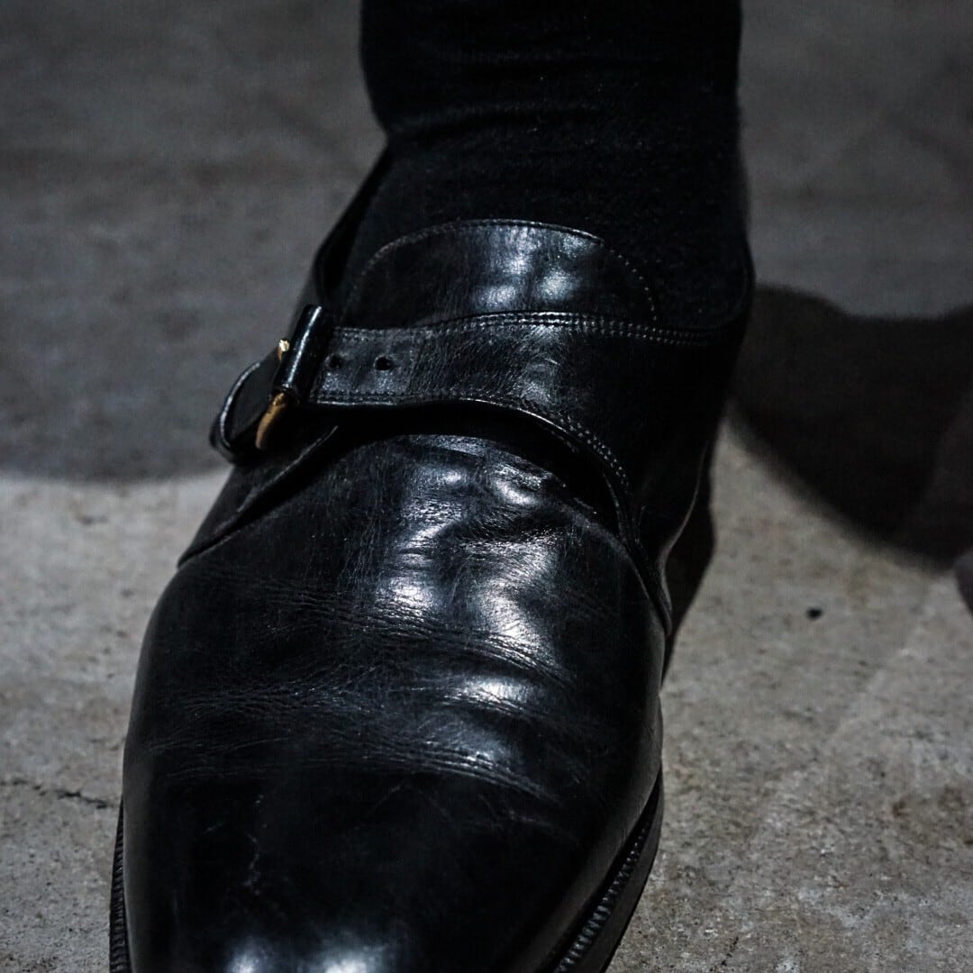 鈍い光沢を帯びた上質なブラックレザーを使用したモンクシューズ。高いレザーの質に細かな縫製、計算された美しいフォルムによってエレガントな仕上がりとなった逸品。