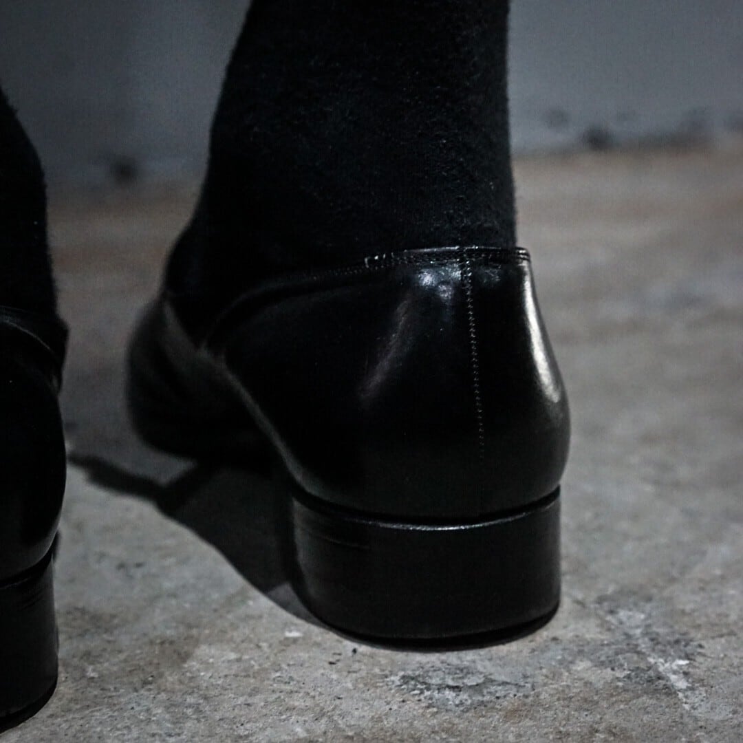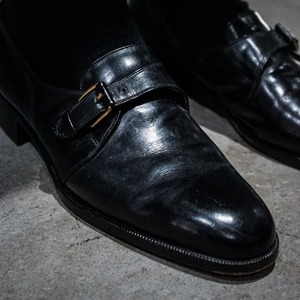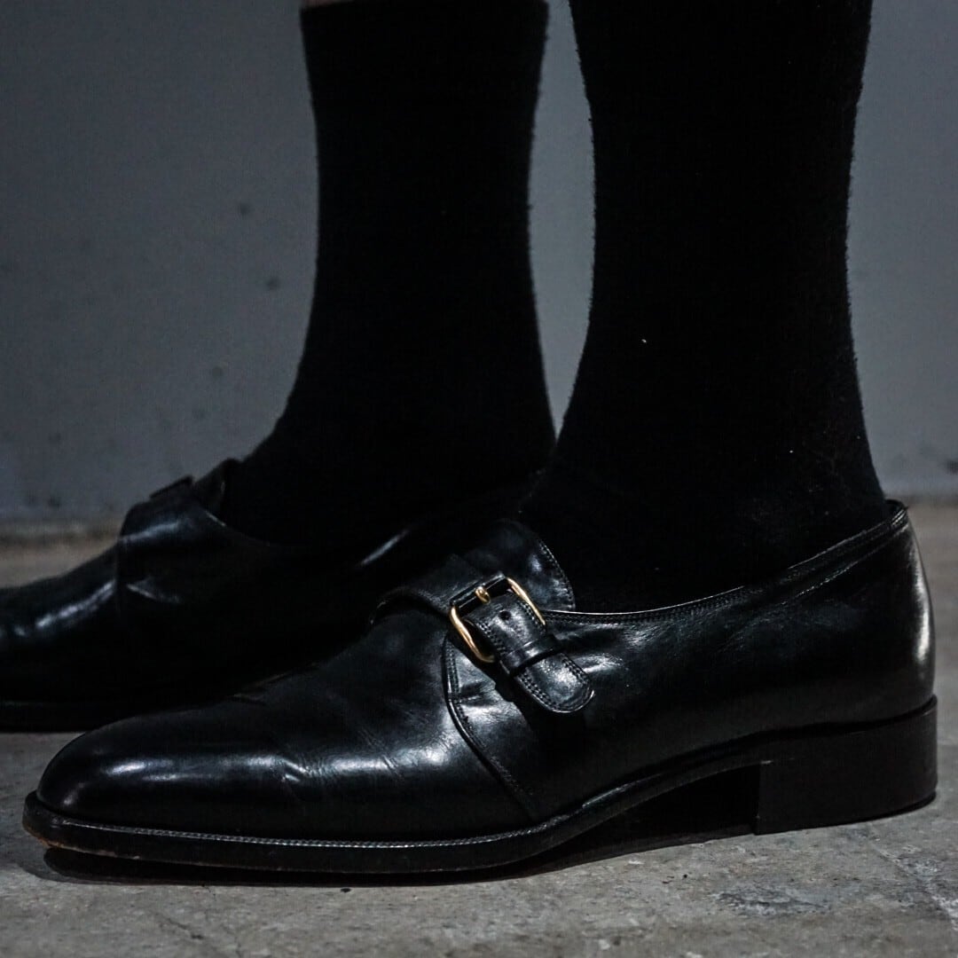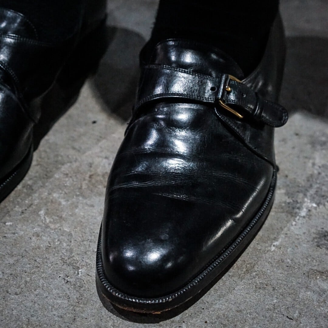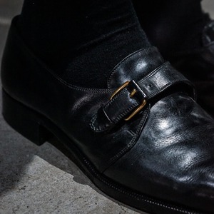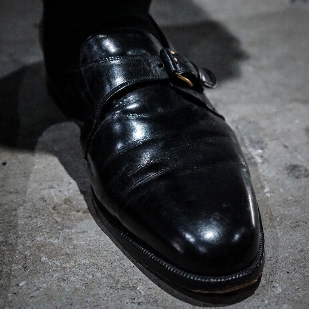 鈍い光沢を帯びた上質なブラックレザーを使用したモンクシューズ。高いレザーの質に細かな縫製、計算された美しいフォルムによってエレガントな仕上がりとなった逸品。