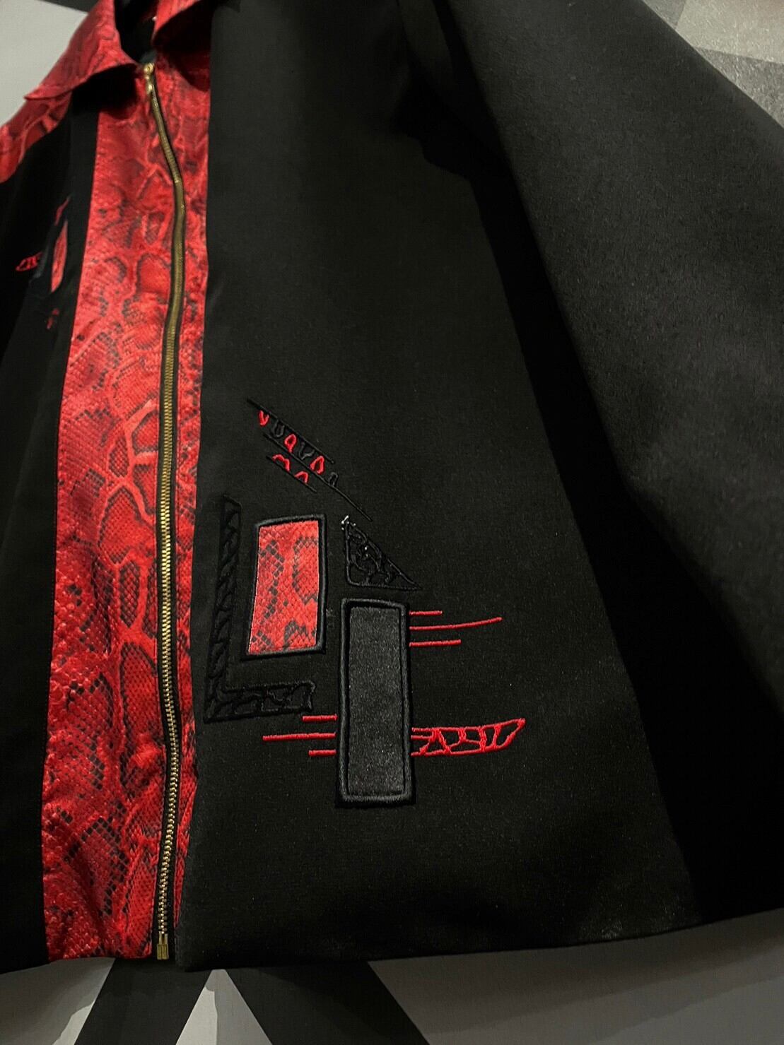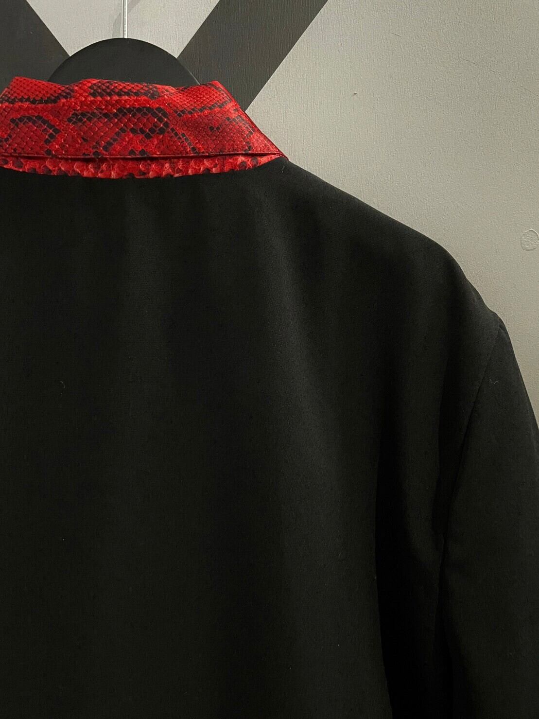 フワッと軽いポリエステル素材に、真紅のパイソン柄を切り替え、アーティスティックな刺繍を刻んだジャケット。古着らしさもありつつ、ラグジュアリーなフレーバーも漂う1着です。