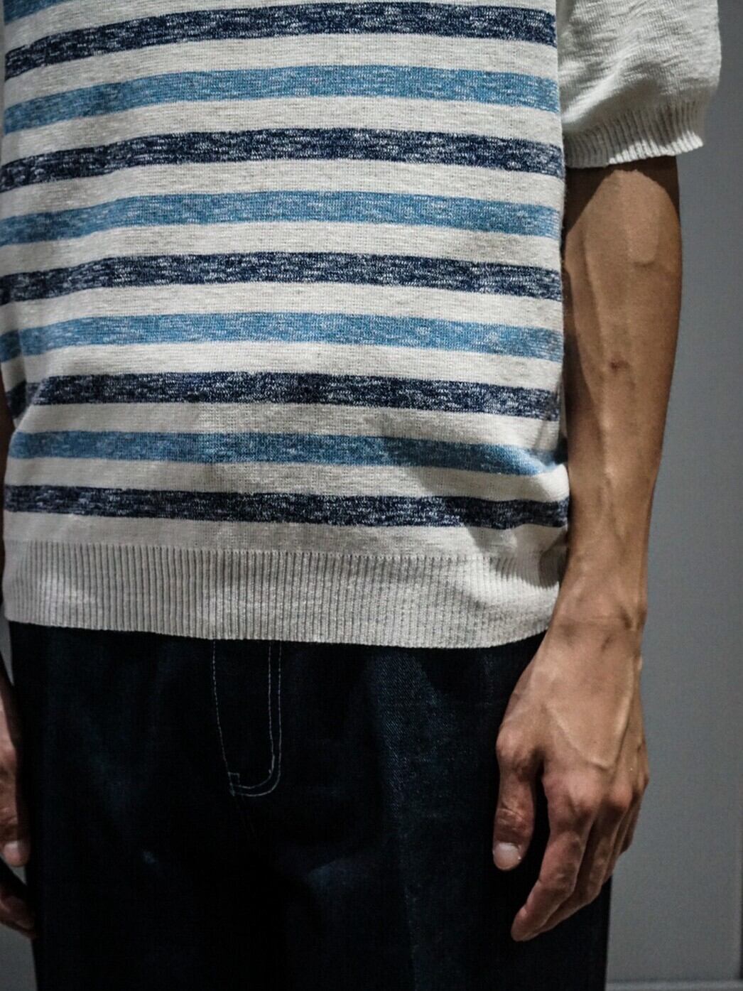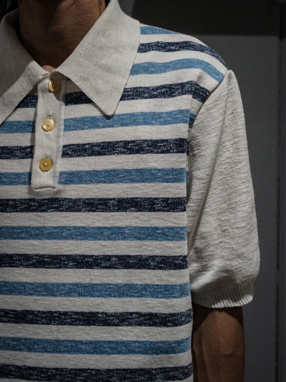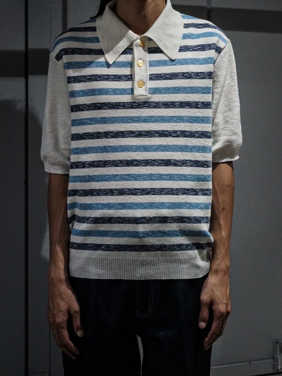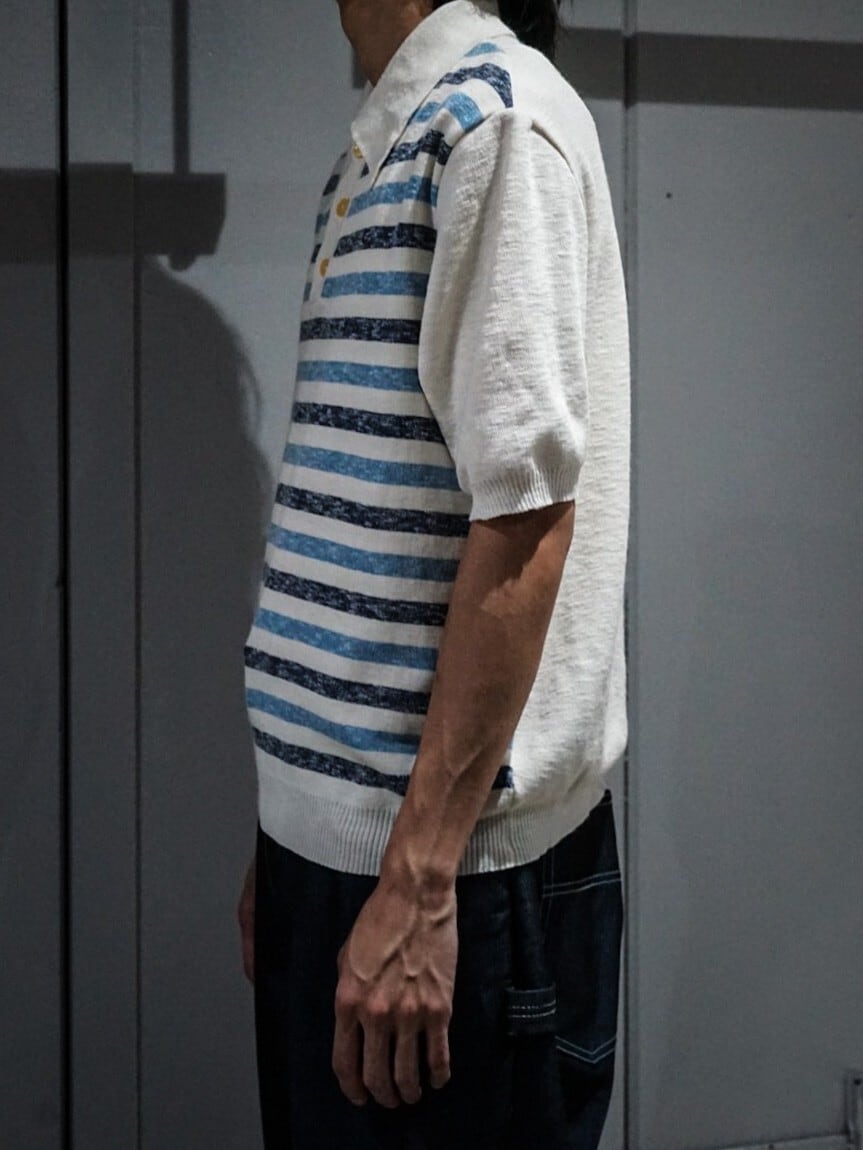 気品のあるホワイトベースのボディに、ネイビーとライトブルーの同系色でボーダーを配した半袖ニットポロシャツ。この爽やかカラーリング今の季節にはピッタリですね。