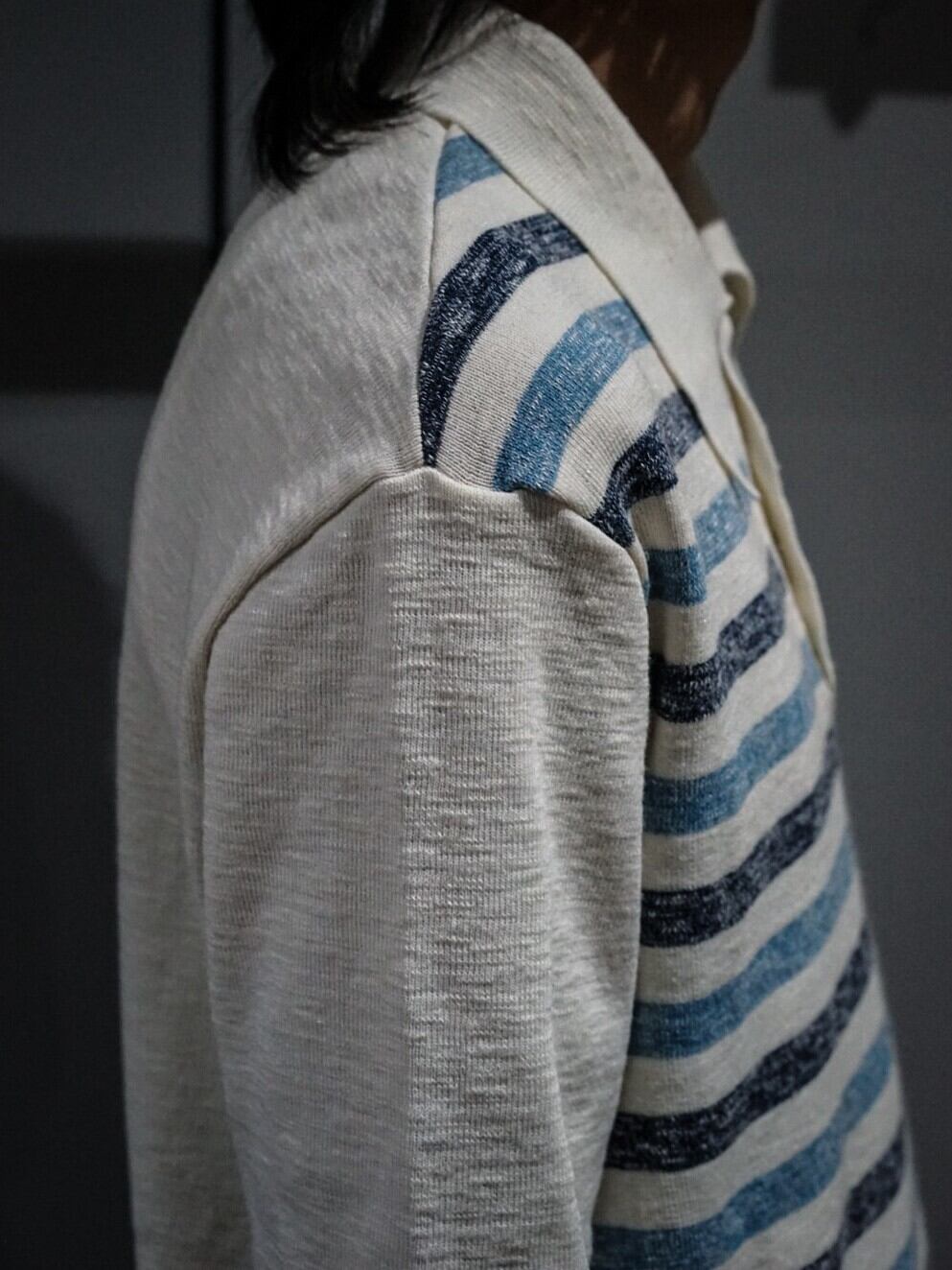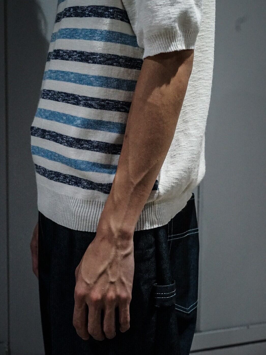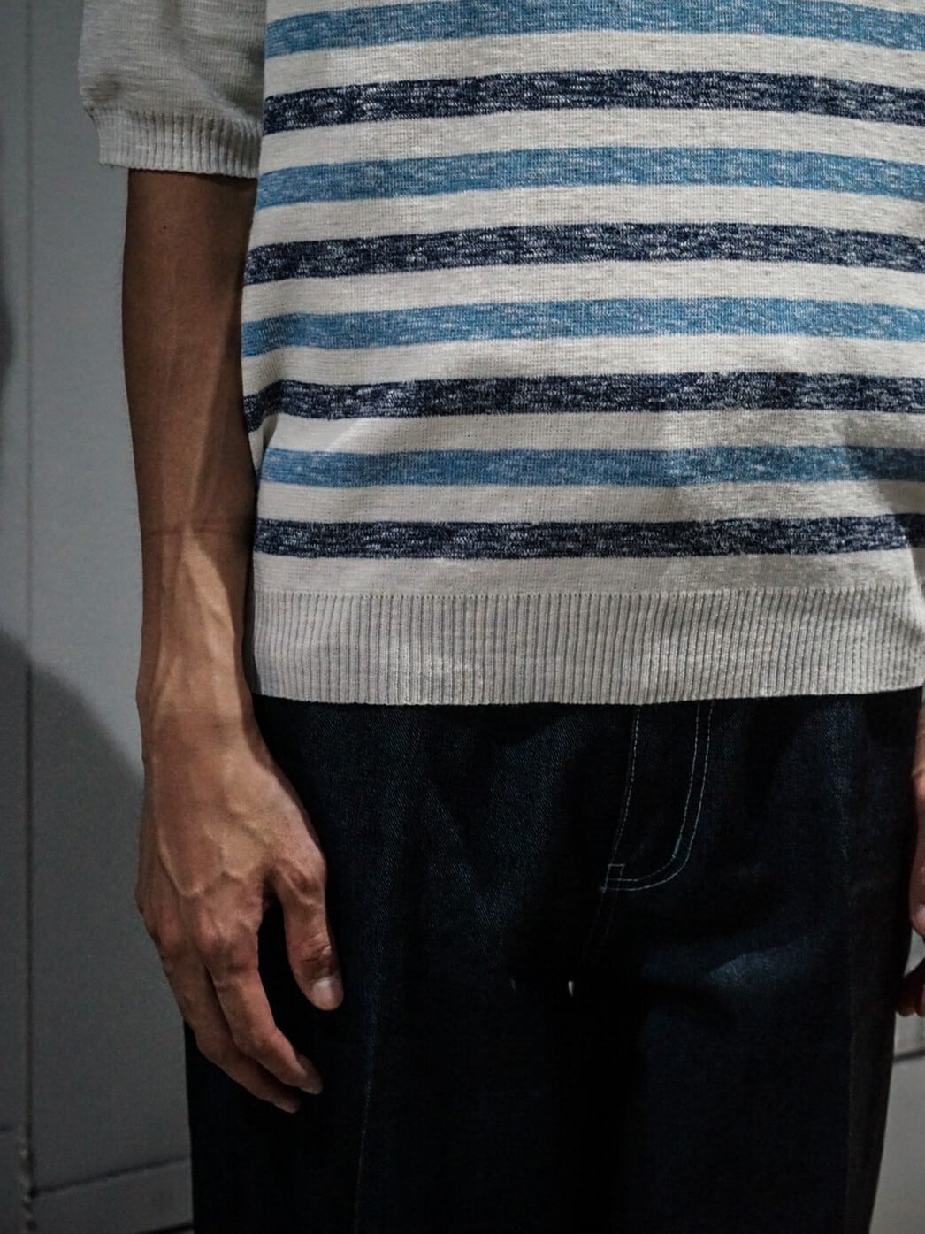 気品のあるホワイトベースのボディに、ネイビーとライトブルーの同系色でボーダーを配した半袖ニットポロシャツ。この爽やかカラーリング今の季節にはピッタリですね。