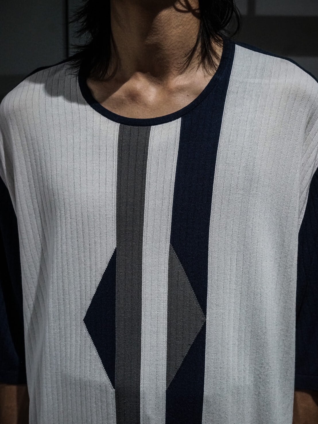 ビスコースとコットンを混紡した滑らかなボディに、ジオメトリックなデザインを載せたニットTシャツ。