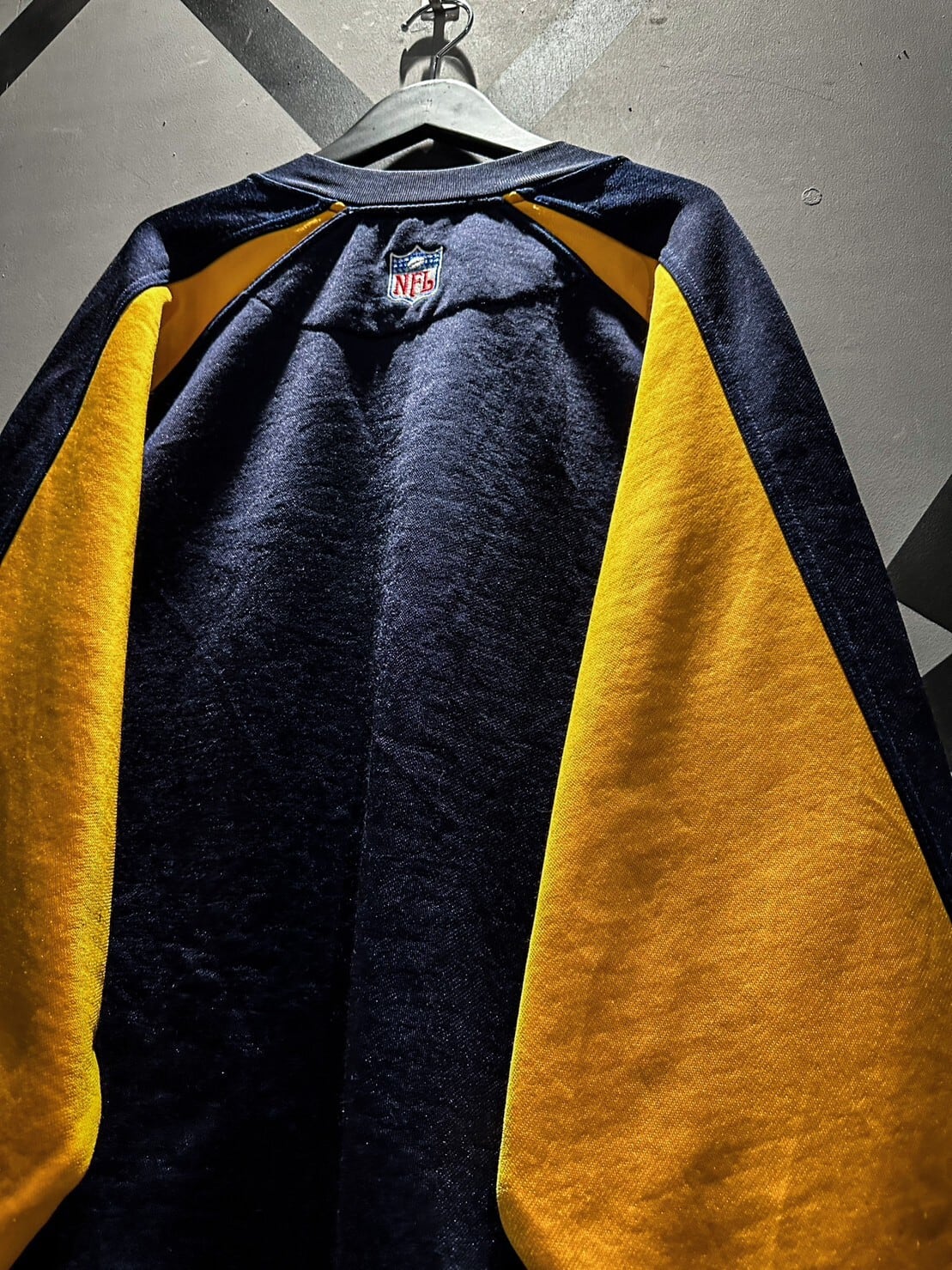 深いネイビーのボディに、CHARGERSらしいイエロー×ホワイトのライン切り替えを載せフロントに大きくチーム名のデザインを施したフットボールシャツ。