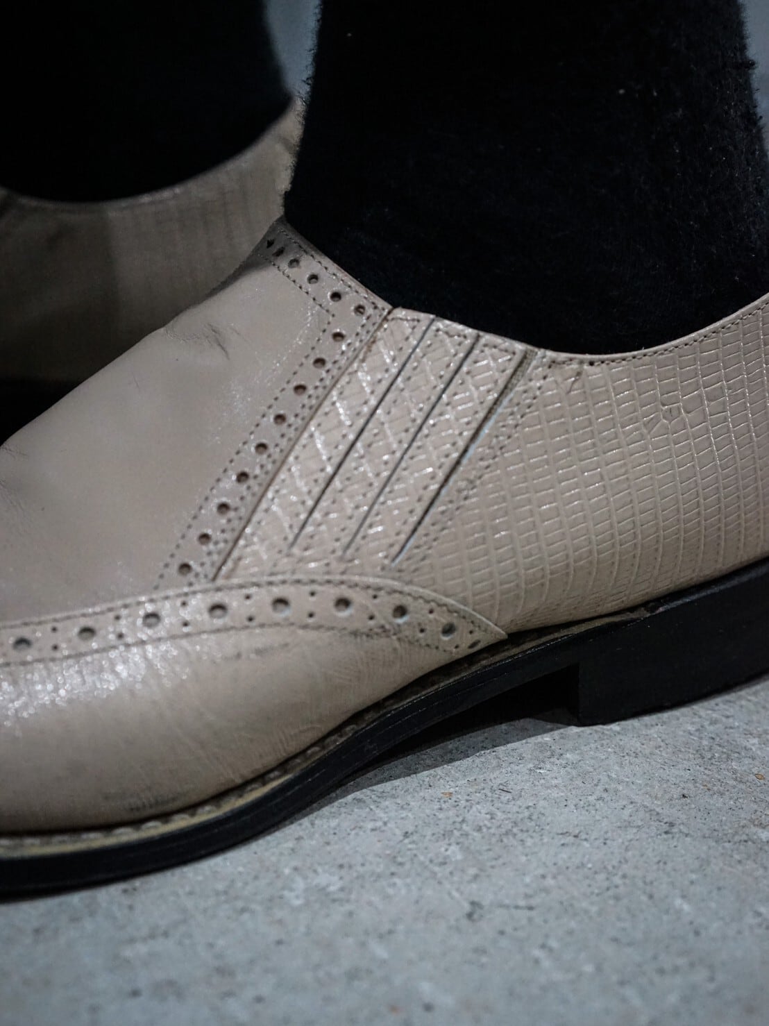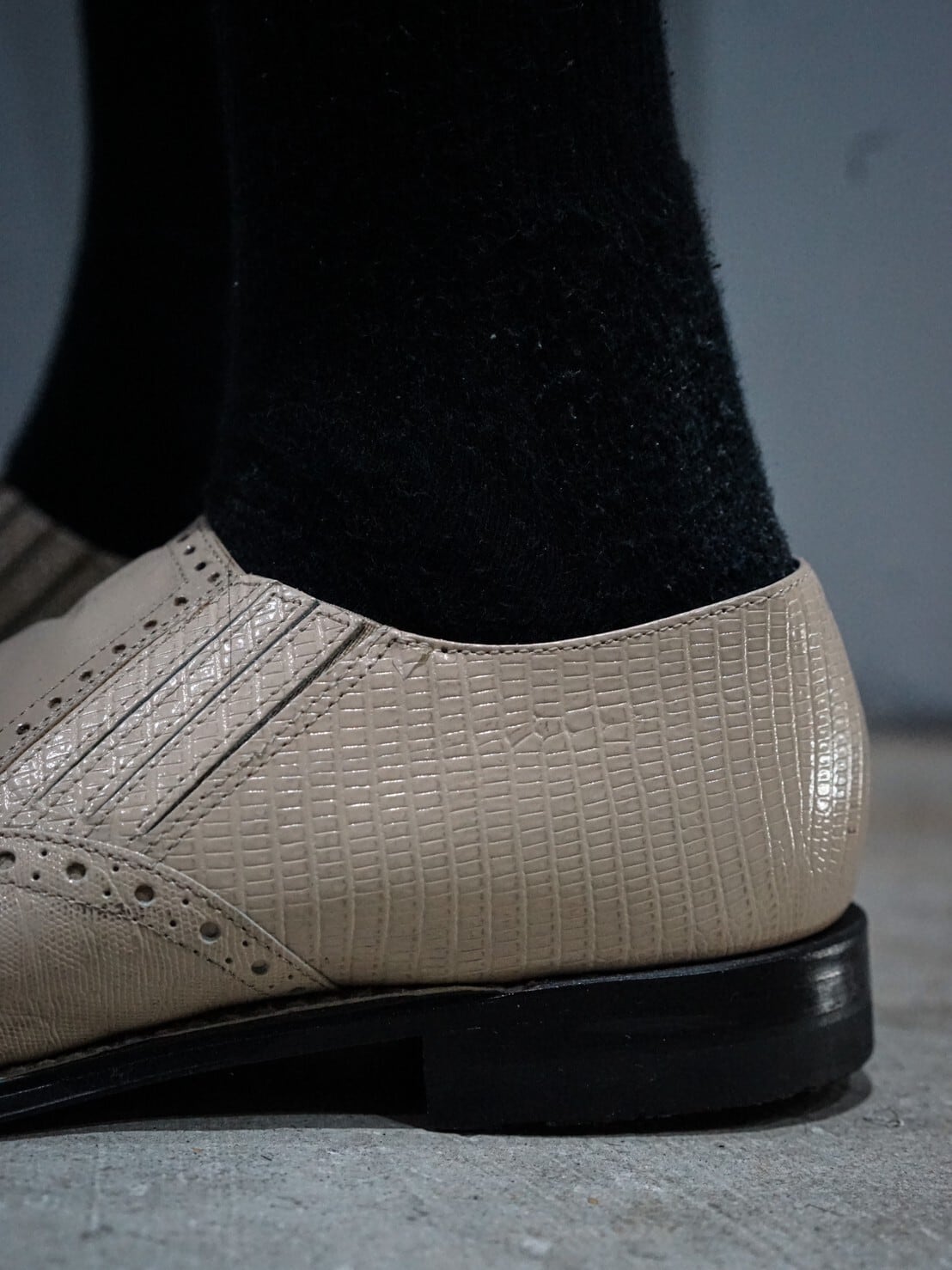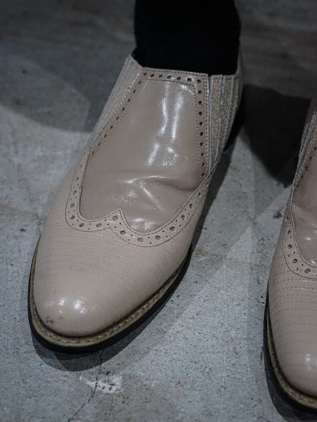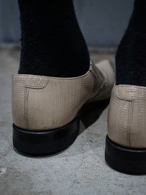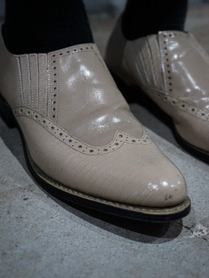 エレガントさ溢れる稀有なベージュカラーのレザーにてまとめ上げられたウイングチップ型のローファー。