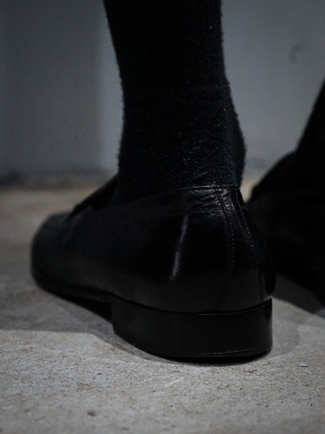 鈍い光沢を帯びた上質なブラックレザーを使用したローファー。高いレザーの質に細かな縫製、細身のベルトデザイン、計算された美しいフォルムによってエレガントな仕上がりとなった逸品。