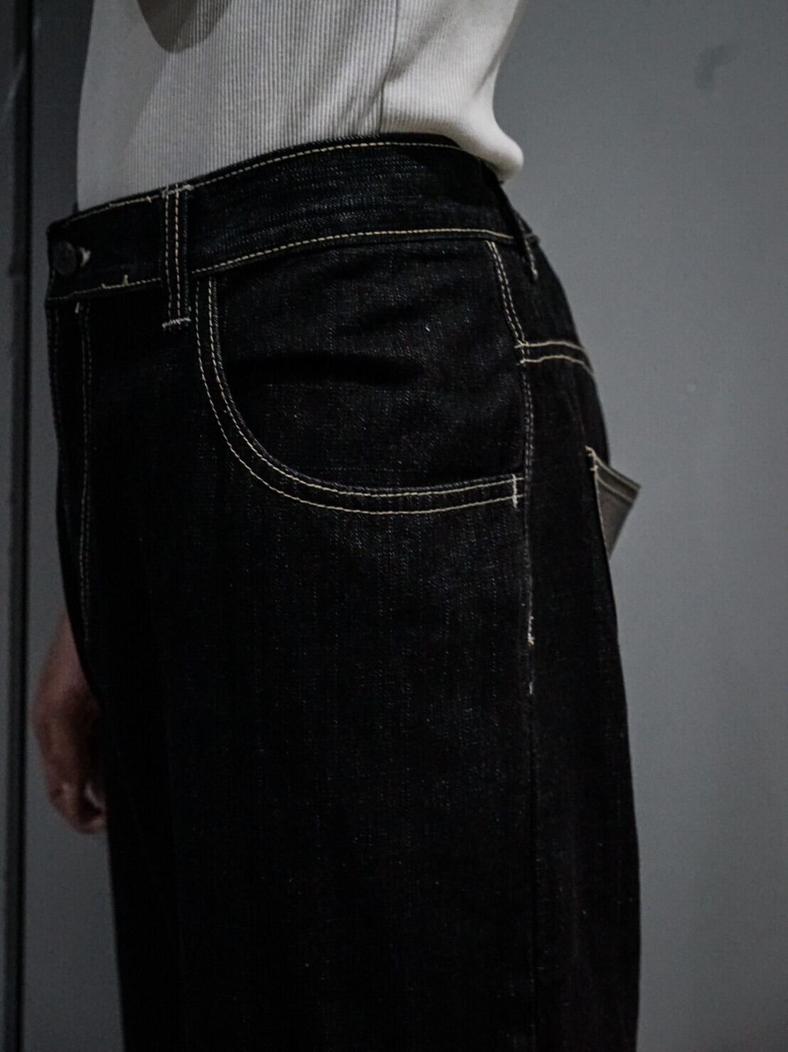 ダメージやスレ感が見受けられない状態良好なブラックデニムをベースとし、背面のポケットにはブラックの光沢を放つフェイクレザーを切り替えしたバギーデニムパンツ。