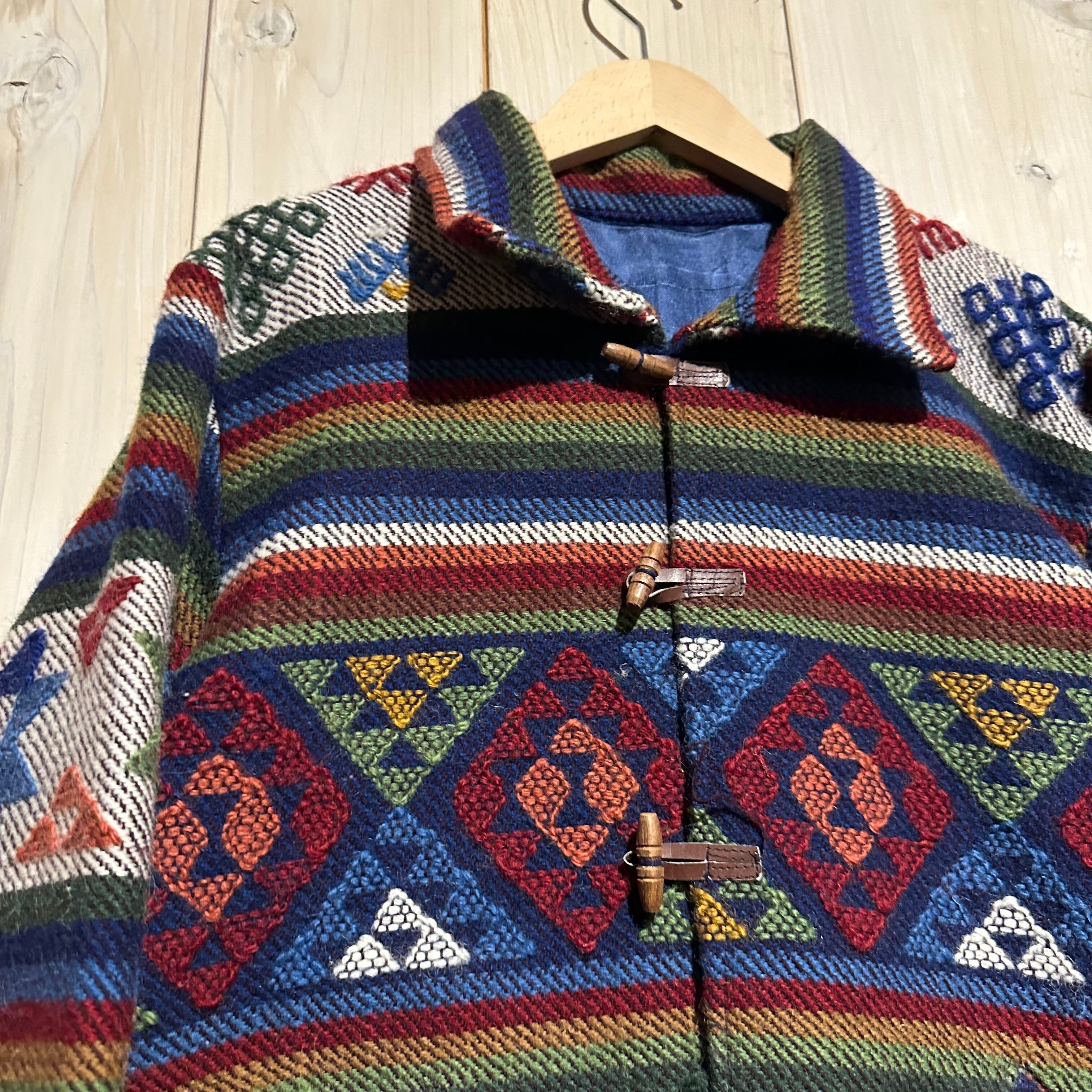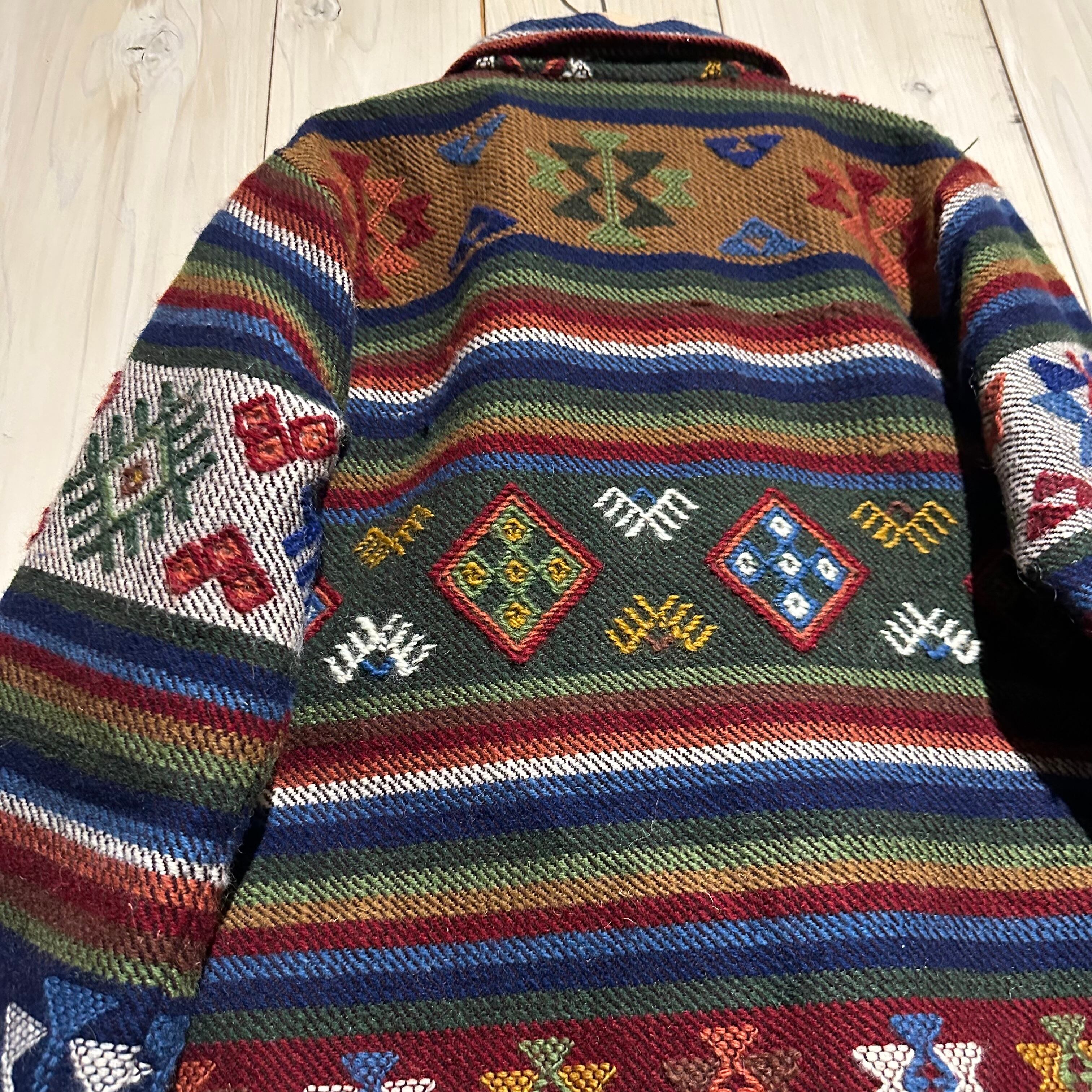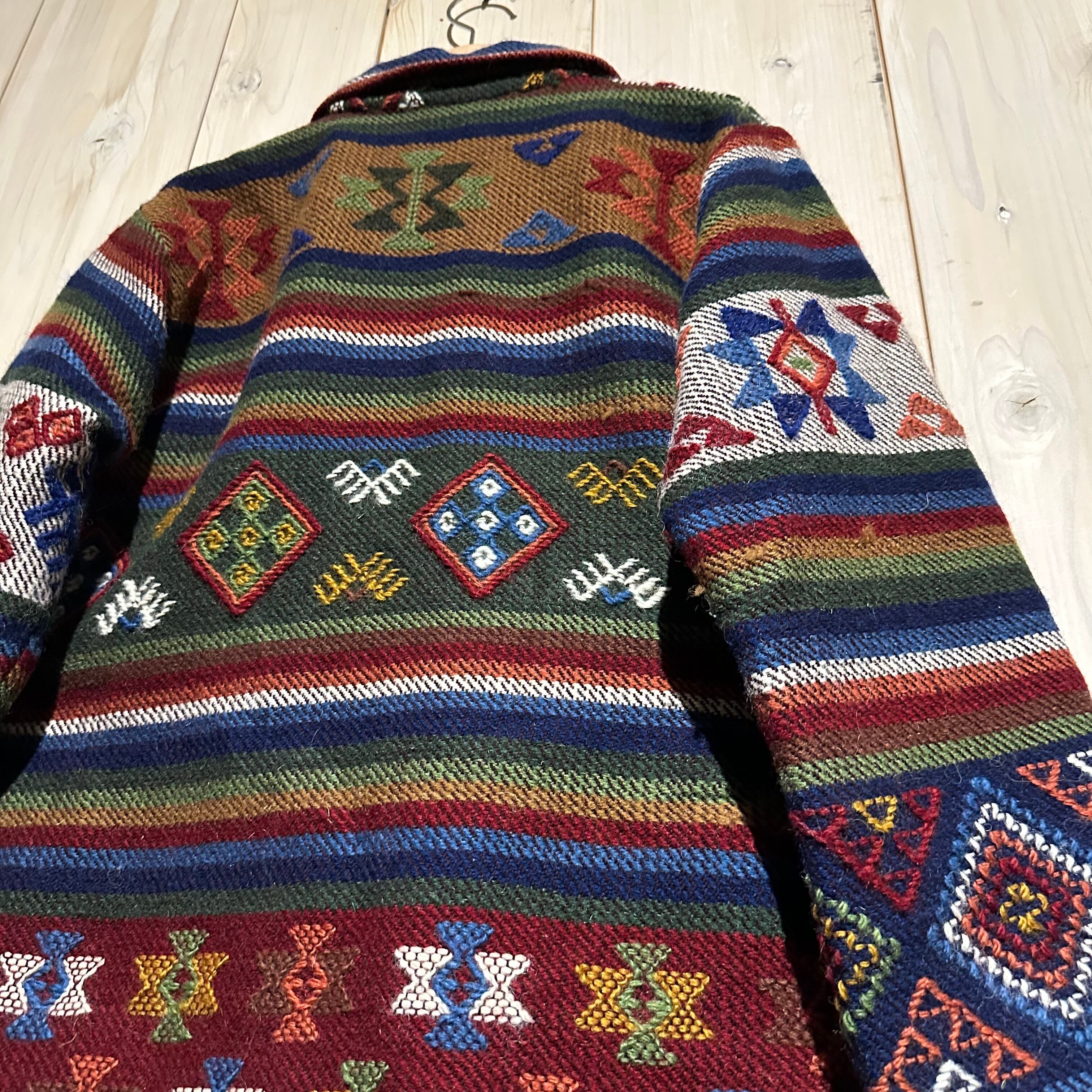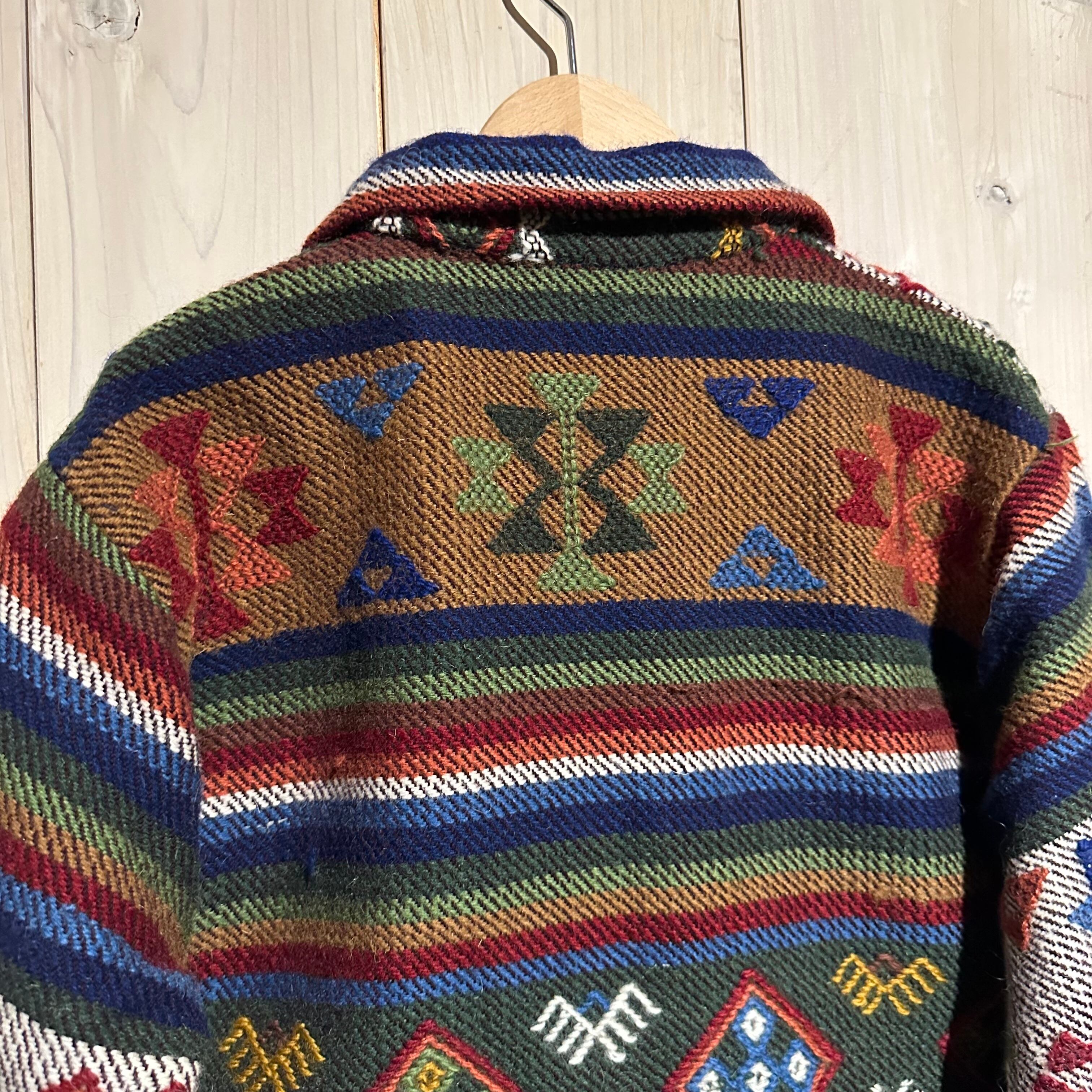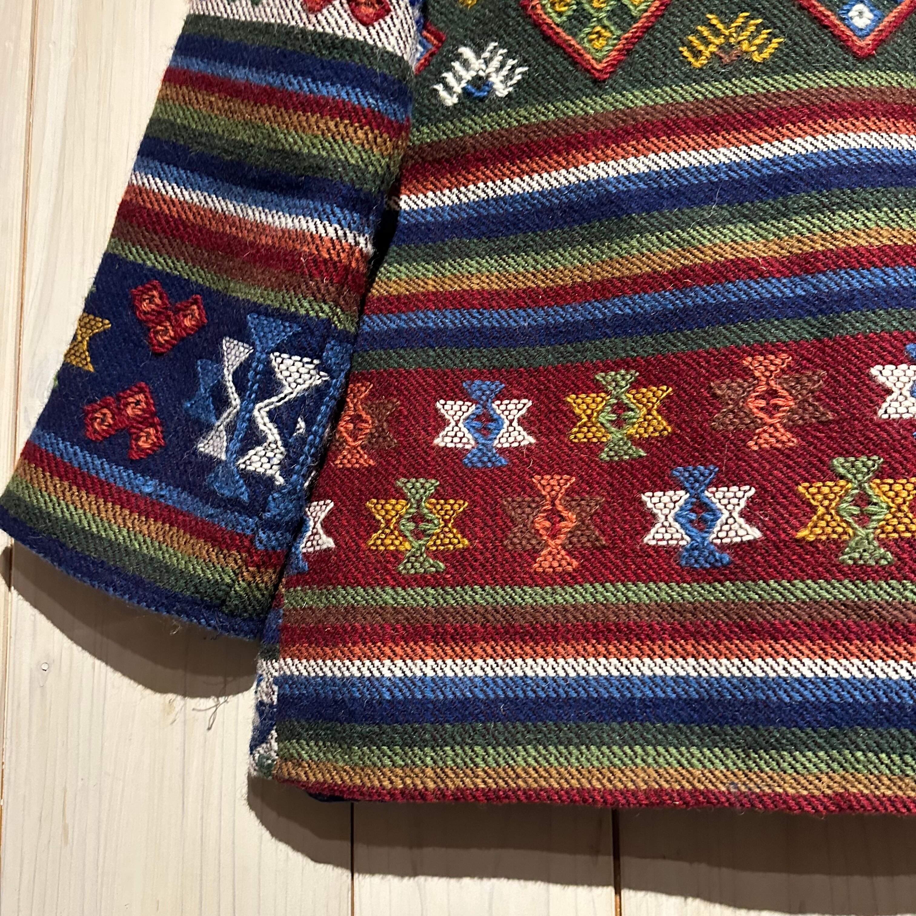 赤x青x緑x黄などのマルチなカラーリングで全体にエスニック調の柄を載せ、美しい色使いが際立つ襟付きジャケット。