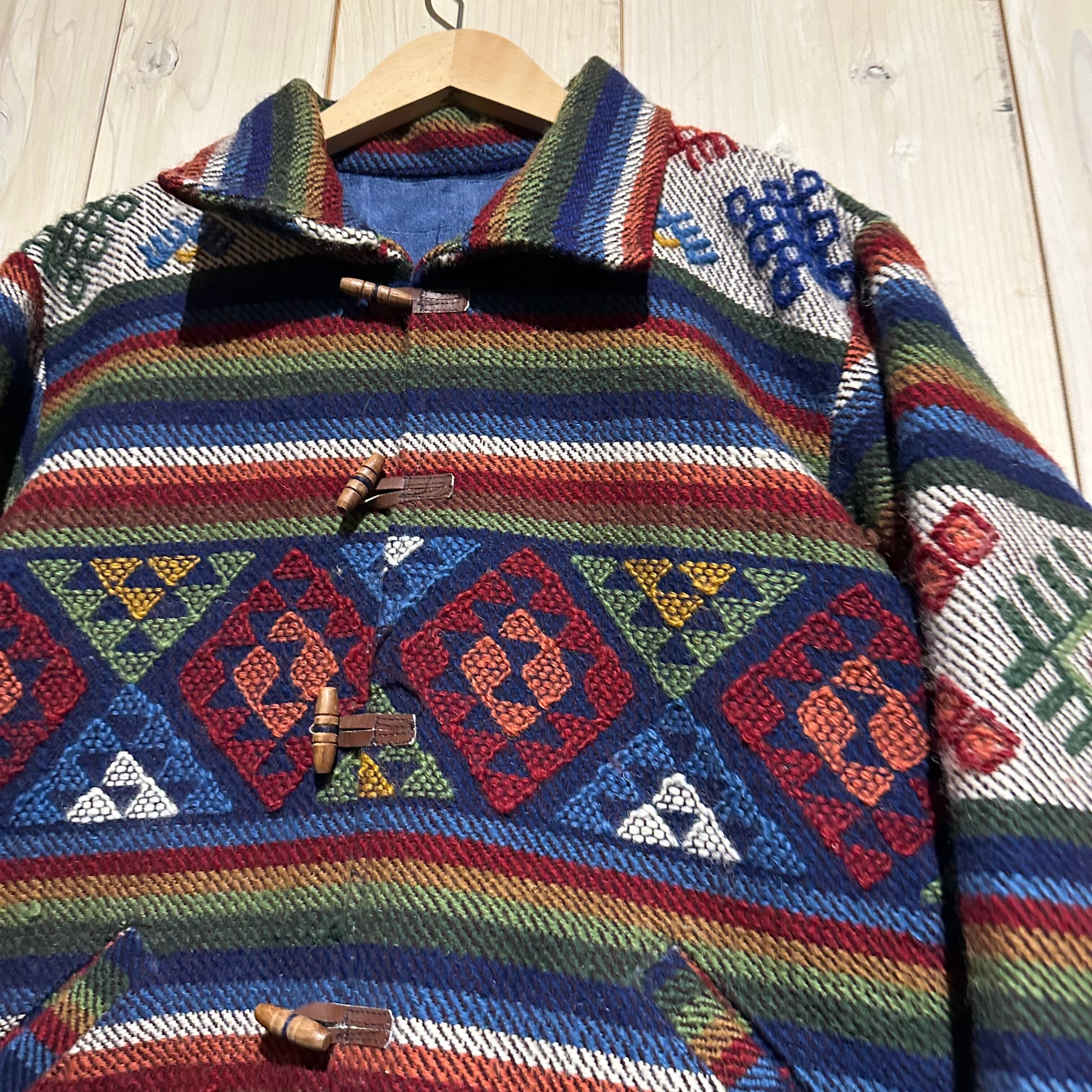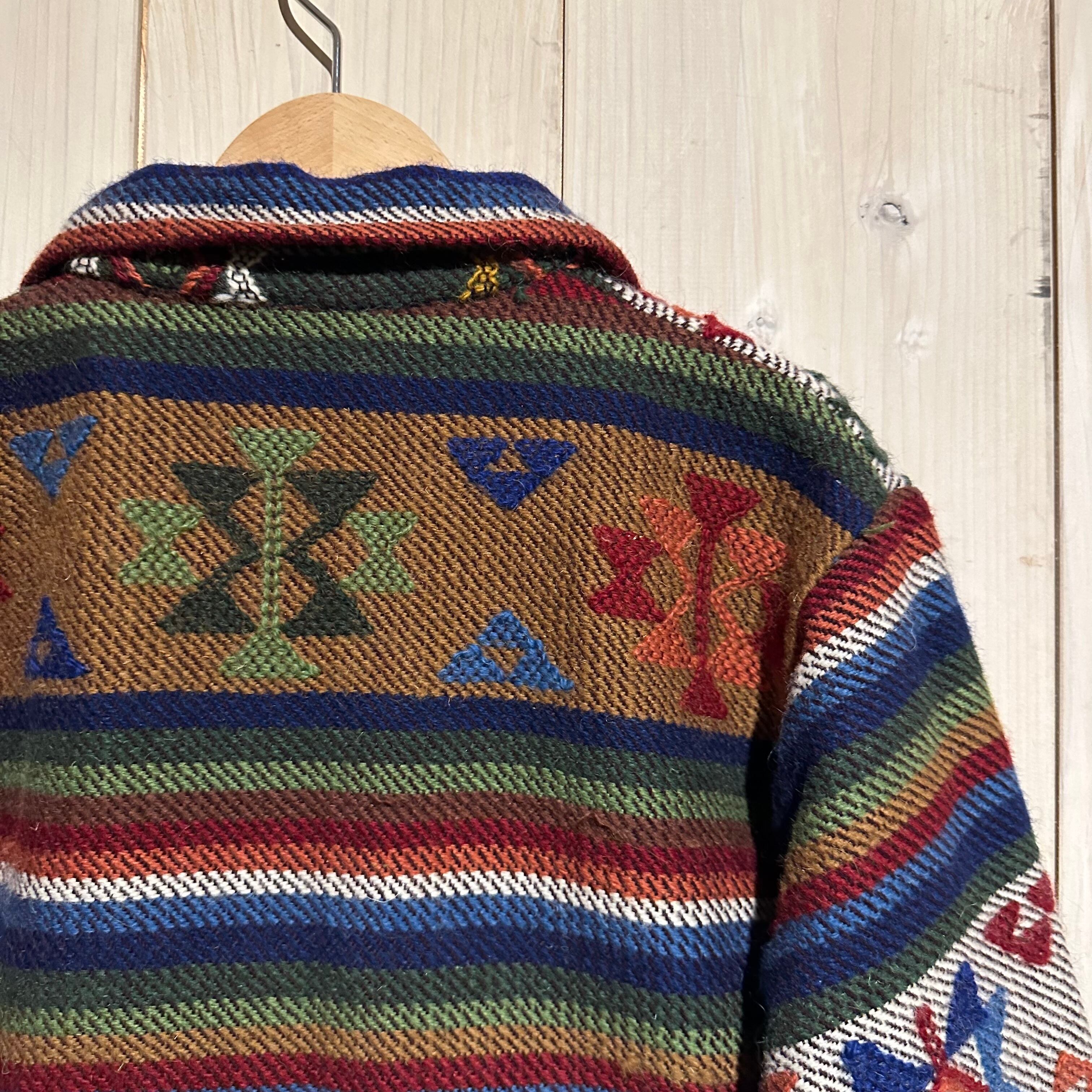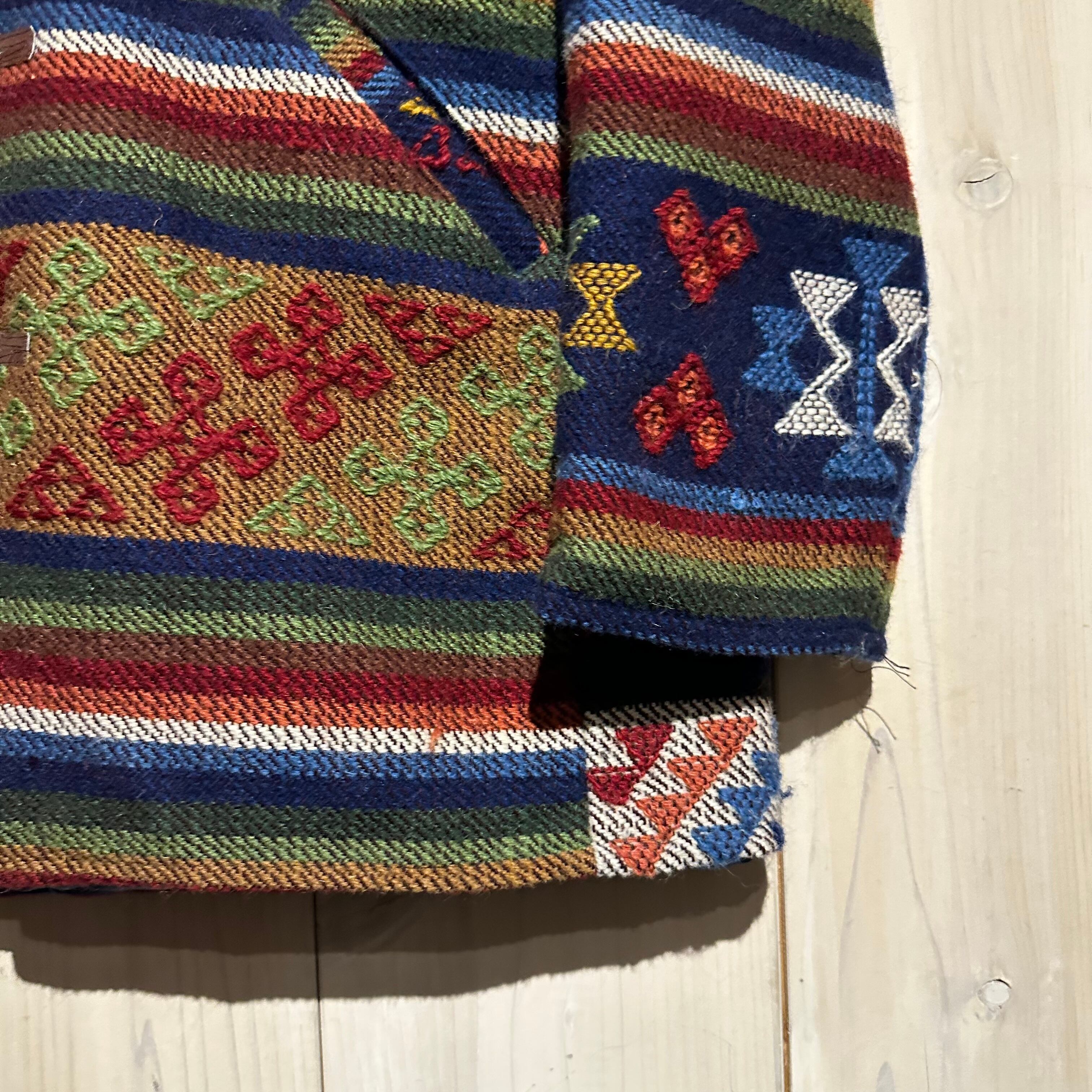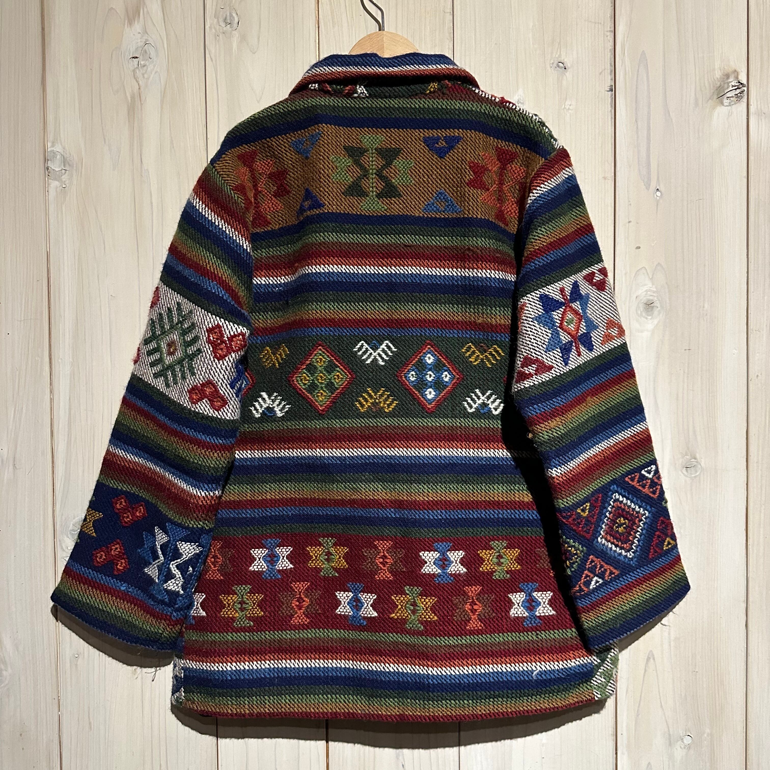 赤x青x緑x黄などのマルチなカラーリングで全体にエスニック調の柄を載せ、美しい色使いが際立つ襟付きジャケット。
