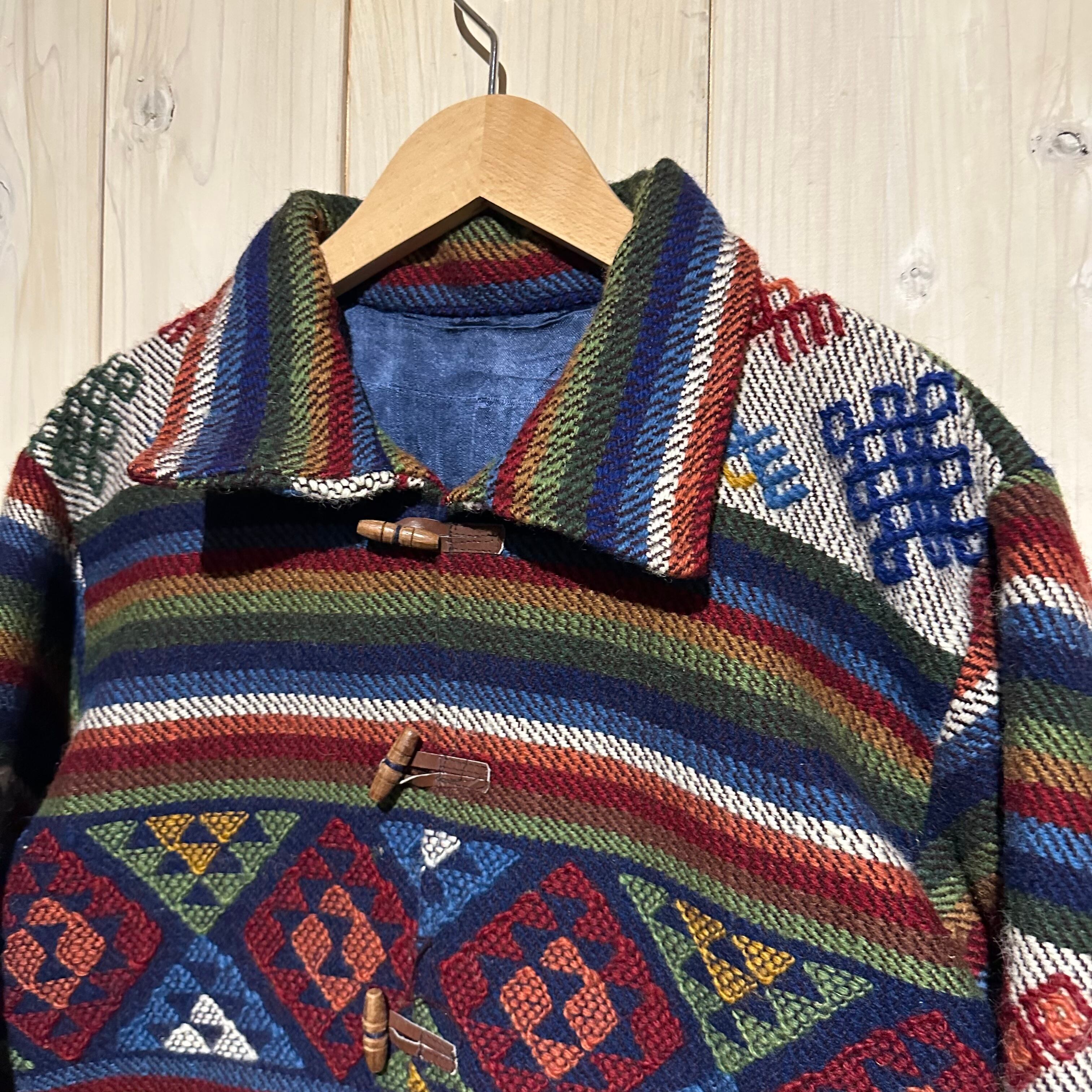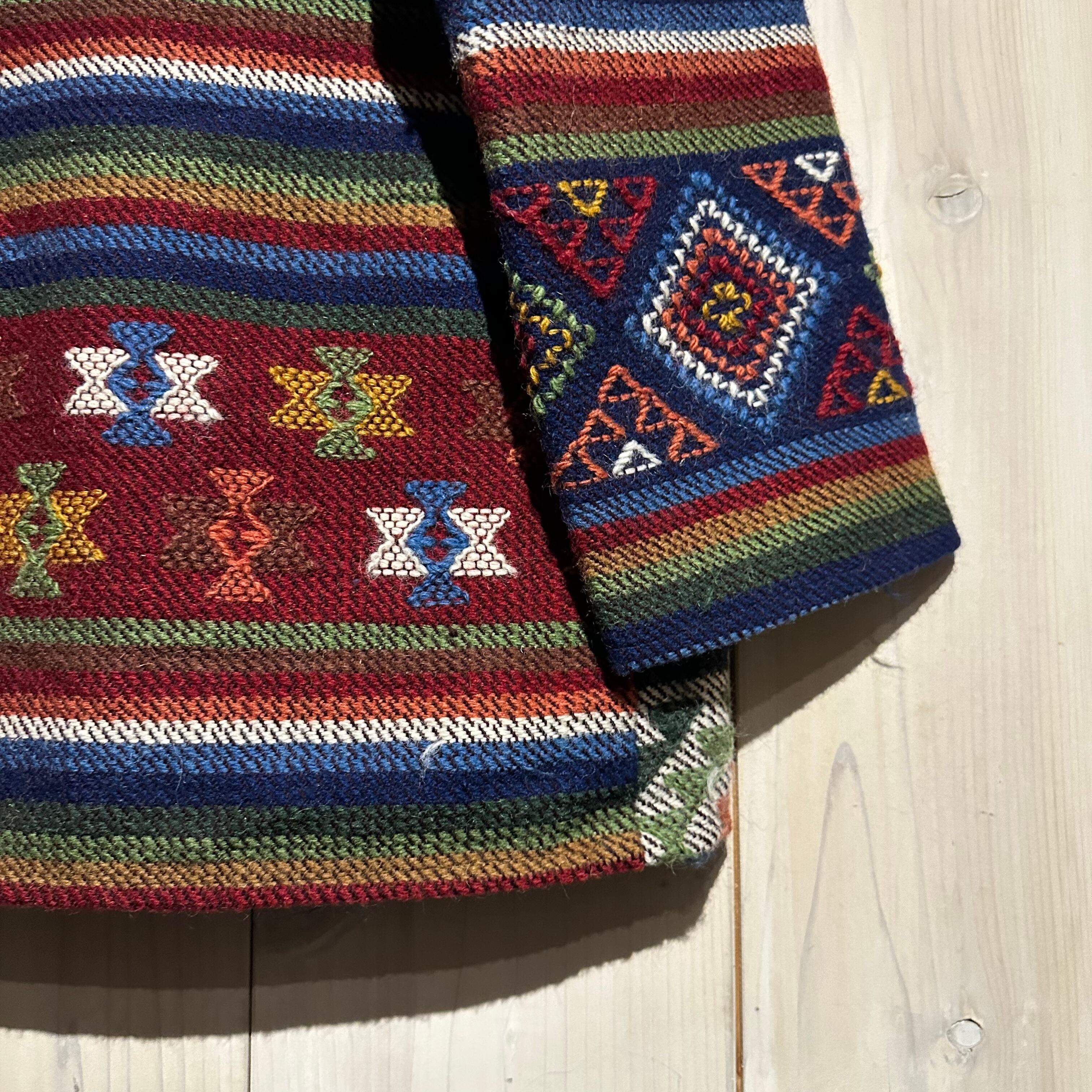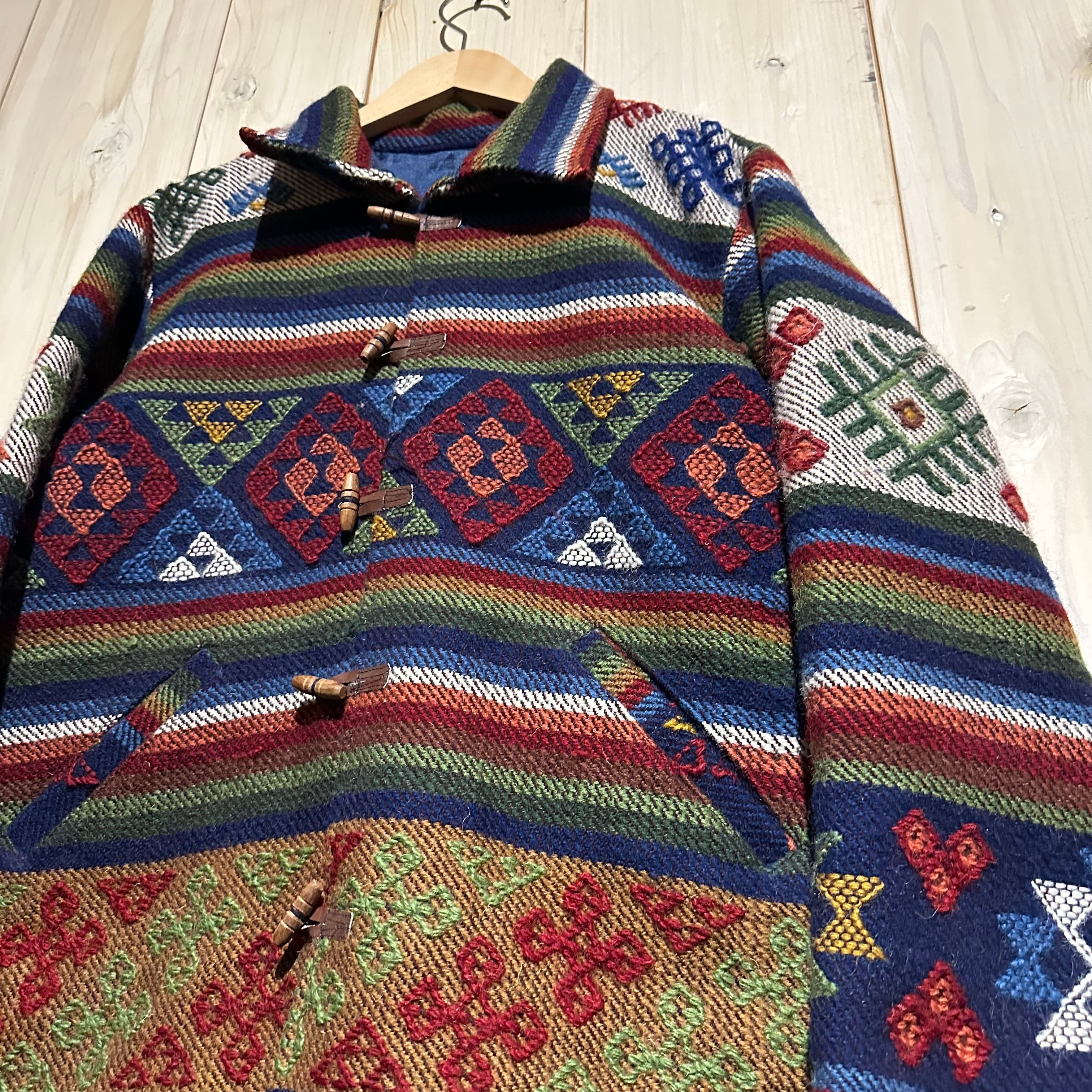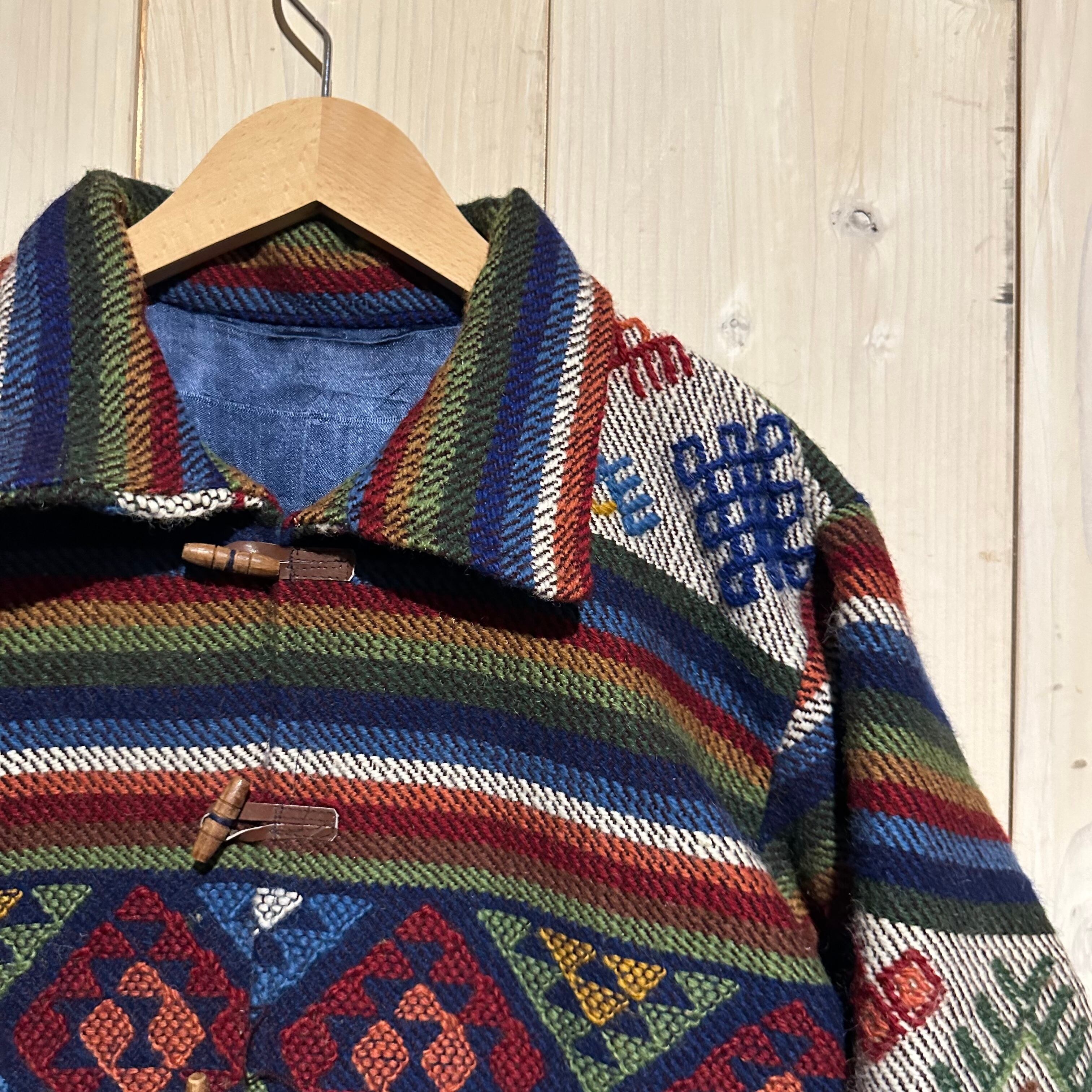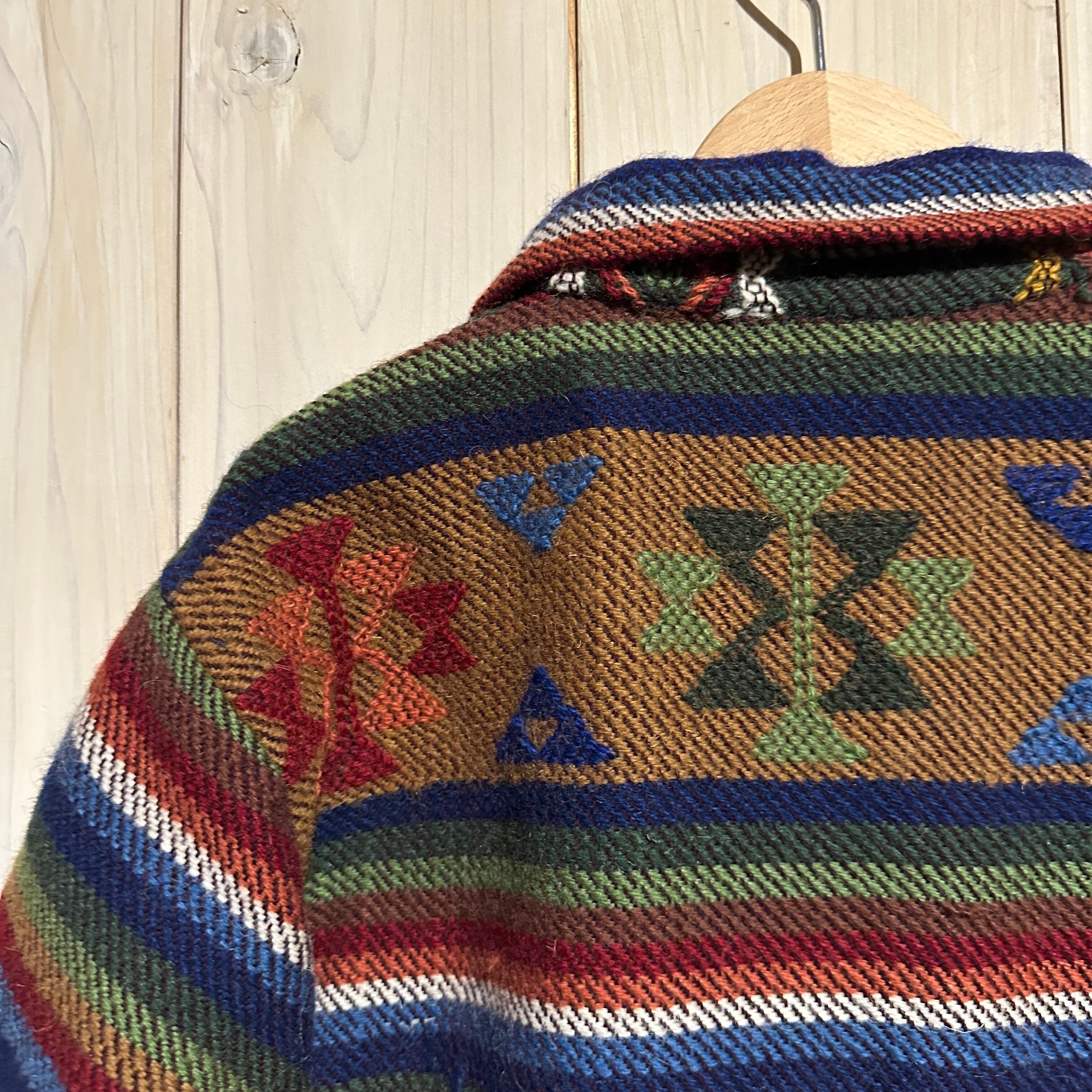 赤x青x緑x黄などのマルチなカラーリングで全体にエスニック調の柄を載せ、美しい色使いが際立つ襟付きジャケット。