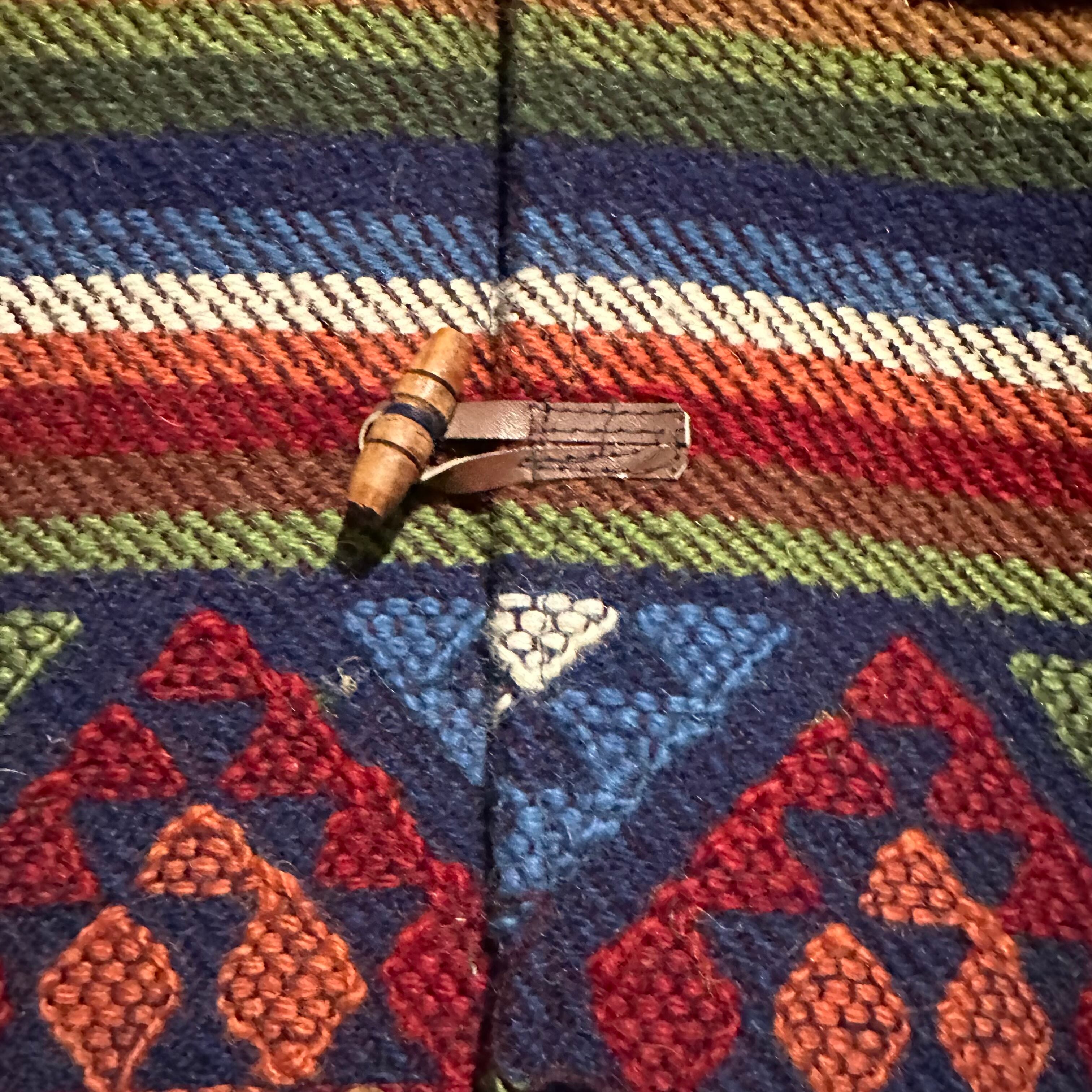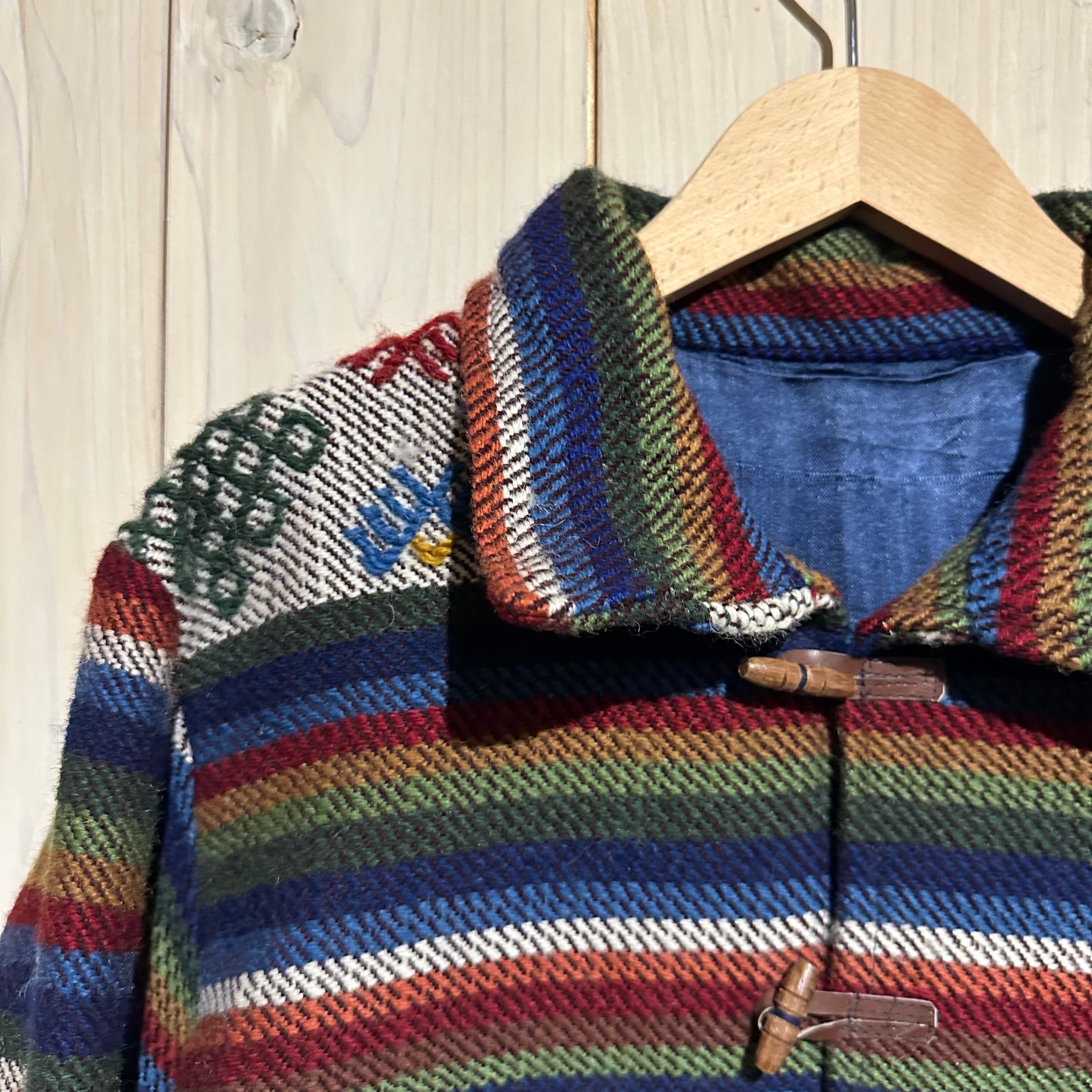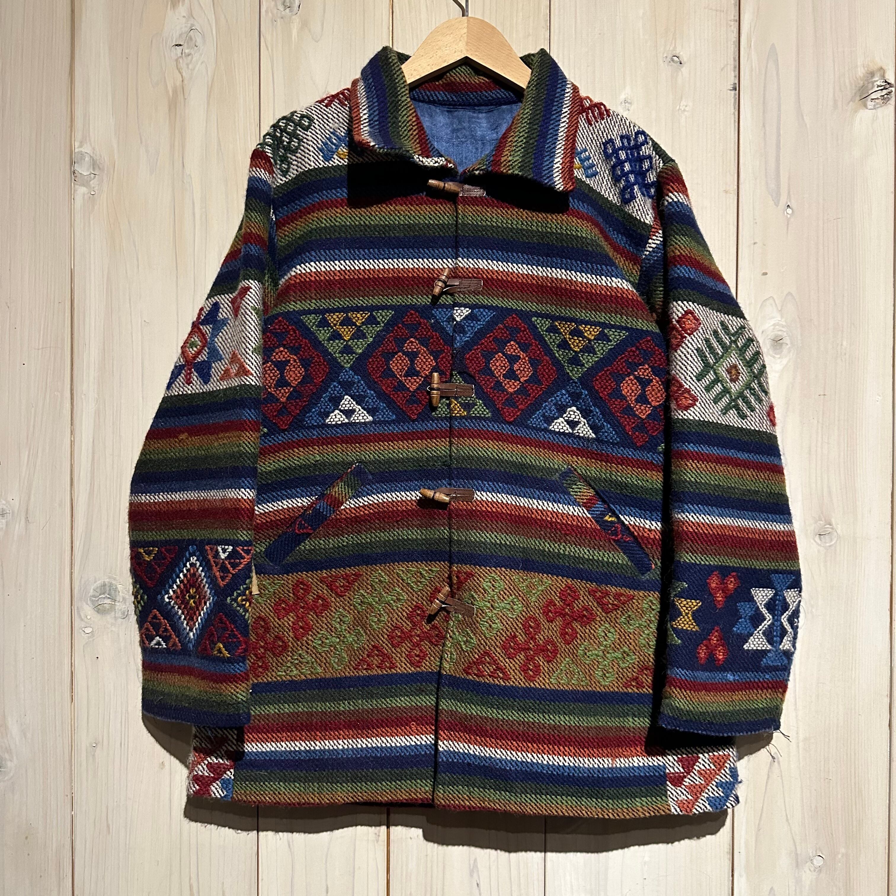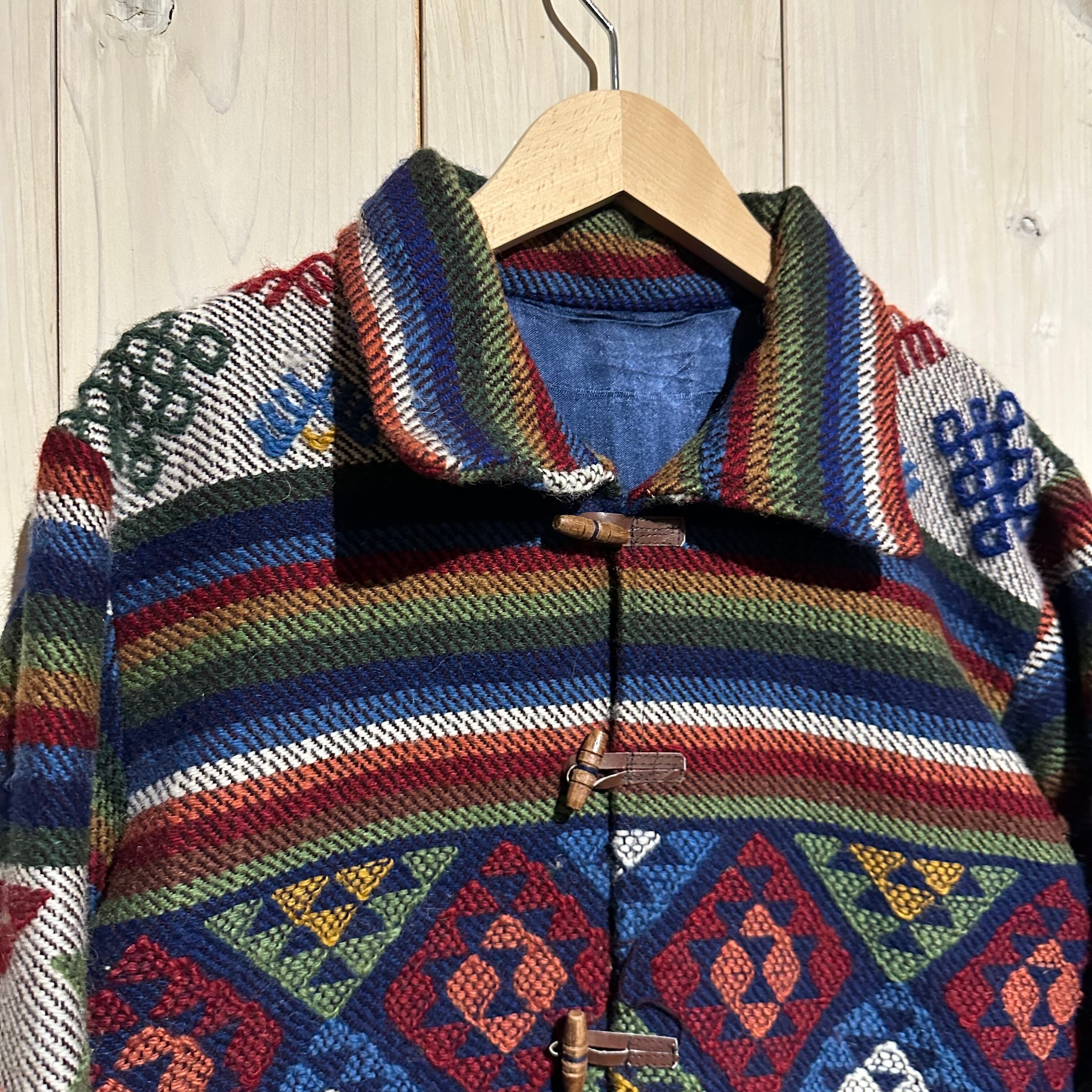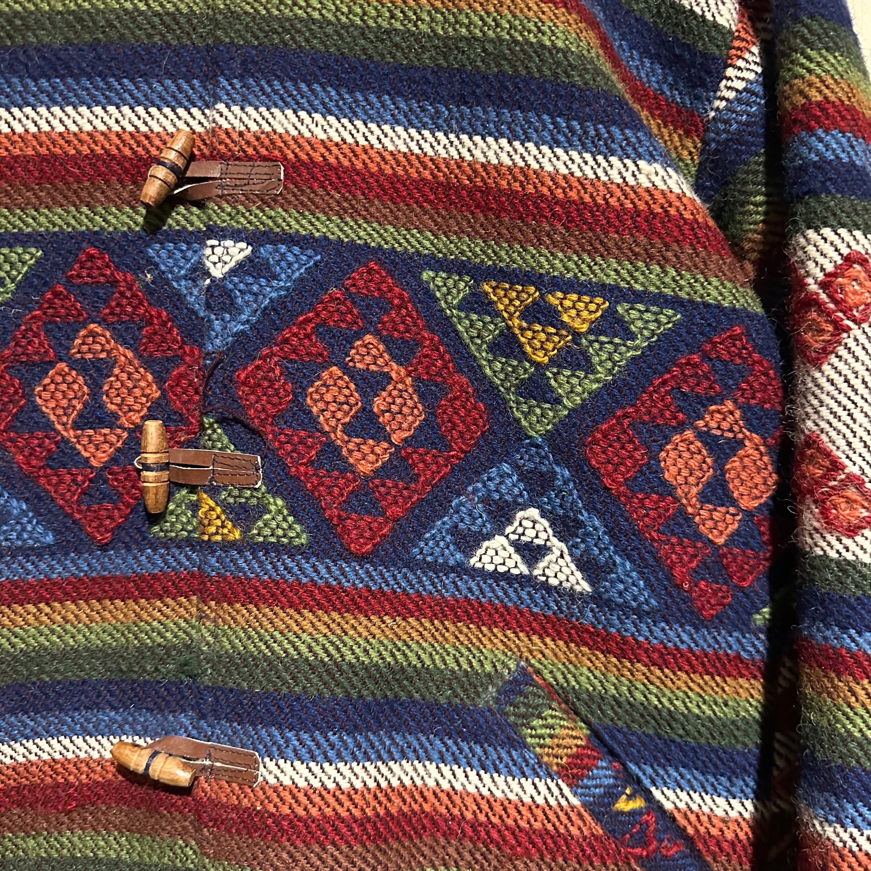赤x青x緑x黄などのマルチなカラーリングで全体にエスニック調の柄を載せ、美しい色使いが際立つ襟付きジャケット。