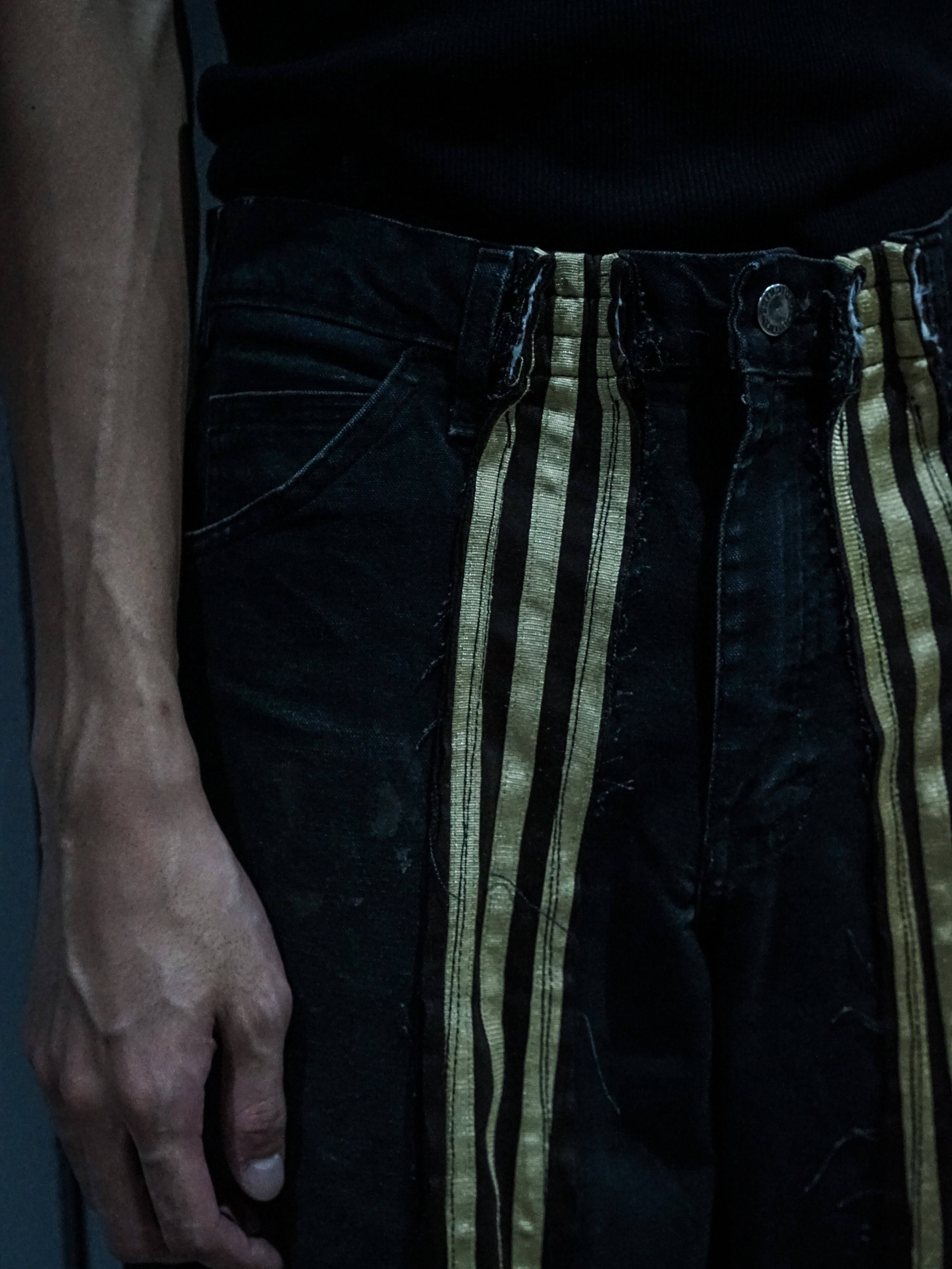 デニムの墨黒、トラック生地のブラウンベース、ゴールドの3本ラインといった美しいカラーバランスに加え、若干ボロ感があるデニムの粗さが絶妙なデザインバランスを生み出しております。