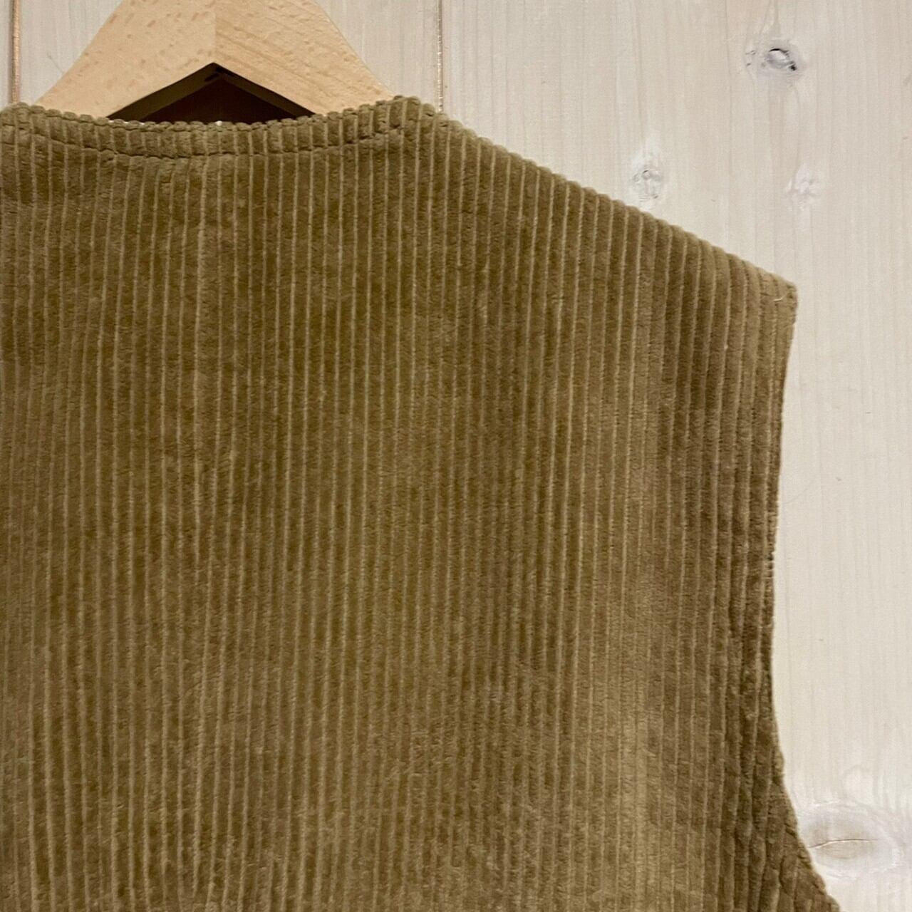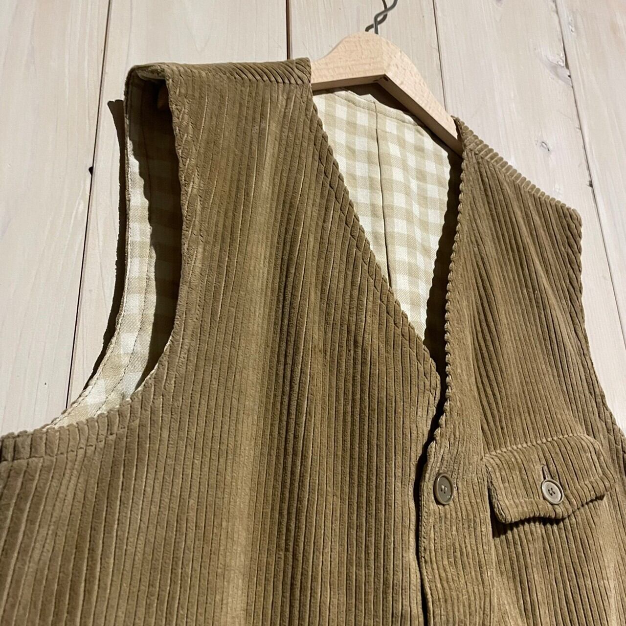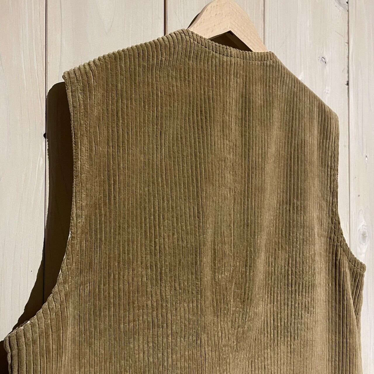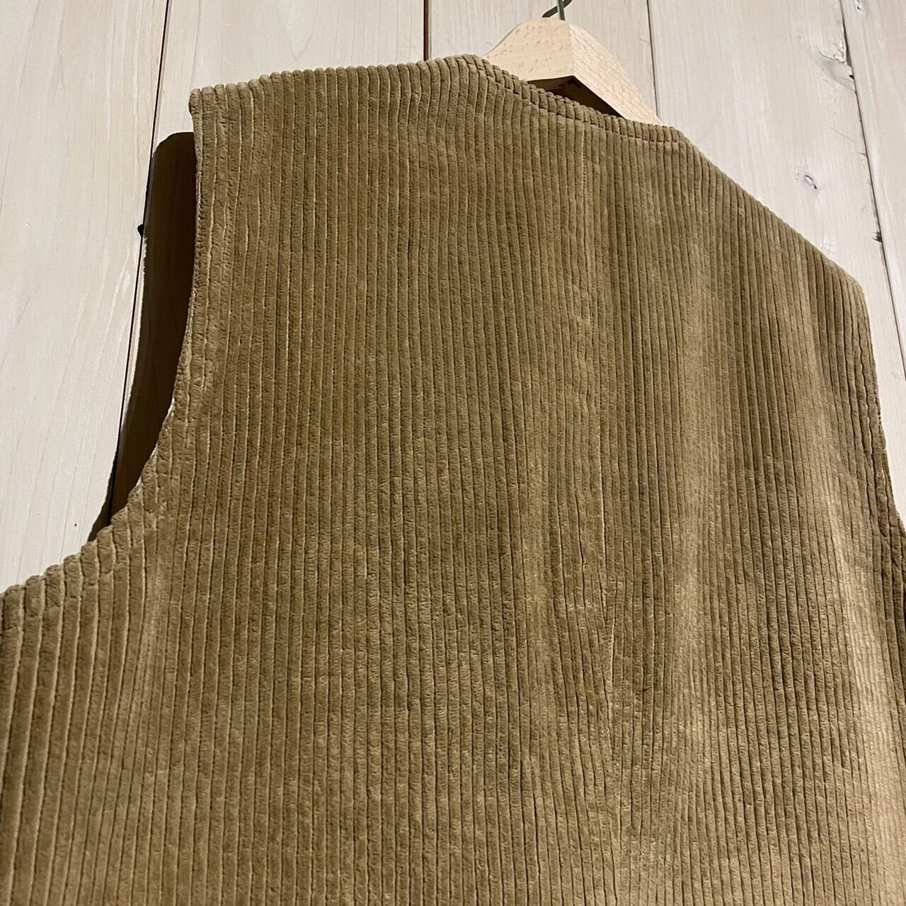 柔らかなベージュカラーの太畝コーデュロイをボディに使用したベスト。